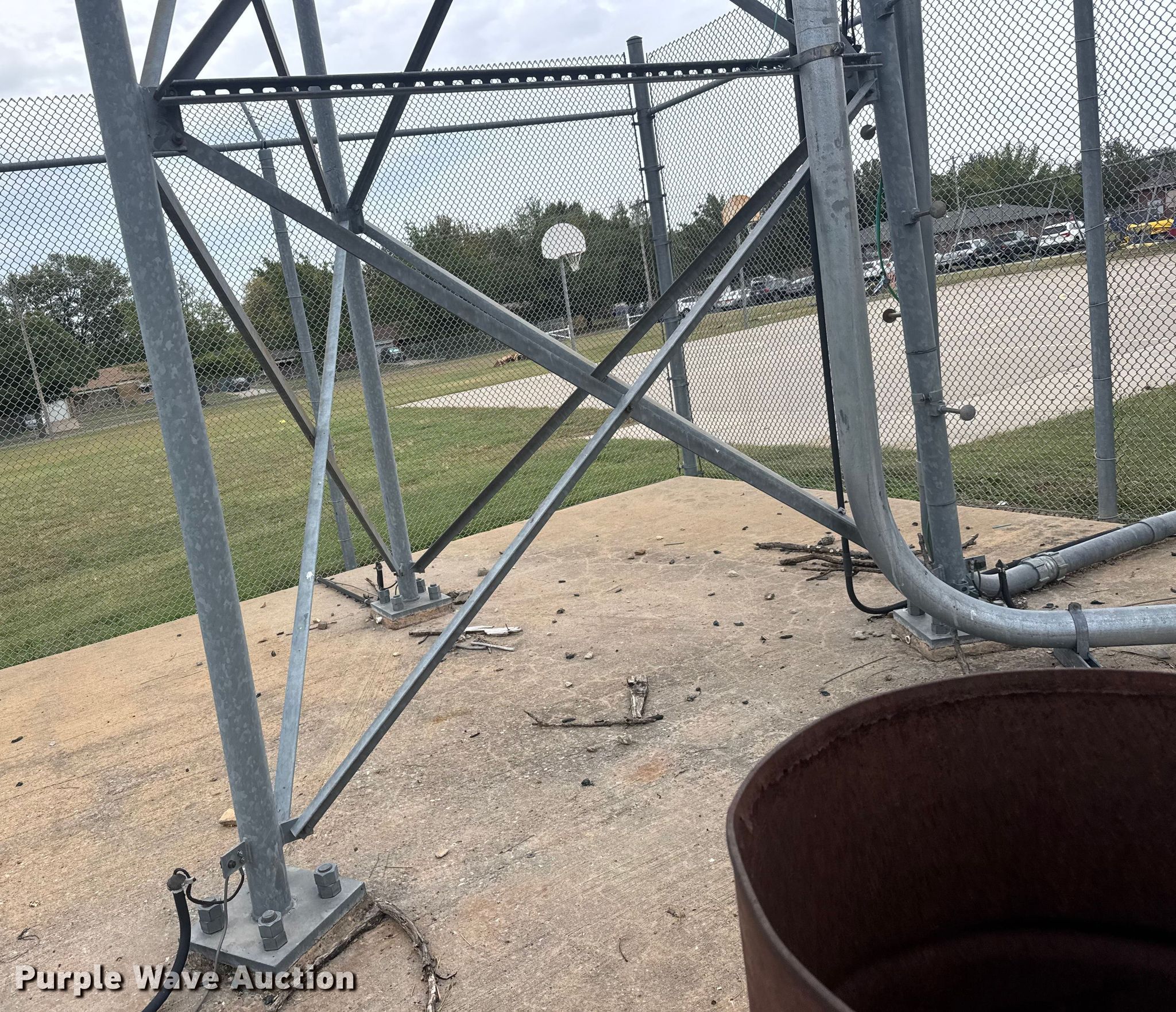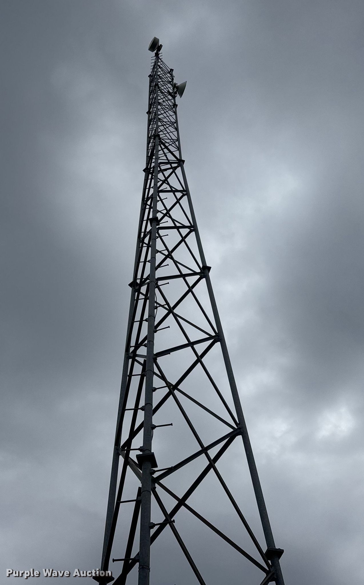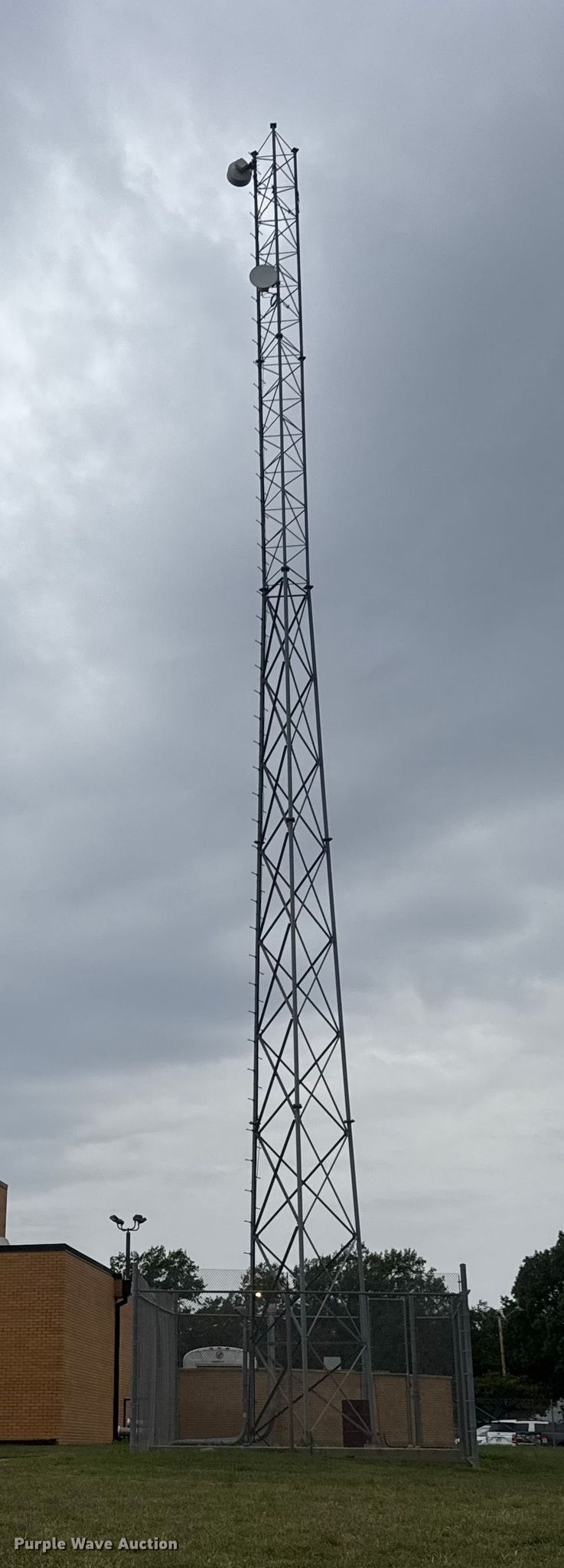Radio tower. Anti-sway, Approximately height: 75', Chain link fence included. Disassembly and removal is the sole responsibility of the purchaser. Purchaser must provide proof of a one million dollar liability insurance policy prior to removal. Waiver at time of removal must be signed by all persons. Wichita, KS 67207