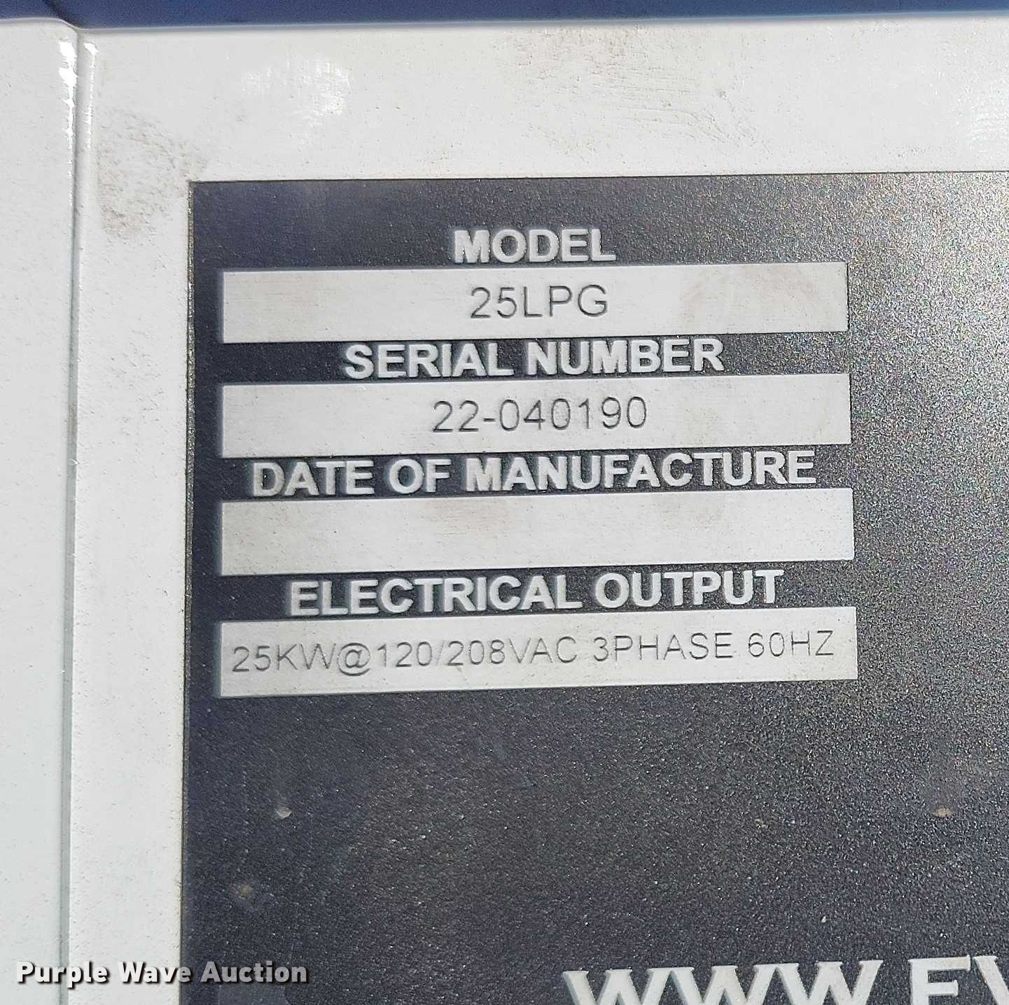 2022 Evergreen Mobile Power Juice Box 25LPG generator. Hours: 52 on meter, Serial: 22-040190. Engine Briggs & Stratton Vanguard, Displacement: 993 cc, Cylinders: 2, Fuel type: LPG LP bottle: Included. Features Generator Linz, kVA: 26, kW: 25, Phase: Three, Electric start. Trailer 11' L x 72" W, Ball hitch size: 2", Suspension: Torsion, Brakes: Electric, Axles: Single, Tire size: 225/75R15. Notes Jump start required during on-site data collection. This is worksite support equipment and will not come with a title. Transfer of ownership documentation will be a bill of sale. Wheeler Cat Rental. Tooele, UT 84074