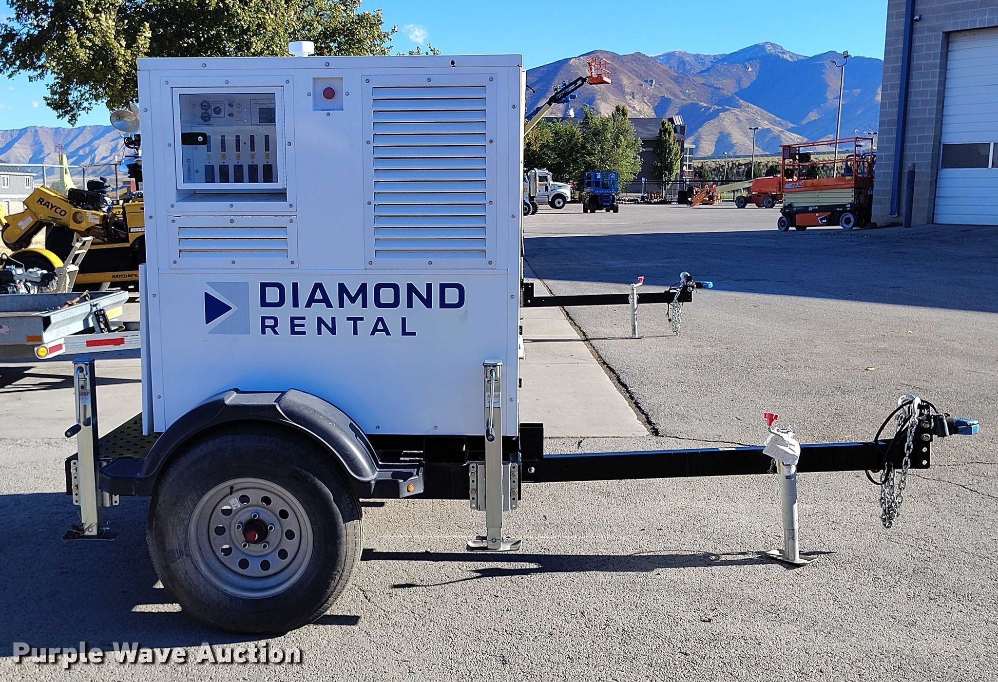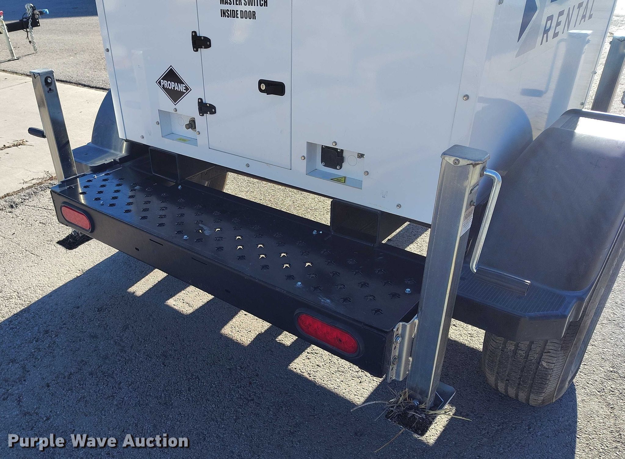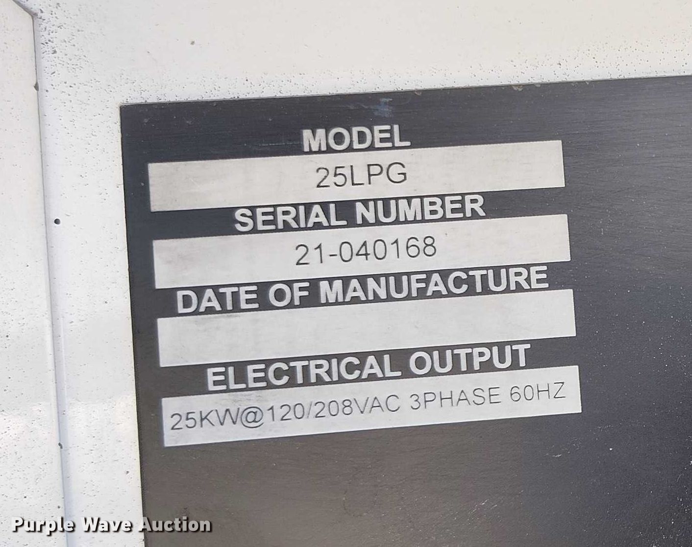 2021 Evergreen Mobile Power Juice Box 25LPG generator. Hours: 155 on meter, Serial: 21-040168. Engine Briggs & Stratton, Cylinders: 2, Fuel type: LPG LP bottle: Included. Features Generator Linz, kVA: 26, kW: 25, Phase: Three, Electric start. Trailer 11' L x 72" W, Ball hitch size: 2", Suspension: Torsion, Brakes: Electric, Axles: Single, Tire size: 225/75R15. Notes Jump start required during on-site data collection. This is worksite support equipment and will not come with a title. Transfer of ownership documentation will be a bill of sale. Wheeler Cat Rental. Tooele, UT 84074