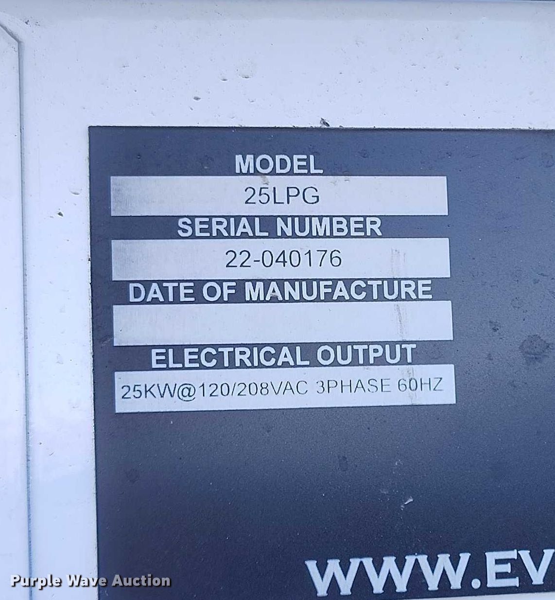 2022 Evergreen Mobile Power Juice Box 25LPG generator. Hours: 578 on meter, Serial: 22-040176. Engine Briggs & Stratton Vanguard, Cylinders: 2, Fuel type: LPG LP bottle: Included. Features Generator Linz, kVA: 26, kW: 25, Electric start. Trailer 11' L x 72" W, Ball hitch size: 2", Suspension: Torsion, Brakes: Electric, Axles: Single, Tire size: 225/75R15. Notes Jump start required during on-site data collection. This is worksite support equipment and will not come with a title. Transfer of ownership documentation will be a bill of sale. Wheeler Cat Rental. Tooele, UT 84074