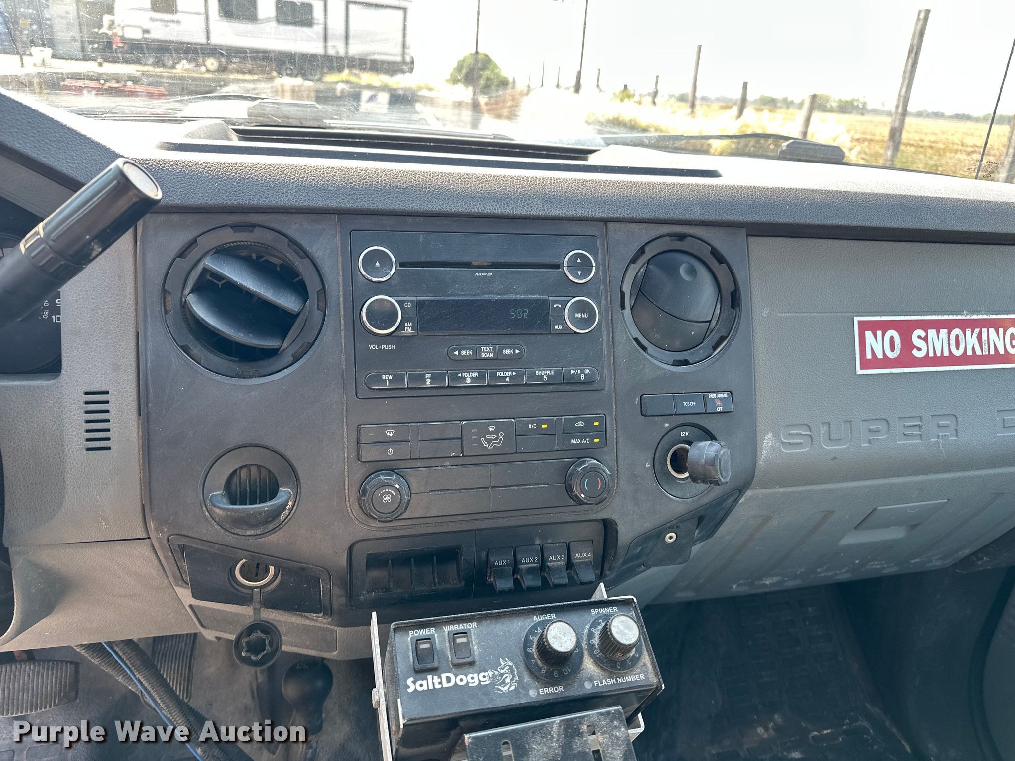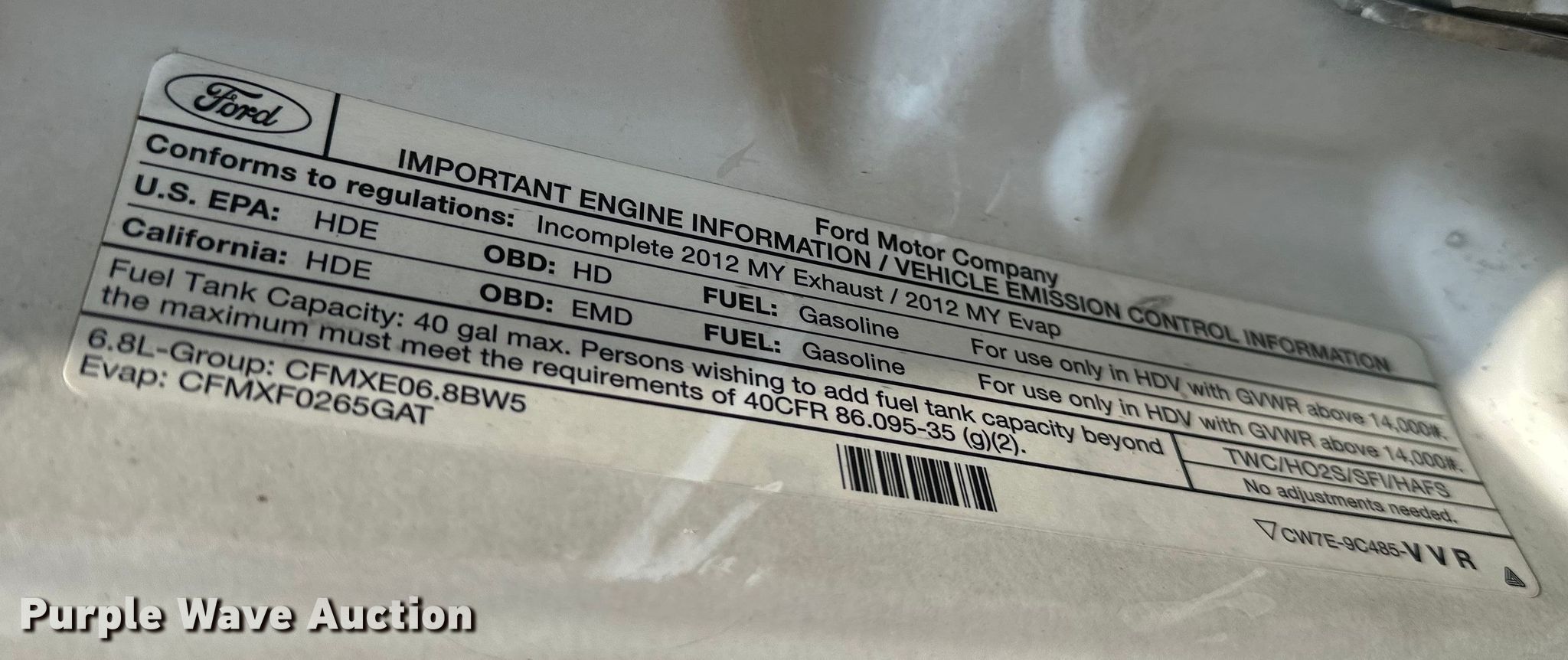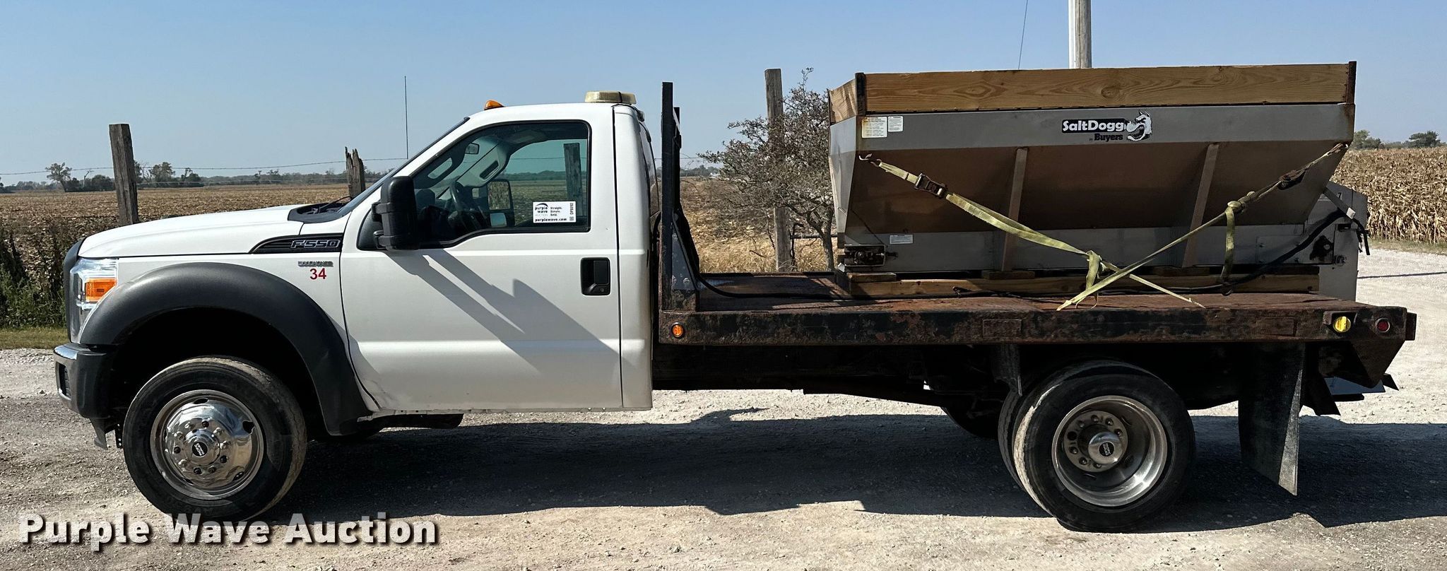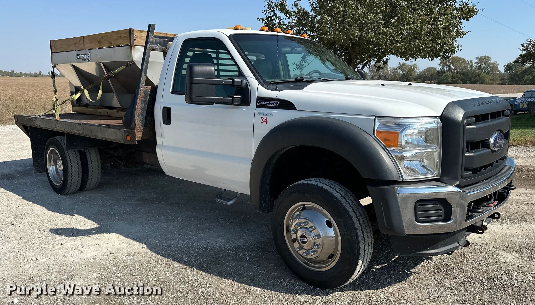 2012 Ford F550 flatbed truck. Miles: 149,312 on odometer, VIN: 1FDUF5HY1CEB44859. Engine Displacement: 6.8L, Cylinders: 10, Fuel type: Gas, HP: 362. Transmission Automatic. Chassis Four wheel drive, Axles: Single, Suspension: Spring, Brakes: Hydraulic, GVWR: 19,500 lbs. Interior AC, Heat, Cruise control. Features Bed Flatbed, Length: 11' 2", Width: 96", Salt Dogg spreader. Tires Size: 225/70R19.5. Notes Dash warning indicator: ABS, Front passenger tire side wall damaged. Nebraska title. Title distribution may be delayed up to 14 days from verification of funds. Waterloo, NE 68069