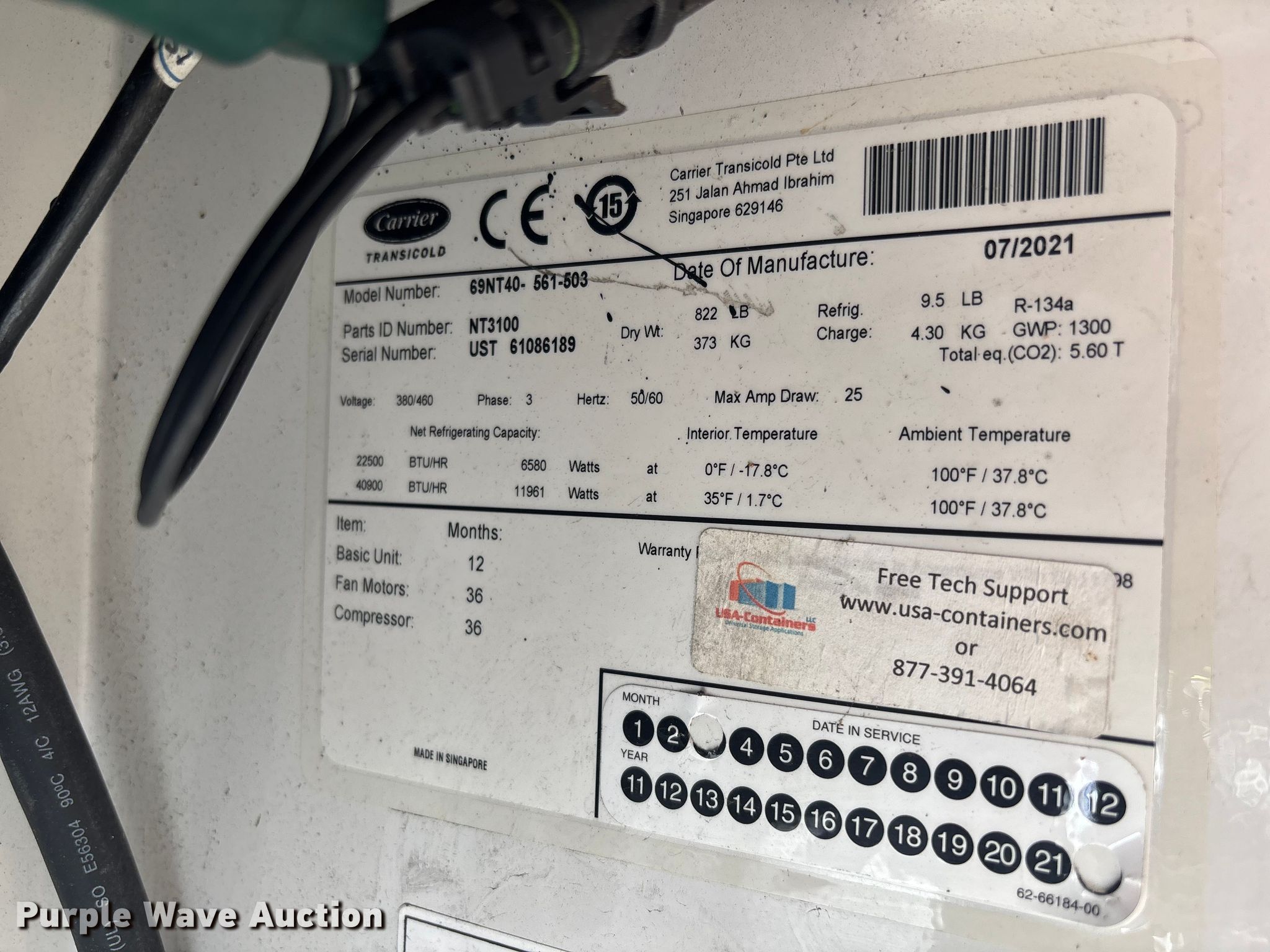 2022 USA-Containers refrigerated shipping container. Dimensions. Overall Length: 40', Width: 96", Height: 111". Refrigeration unit Carrier 69NT40-561-503 Serial: UST 61086189, Volts: 380/460, Phase: Three. Smart Warehousing. Orlando, FL 32806