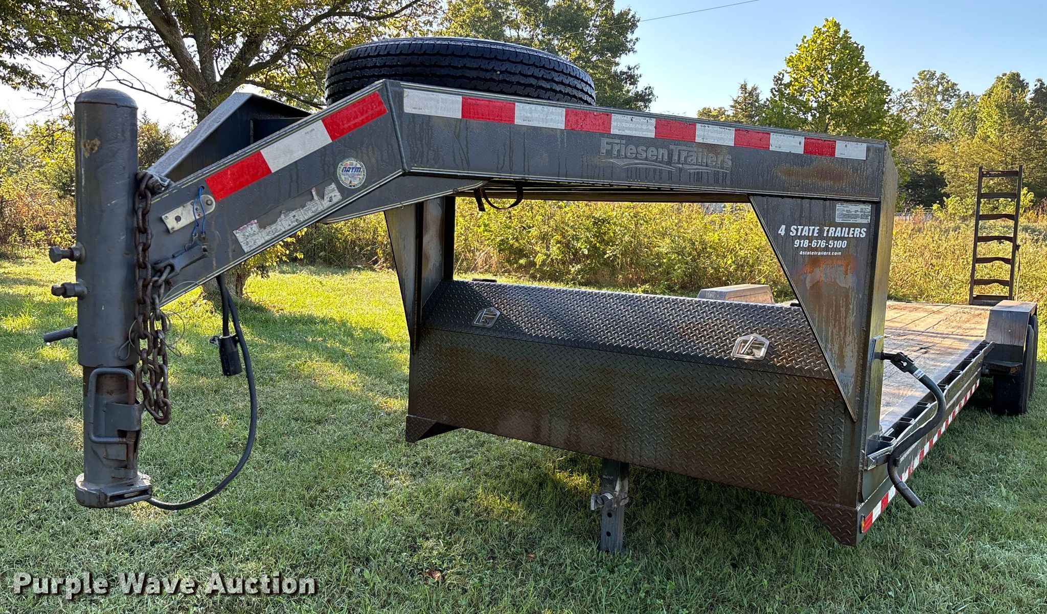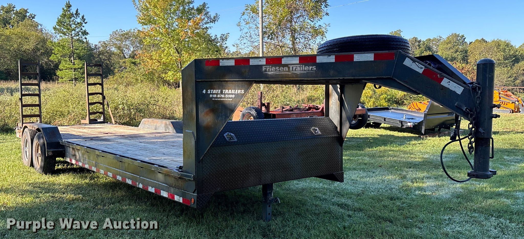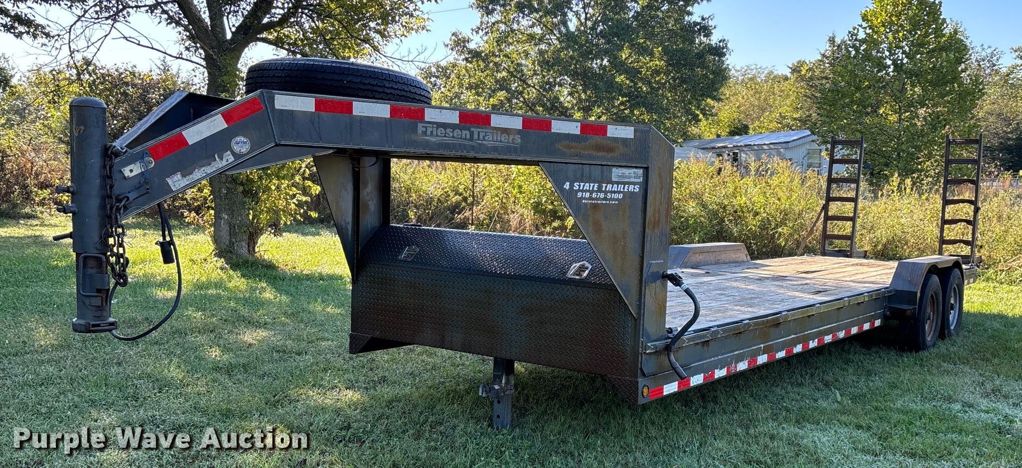 2015 Friesen Trailers equipment trailer. VIN: 4WFGN252XF1013314. Dimensions Overall Length: 33' 6", Width: 101", Deck Length: 25', Width: 81", Deck height: 25", Ramps: Manual Length: 60". Features Deck type: Wood. Chassis Hitch: Gooseneck, Landing gear: Single, Suspension: Torsion, Brakes: Electric, Axles: Tandem, GVWR: 14,000 lbs, GAWR: 7,000 lbs. Tires Steel wheels, Size: ST235/80R16. Notes Torsion axle issues, worn , Spare tire cable damaged. Missouri title. Title distribution may be delayed up to 14 days from verification of funds. Miller Service. Pierce City, MO 65723
