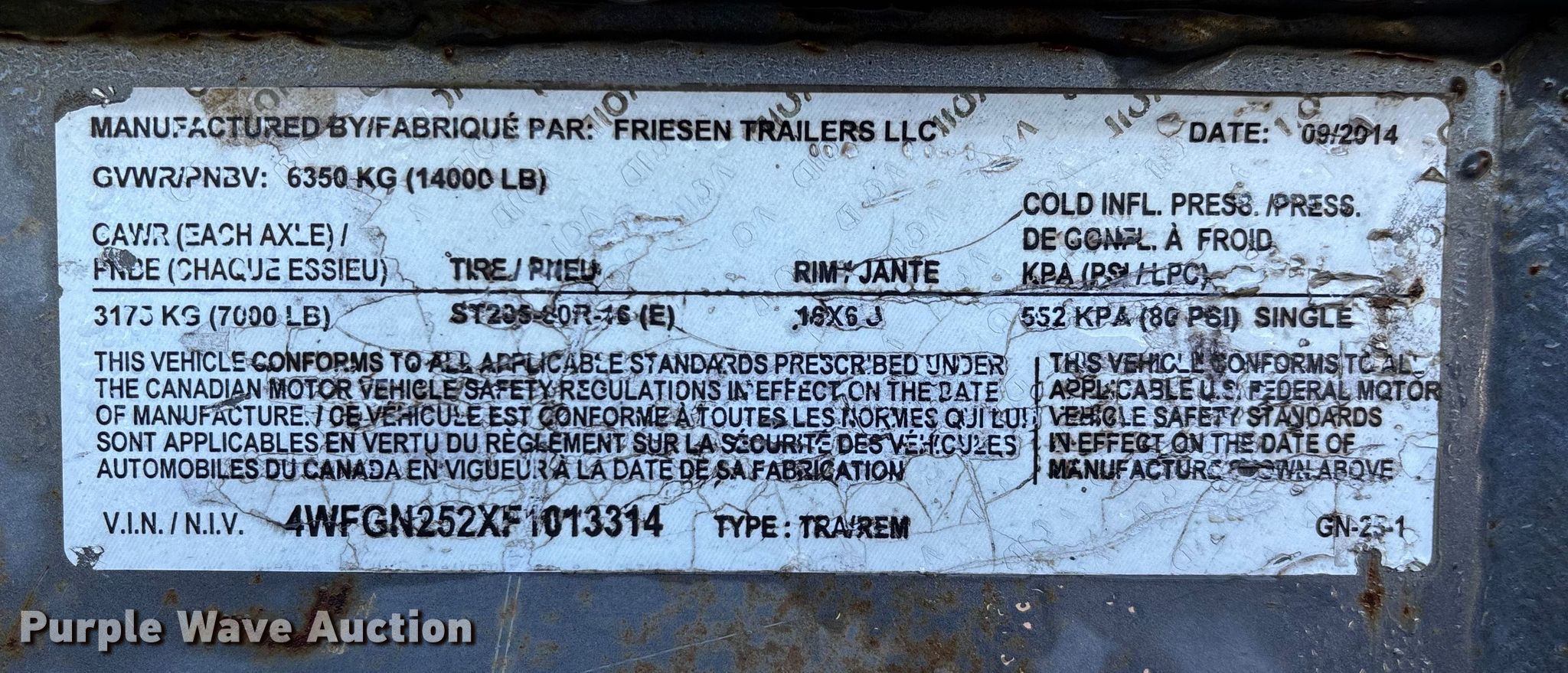Purple Wave is selling a used Equip. Trailer in Missouri. This item is a 2015 Friesen Trailers equipment trailer with the following: VIN: 4WFGN252XF1013314