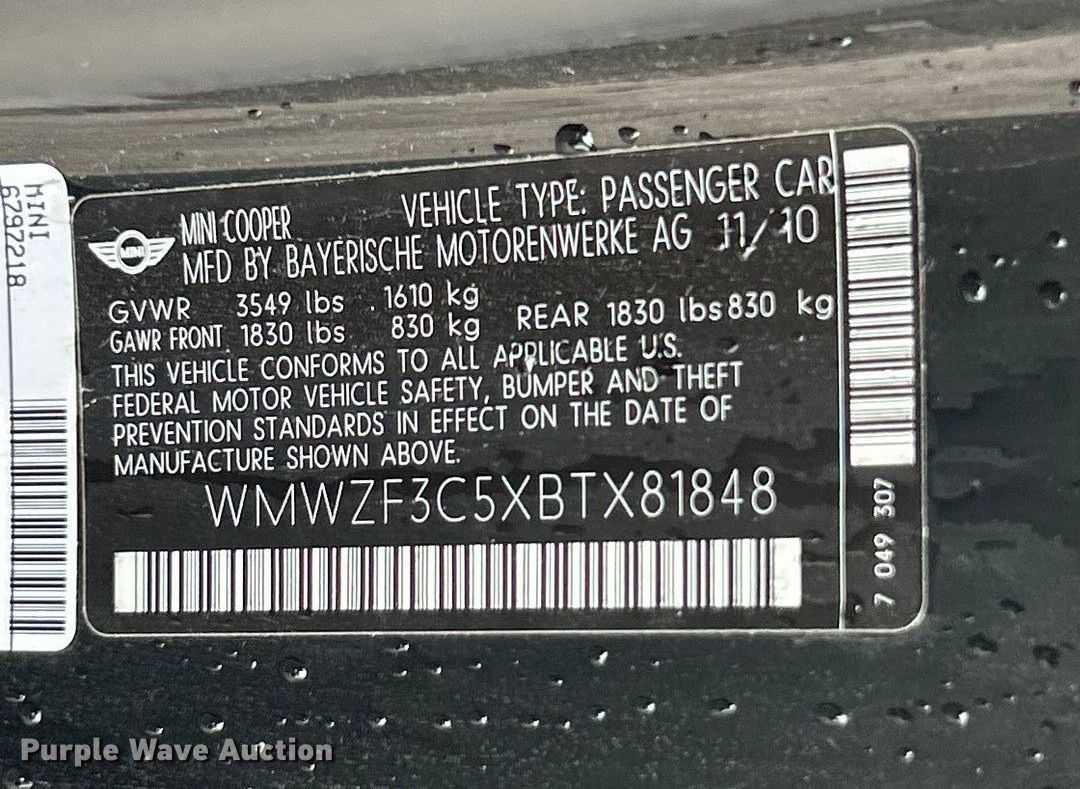 Purple Wave is selling a used Passenger Vehicle in Missouri. This item is a 2011 Mini Cooper with the following: Miles: 179,202 on odometer, VIN: WMWZF3C5XBTX81848