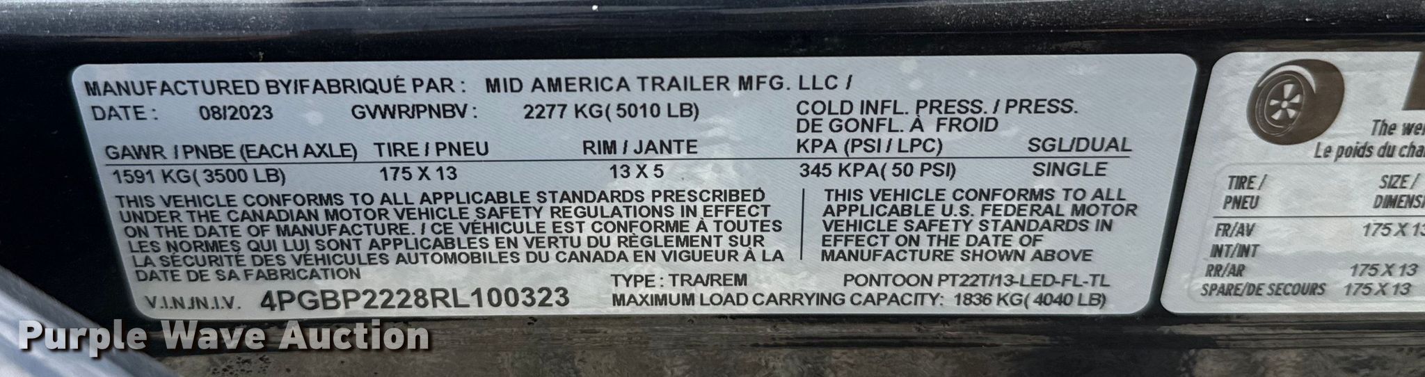- 2024 Mid America Trailer Pontoon PT22T/13-LED-FL-TL