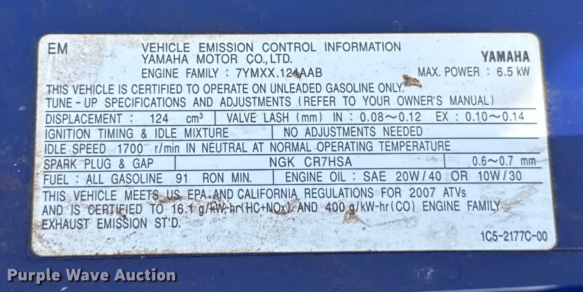 Purple Wave is selling a used ATV in Oklahoma. This item is a 2007 Yamaha Grizzly 125 ATV with the following: VIN: JYAE02Y27C016796