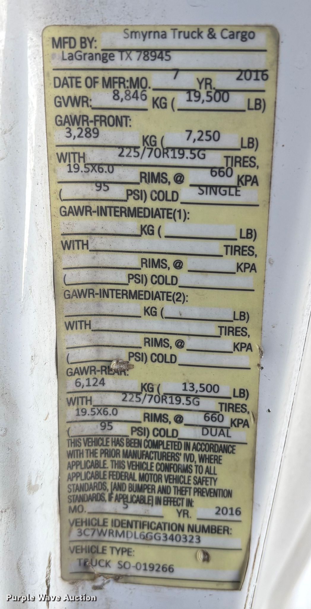 2016 Dodge Ram 5500 Box Truck. Miles: 282,331 on odometer, VIN: 3C7WRMDL6GG340323. Engine Cummins, Displacement: 6.7L, Cylinders: 6, Fuel type: Diesel. Transmission Automatic. Chassis Axles: Single, Suspension: Spring, Brakes: Hydraulic, GVWR: 19,500 lbs. Interior AC, Heat, Heated mirrors, Power windows, Power locks, Cruise control, Auxiliary controls. Features Bed Smyrna Truck & Cargo BAV16084096, Serial: S0-019266, Length: 16', Width: 8', Height: 6' 6", Floor: Wood, End gate lift, Palfinger. Tires Size: 225/70R19.5. Notes Dash warning indicator: Regen. Texas title. Title distribution may be delayed up to 14 days from verification of funds. Milstead Corporation. Conroe, TX 77303