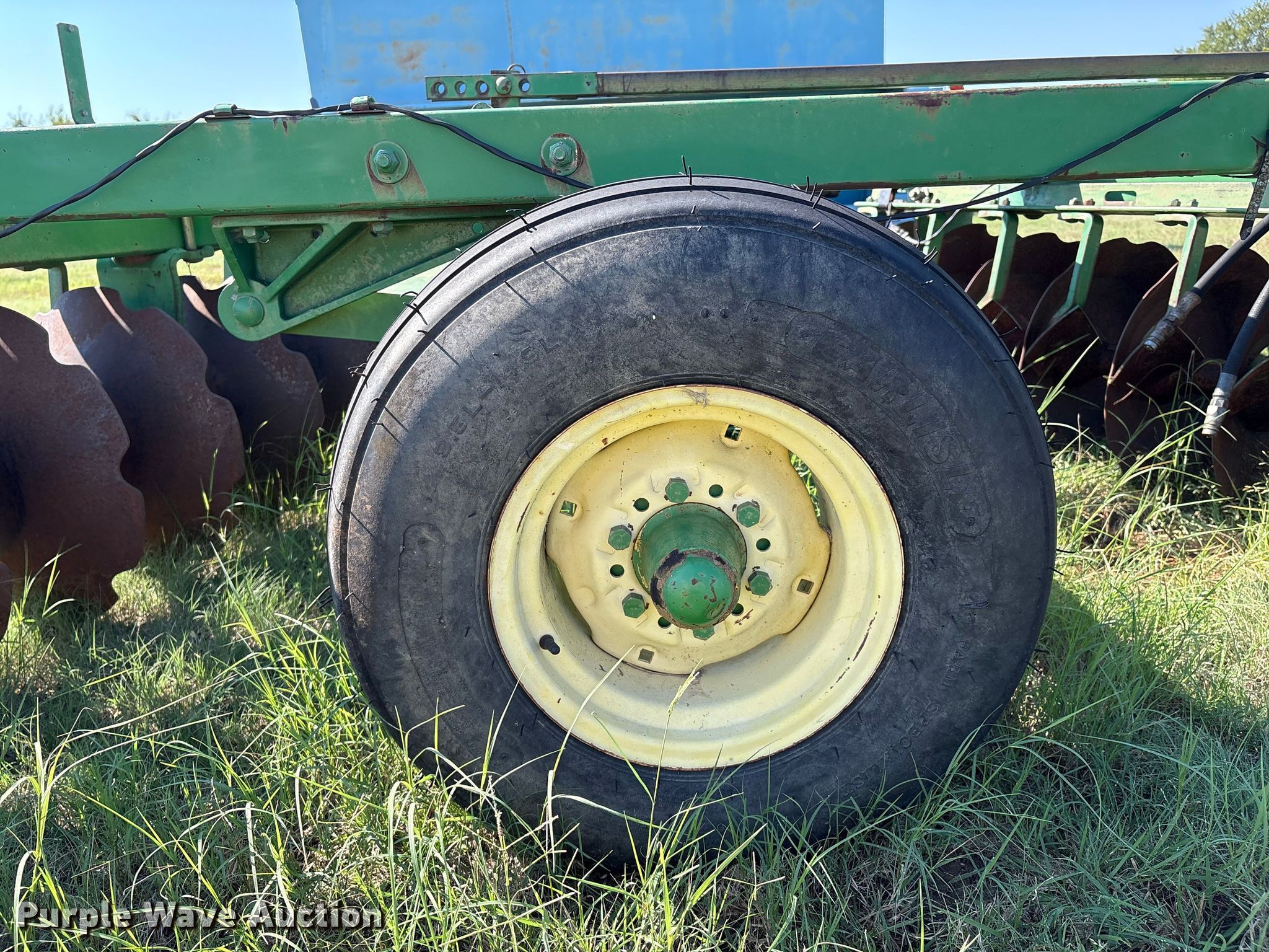 John Deere 226 off-set disk. Overall width: 8', Serial: P00225X025437. Features Front blades Diameter: 20", Spacing: 9", Rear blades Diameter: 20", Spacing: 9", Disk scrapers, Operation Hydraulic lift, Attachments Transport lights. Tires Tire size: 9.5l-14. Noble Research Institute. Ardmore, OK 73401