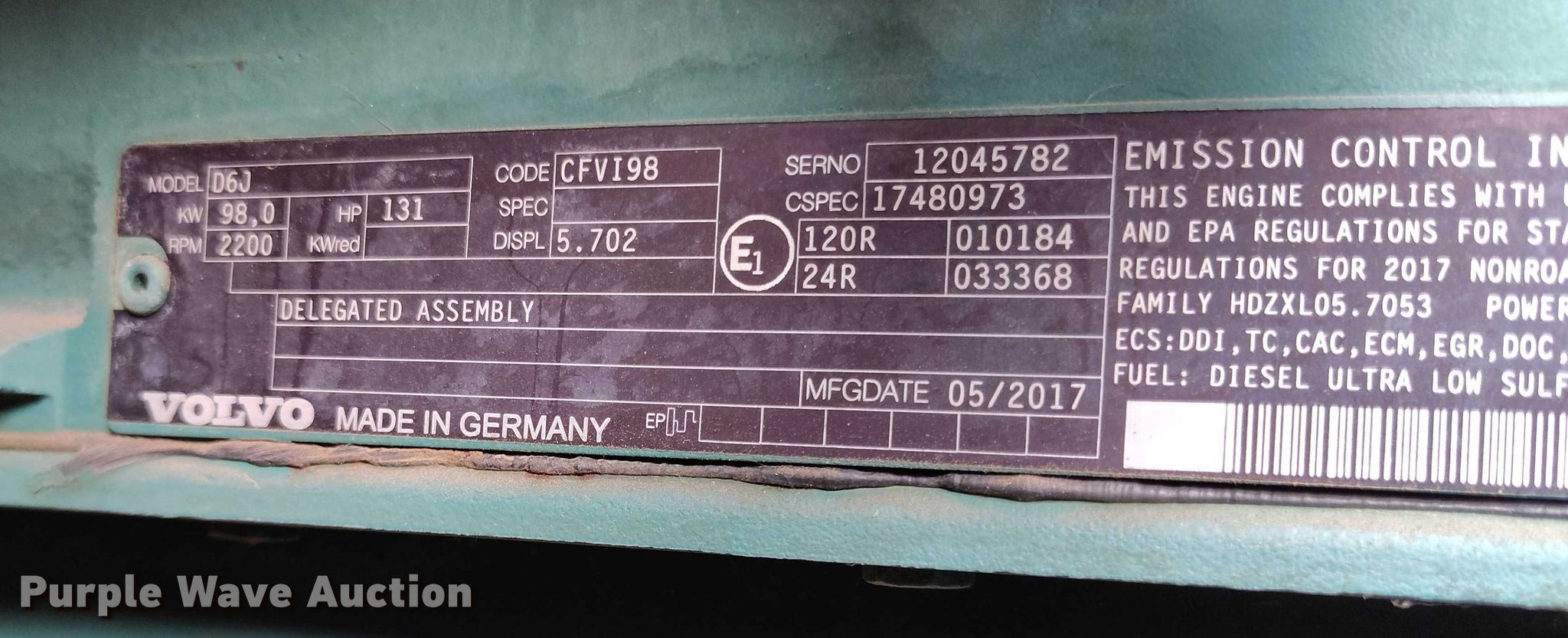 2017 Volvo L60H wheel loader. Hours: 18,771 on meter, Serial: VCE0L60HT0S621564K. Engine Volvo D6J, Cylinders: 6, Fuel type: Diesel, HP: 131. Transmission Powershift, 4F - 4R. Operators station Enclosed cab, AC, Heat, Bucket controls: Two-lever. Features Auxiliary hydraulics: Front, Quick coupler: Hydraulic, Bucket Volvo 83887, Width: 96", Cutting edge: Bolt-on. Tires Size: 525/80R22.5. Notes Jump start required during on-site data collection. Prestige Equipment Inc.. Brighton, CO 80603