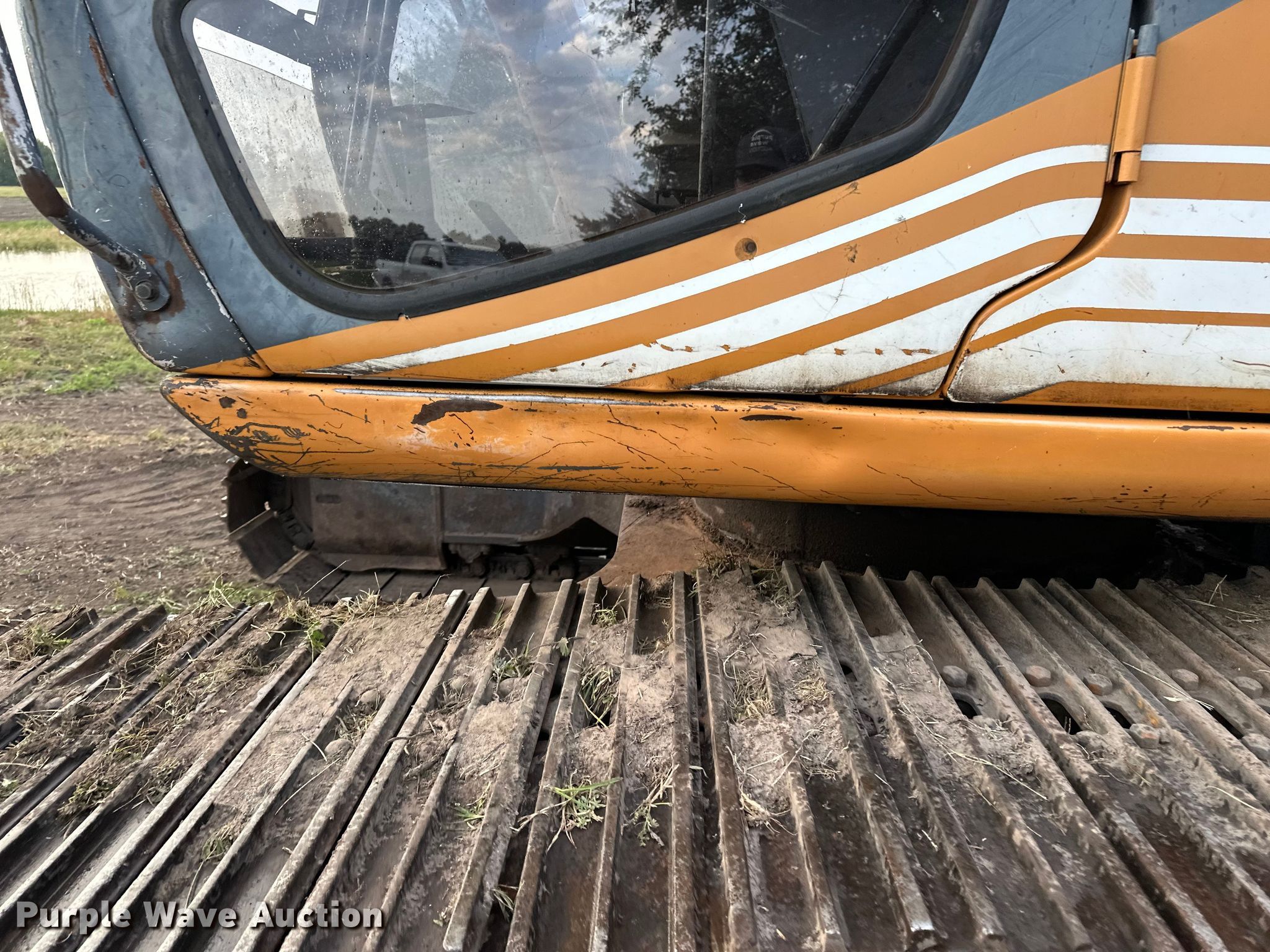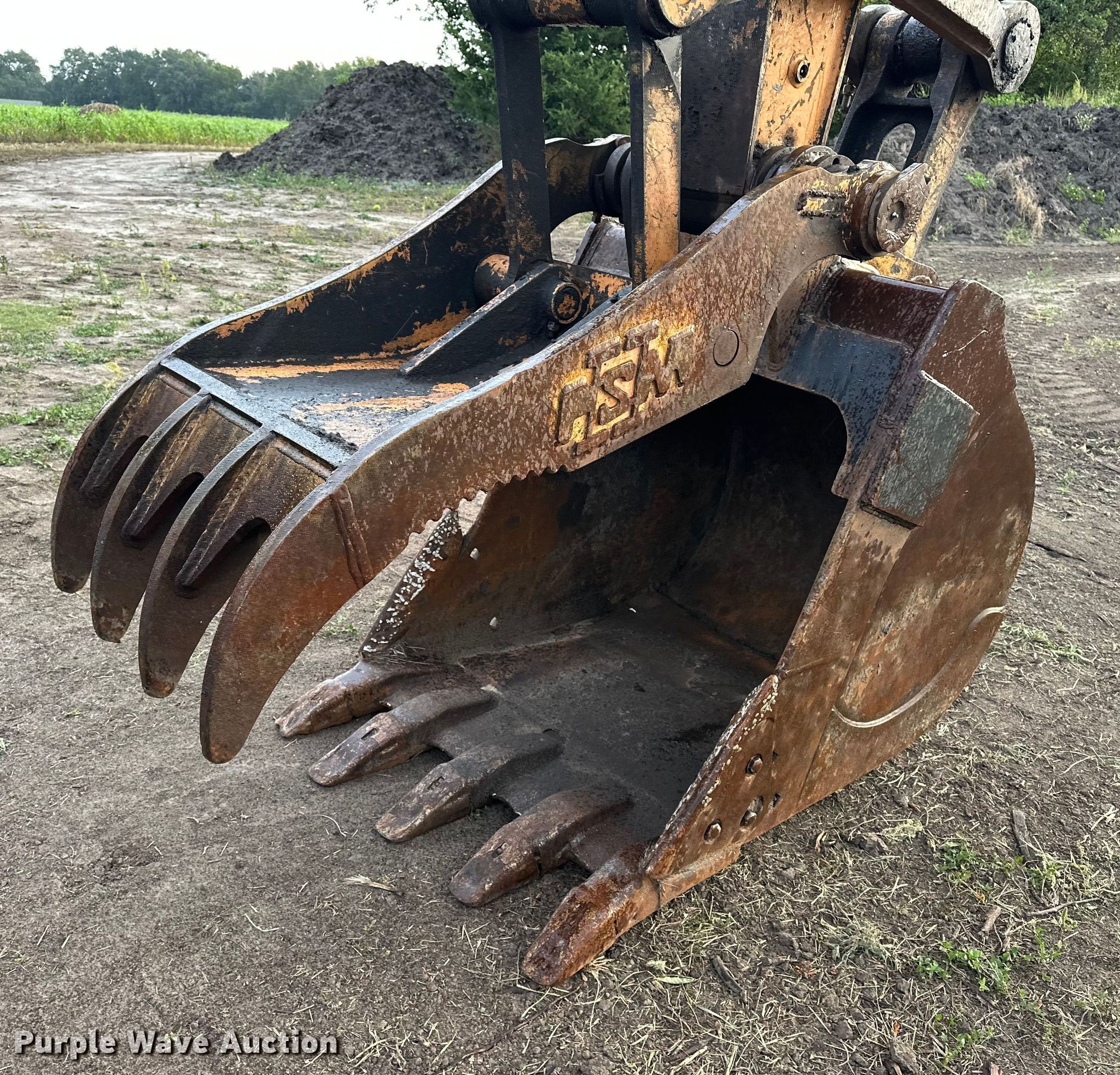 1999 Case 9040B excavator. Hours: 8,688 on meter, Serial: DAC0402311. Engine Case 6T830, Cylinders: 6, Fuel type: Diesel. Transmission Hydrostatic. Operators station Enclosed cab, AC, Heat. Features Auxiliary hydraulics Standard, Counter weights, Boom Standard, Stick Stick length: 13' 2", Thumb: Hydraulic PSM, Bucket Width: 43", Teeth: 5. Tracks Width: 32", Steel, Grouser pads: Triple. Notes Glass cracked, Front glass missing, Hydraulic issues, leak, Track drive issues, weak, AC belt missing, Unknown operating condition of AC. Triumph Enterprises LLC. Sedgwick, KS 67135