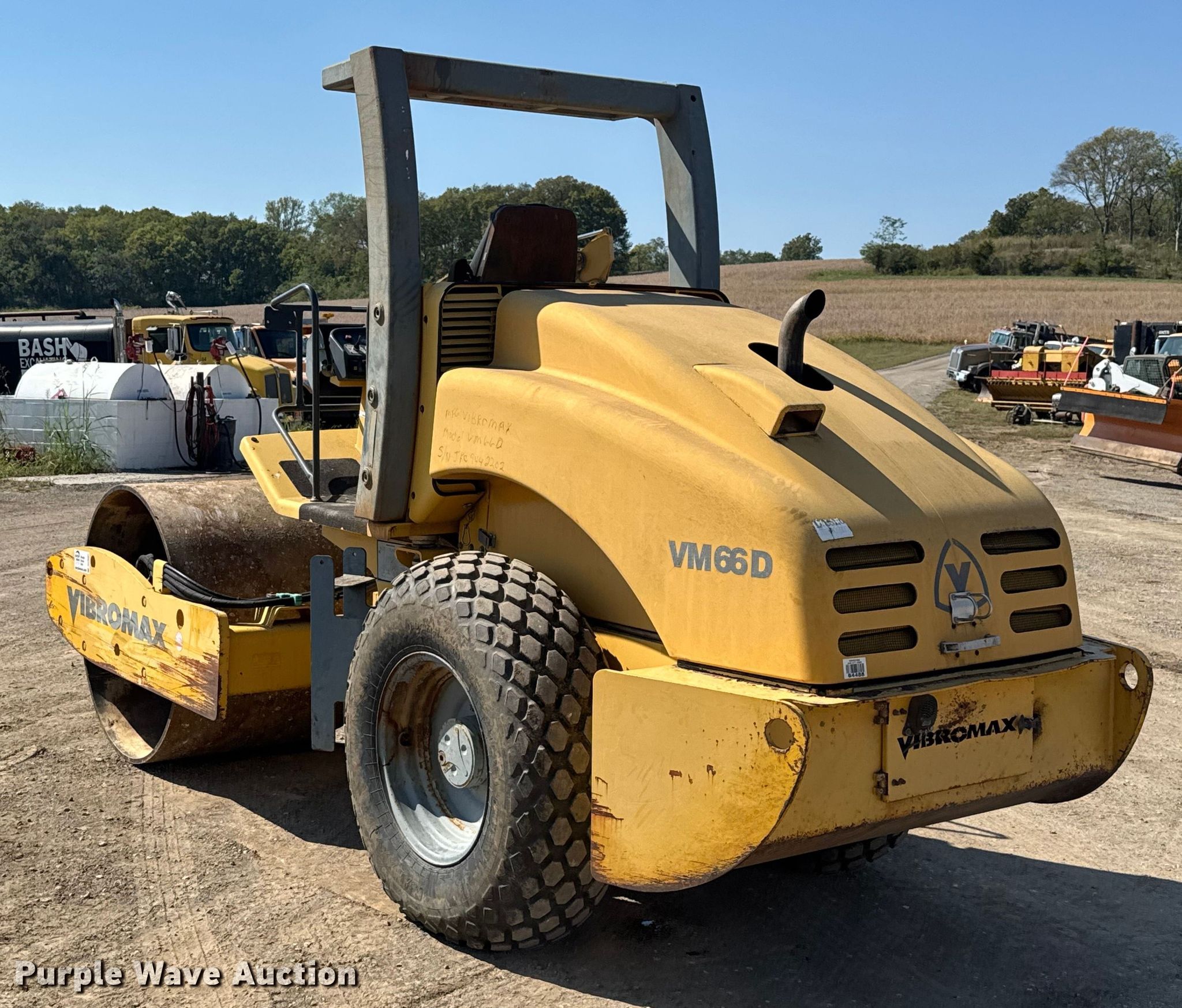 2006 Vibromax VM66D single drum vibratory roller. Hours: 2,670 on meter, Serial: JKC9442202. Engine Cummins B3.3, Displacement: 3.261L, Cylinders: 4, Fuel type: Diesel. Transmission Hydrostatic. Operators station OROPS, Vandal cover. Features Drum Drum type: Smooth, Vibratory system: Single, Width: 69", Diameter: 48", Drum scrapers. Tires Size: 14.9-24, Steel wheels. Notes Jump start required during on-site data collection. Bash Excavating. Kansas City, MO 64153