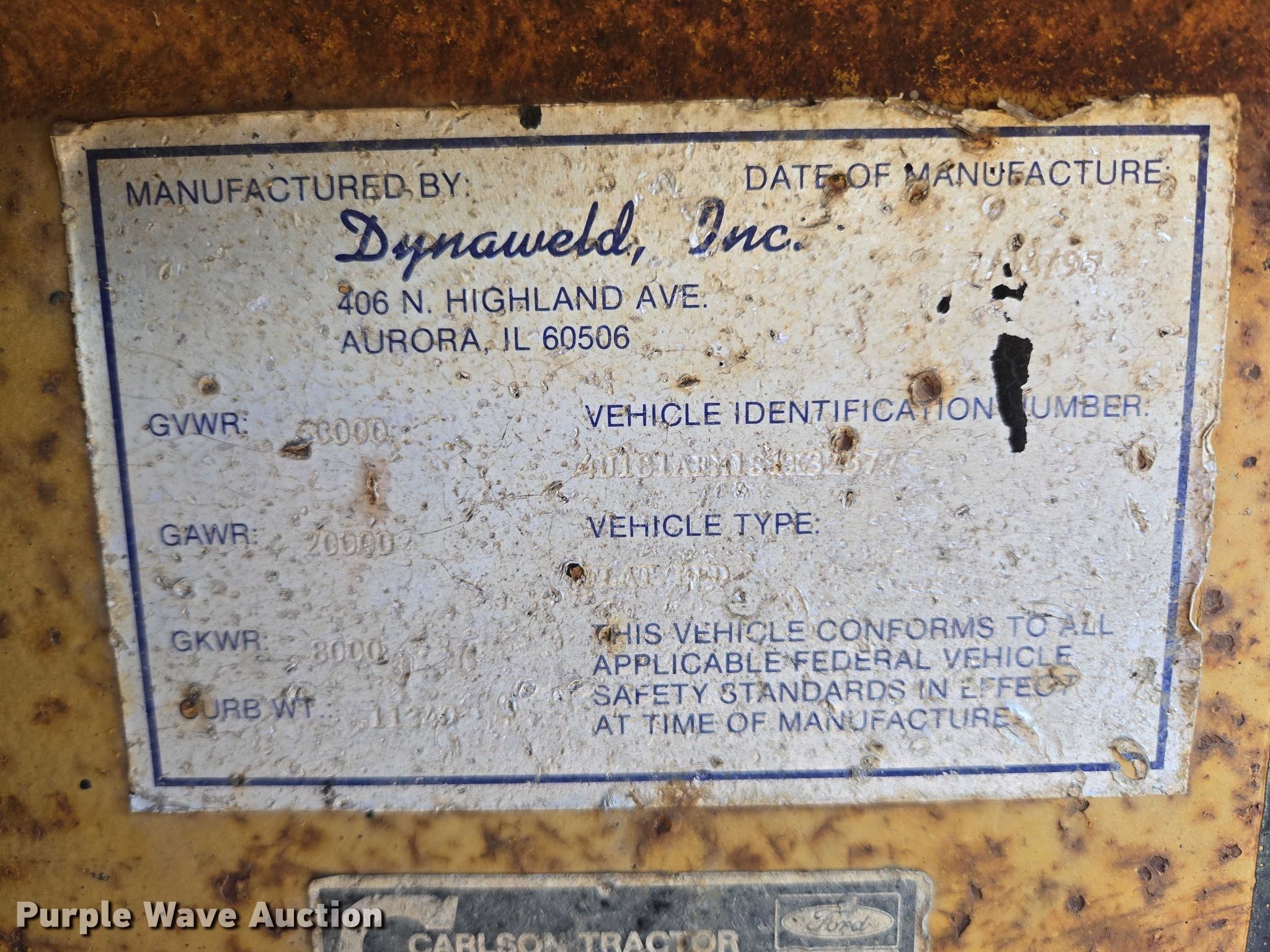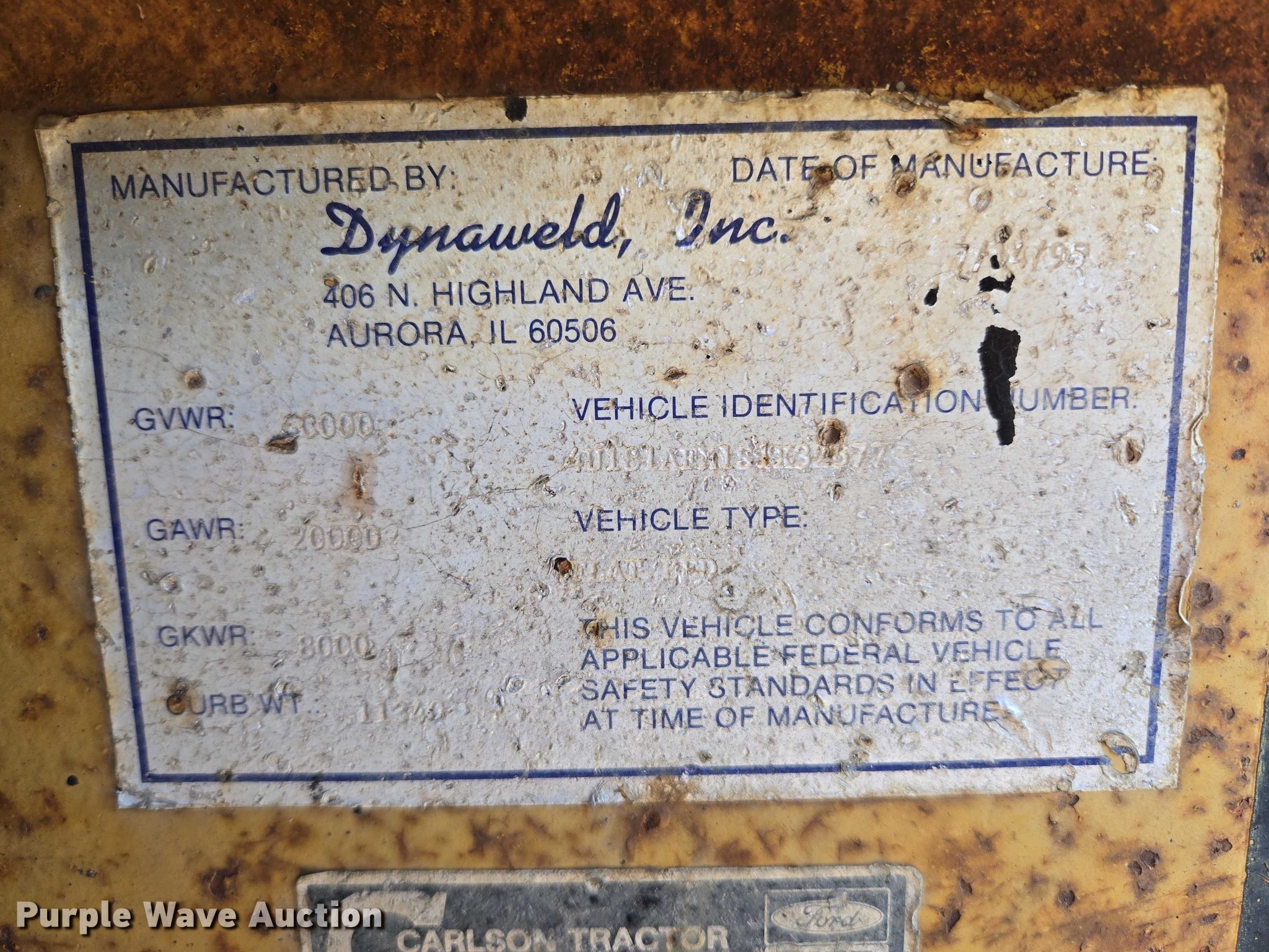 1995 Dynaweld tilt deck equipment trailer. VIN: 4U181AFX1S1X32577. Dimensions Overall Length: 36' 6", Width: 102", Deck Length: 30' 3", Width: 102", Deck height: 36". Features Deck type: Steel, Wood. Chassis Hitch: Pintle, Landing gear: Single, Suspension: Spring, Brakes: Air, Axles: Triple, GVWR: 60,000 lbs, GAWR: 20,000 lbs. Tires Steel wheels, Size: 215/75R17.5. Notes Deck boards damaged, Hydraulics disconnected. South Dakota title. Title distribution may be delayed up to 14 days from verification of funds. Level Contracting, LLC. Lake Norden, SD 57248