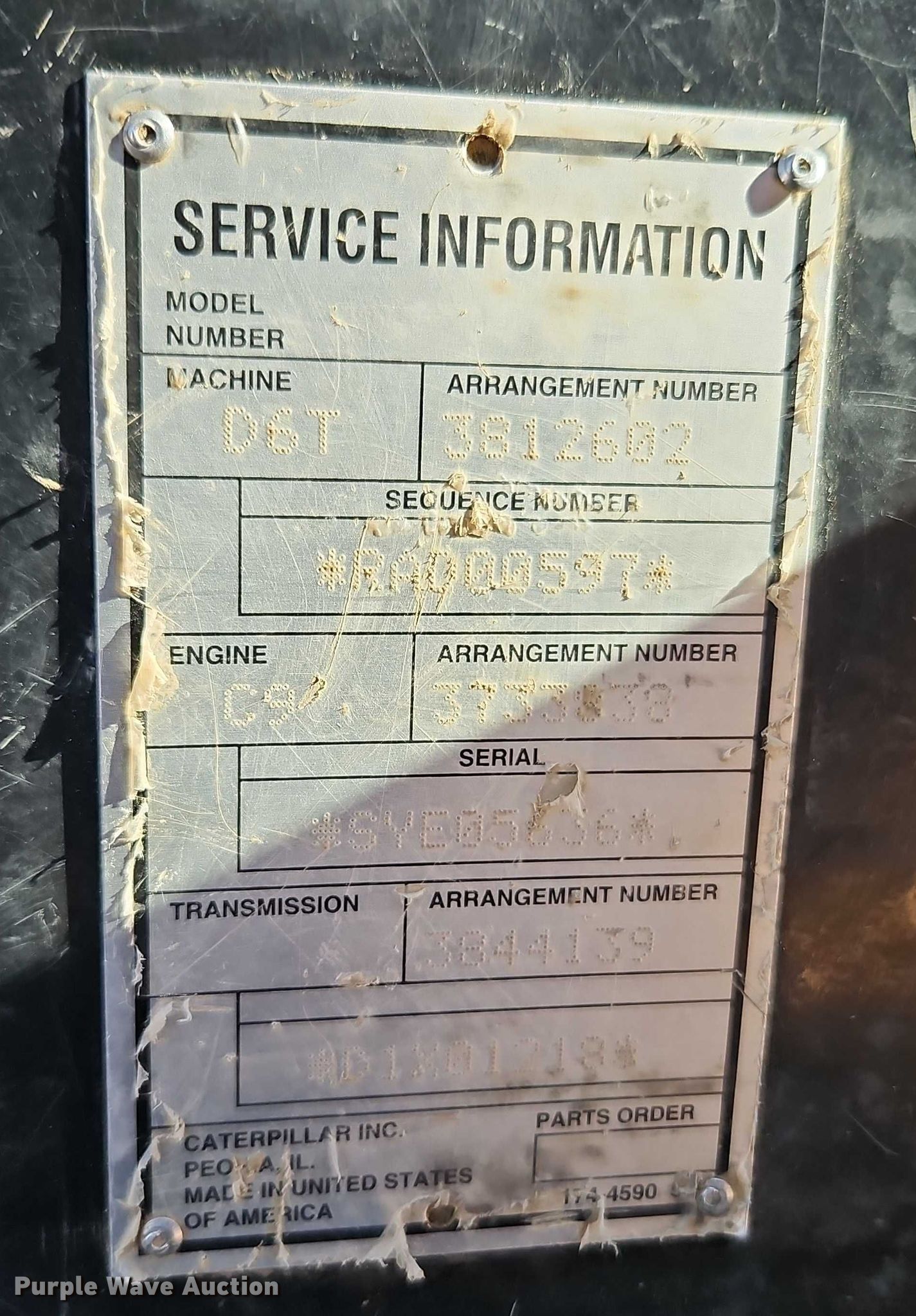 2015 Caterpillar D6T LGP dozer. Hours: 11,745 on meter, Serial: CATOOD6TLRAD00597, Unit #: 817. Engine Caterpillar C9, Cylinders: 6, Fuel type: Diesel. Transmission Powershift, 3F - 3R. Operators station Enclosed cab, AC, Heat, Steering: Joystick. Features Auxiliary hydraulics, Rear drawbar, Dozer blade Blade type: 6-way, Blade shape: Straight, Width: 13'. Tracks Width: 31", Grouser pads: Single, Bottom rollers: 8. Notes Additional counter weights included. View repairs. Haupt Construction Company. Spring Hill, KS 66083