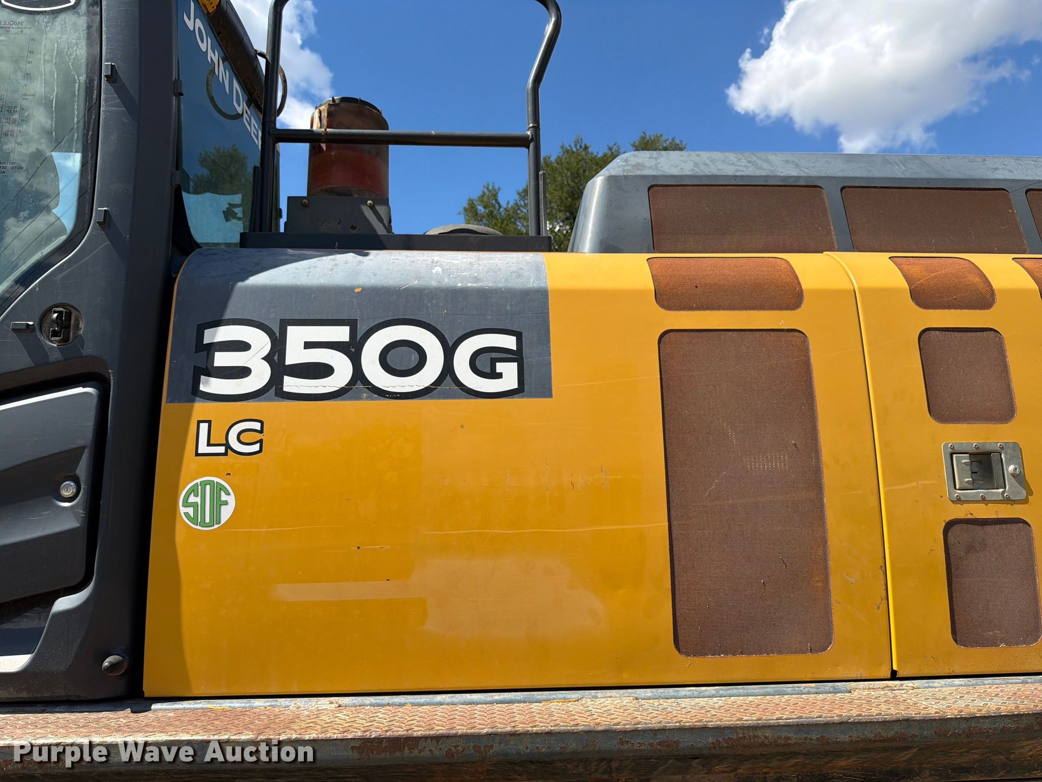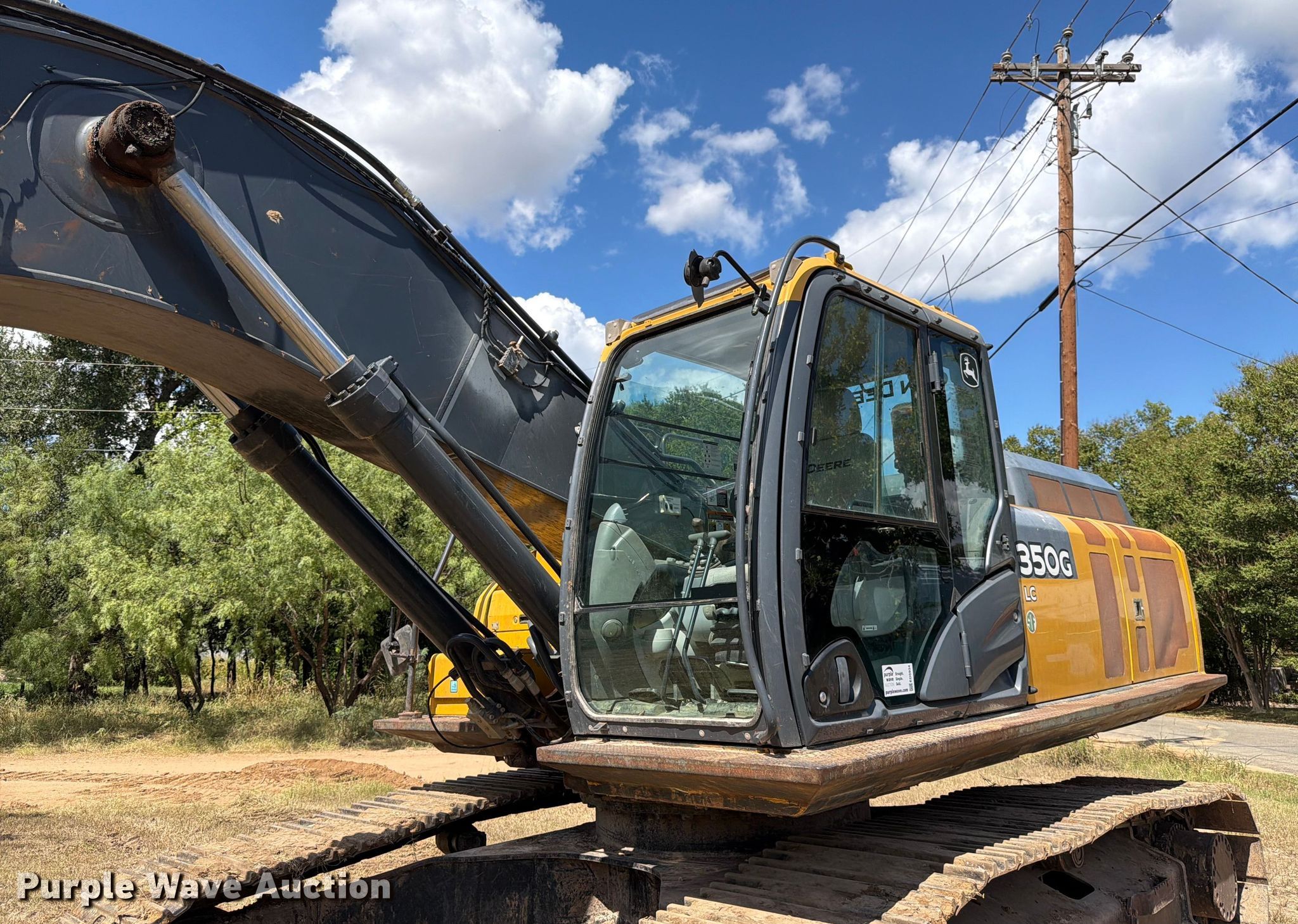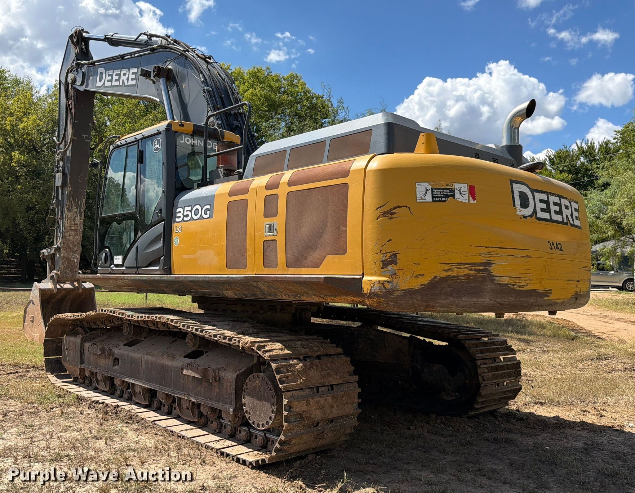 2018 John Deere 350G excavator. Hours: 6,115 on meter, Serial: 1FF350GXEJF812339. Engine John Deere 6090, Displacement: 9.0L, Cylinders: 6, Fuel type: Diesel. Transmission Hydrostatic, Two speed travel. Operators station Enclosed cab, AC, Heat, Backup camera, Pattern changer. Features Auxiliary hydraulics, Counter weights, Auto lube, Boom Standard, Stick Stick length: 13' 1", Bucket TAG, Width: 48", Teeth: 5. Tracks Width: 32.5", Steel, Grouser pads: Triple. Notes Warning indicator: Fault Code. Item will be utilized for loadout and unavailable for removal until Thursday, November 6. Kingsland, TX 78639