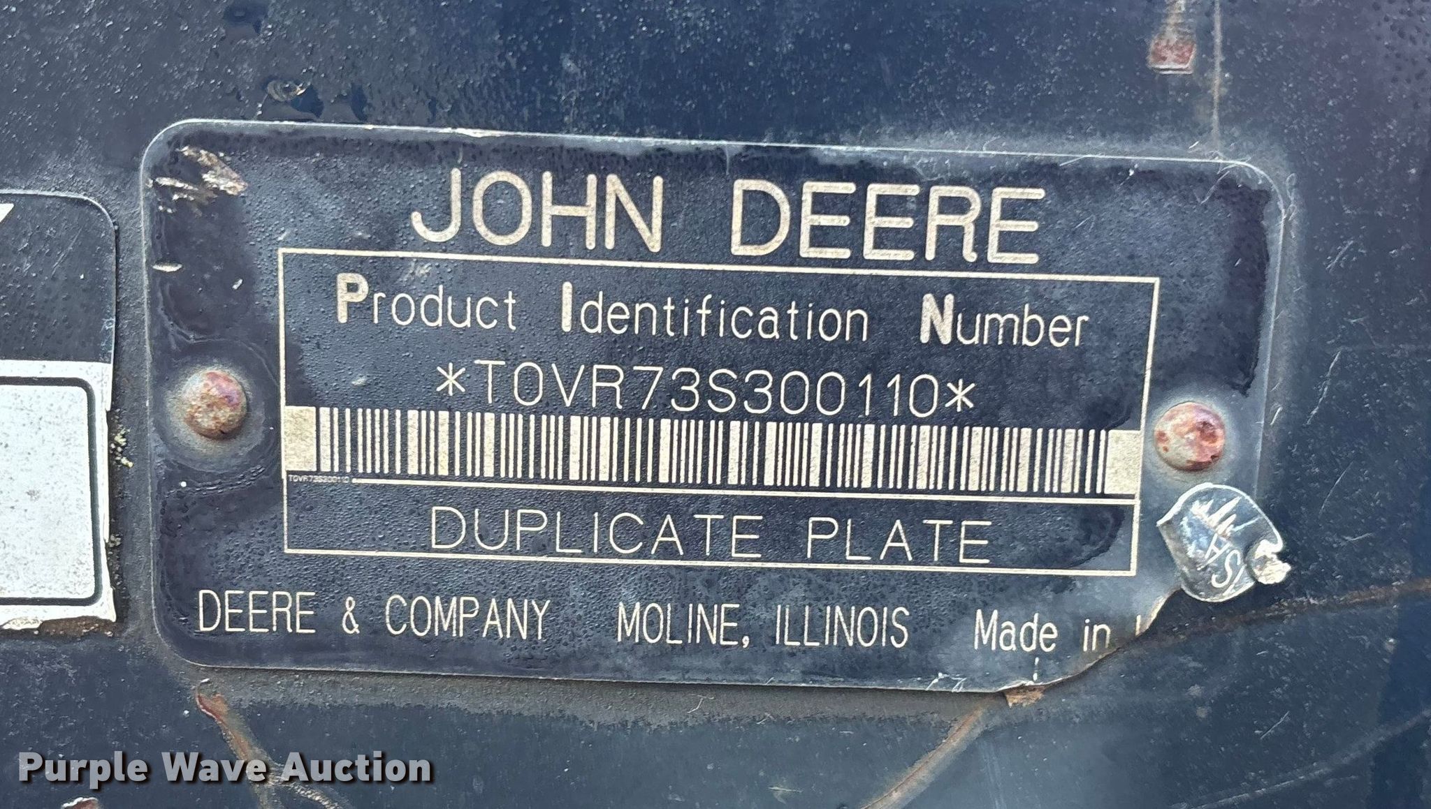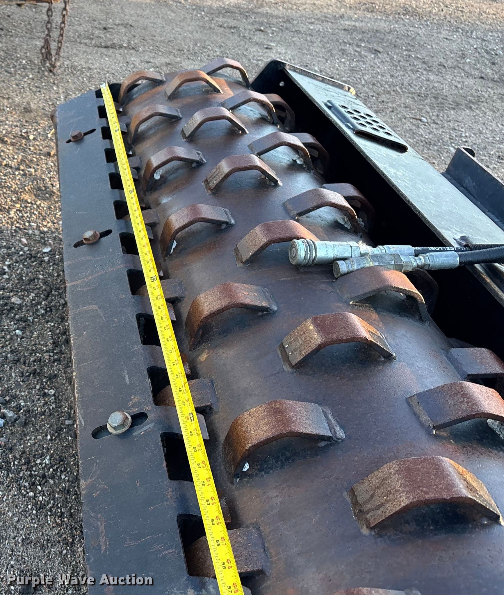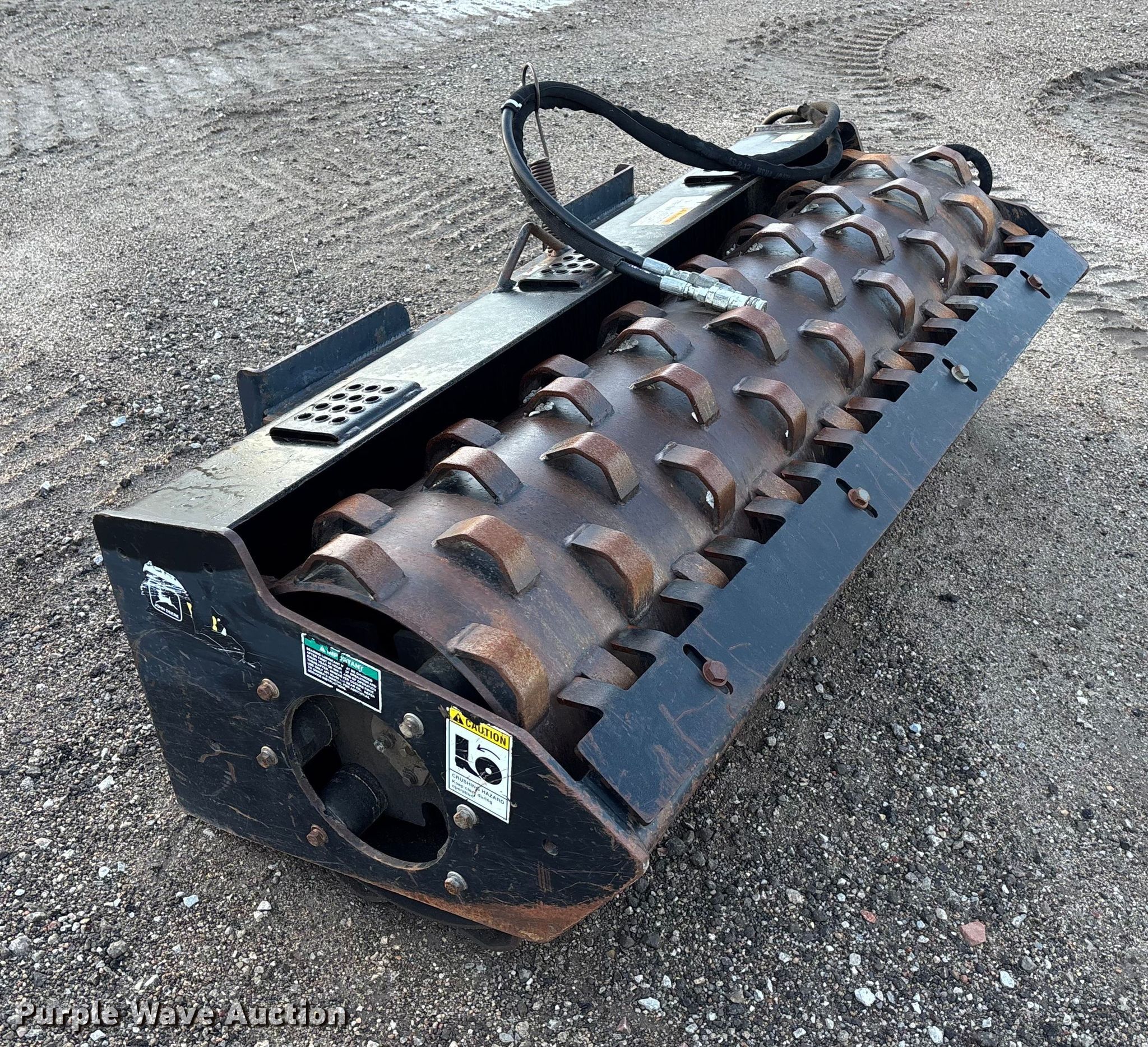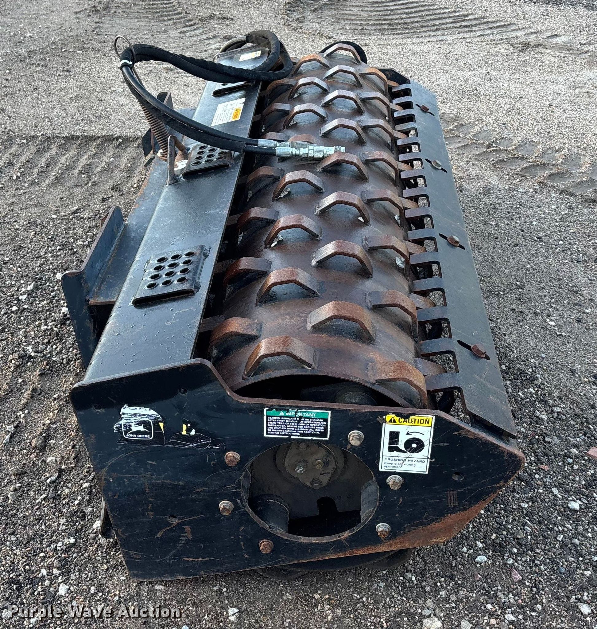 John Deere HE200 skid steer vibratory drum roller. Serial: T0VR73S300110, Width: 74", Drum diameter: 22". Notes Bearing issues, Non-operational unit. Valley Corp. Valley, NE 68064