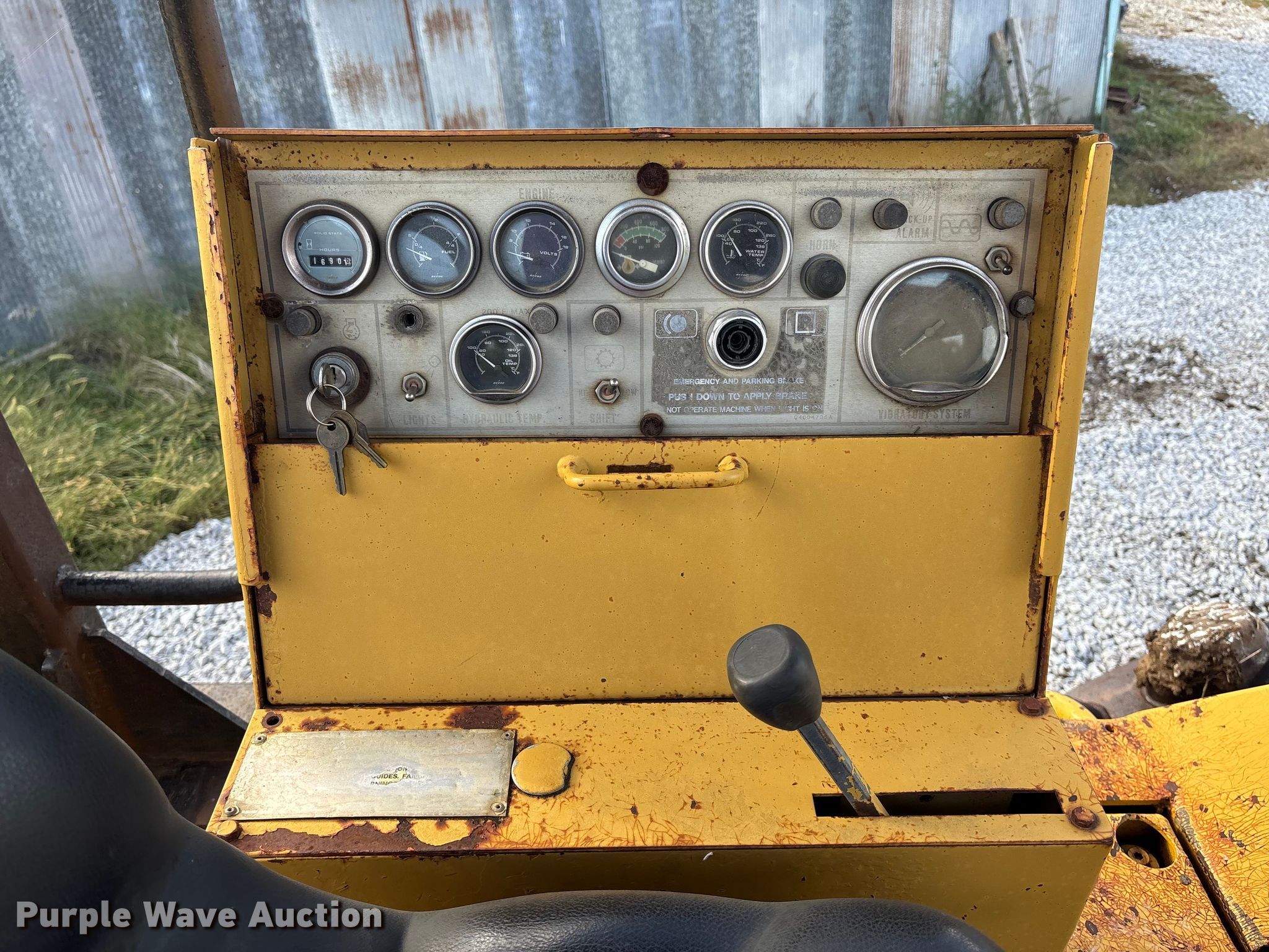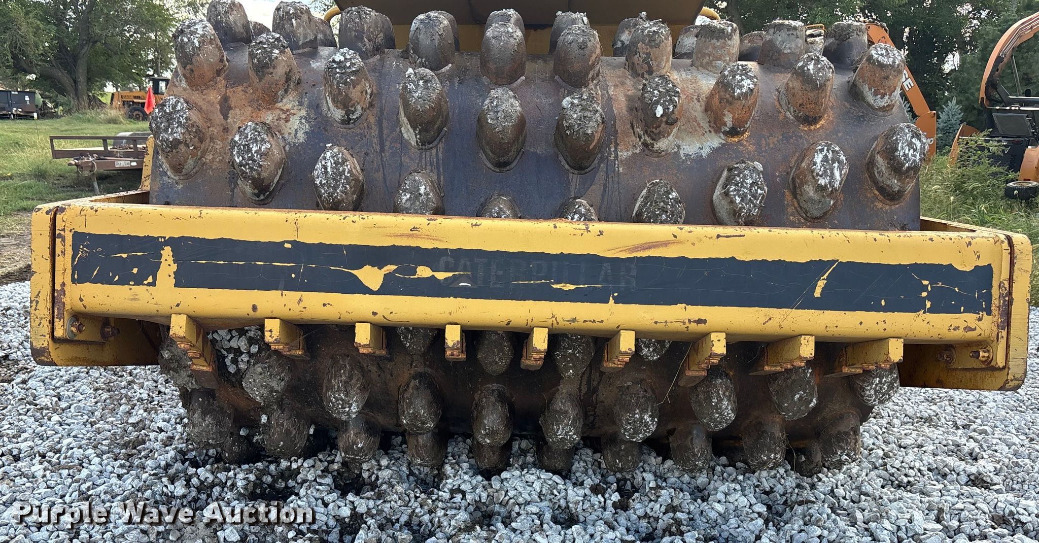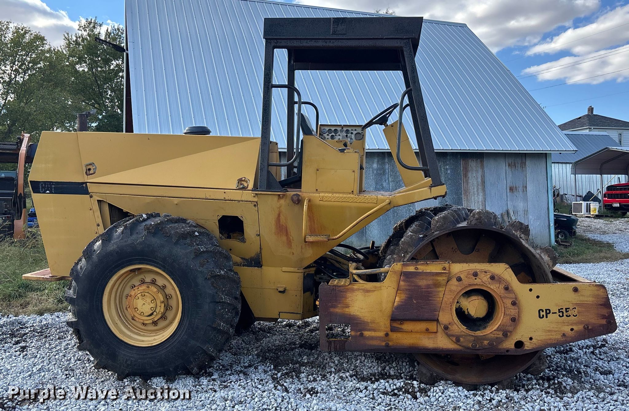 1986 Caterpillar CP-553 single drum vibratory roller. Hours: 1,690 on meter, Serial: 7BD00034. Engine Cylinders: 8, Fuel type: Diesel. Transmission Hydrostatic, 1F - 1R. Operators station Enclosed cab. Features Drum Drum type: Wedge foot, Vibratory system: Single, Width: 82", Diameter: 51", Drum scrapers. Tires Size: 23.1-26. Notes Fuel system issues, must be primed after sitting, Jump start required during on-site data collection, Non-operational vibrator system. Ceresco, NE 68017