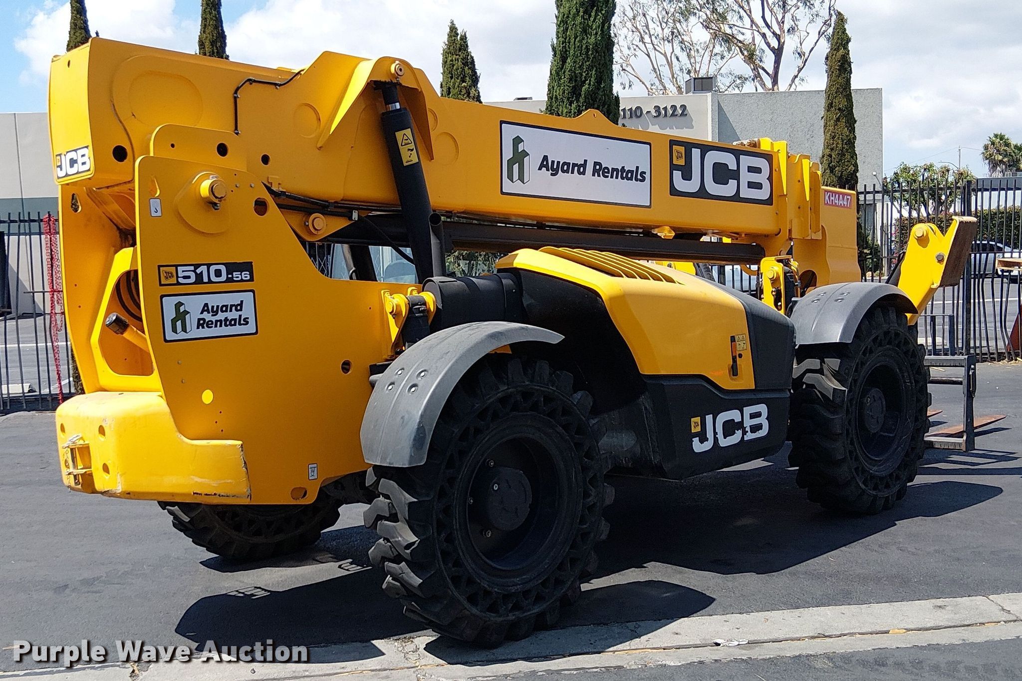 2020 JCB 510.56 F telehandler. Hours: 671 on meter, Miles or hours may vary, unit still in use, Serial: JCB5CG7GKM2993928. Engine Serial: SL320/41533U1610520, Displacement: 4.4L, Cylinders: 4, Fuel type: Diesel, HP: 74, kW: 55. Transmission Hydrostatic, Four wheel drive. Operators station OROPS, Steering: Crab, Four wheel. Features Maximum lift capacity: 31,145 lbs, Maximum lift height: 56', Boom stages: 4, Fork length: 72", Auxiliary hydraulics, Tilt carriage, Hydraulic outriggers, Hydraulic leveling, Quick attach: Hydraulic. Tires Size: 14.00-24, Solid. Buyer responsible for all aspects of state emissions compliance. Belcastro Construction Management. Compton, CA 90221