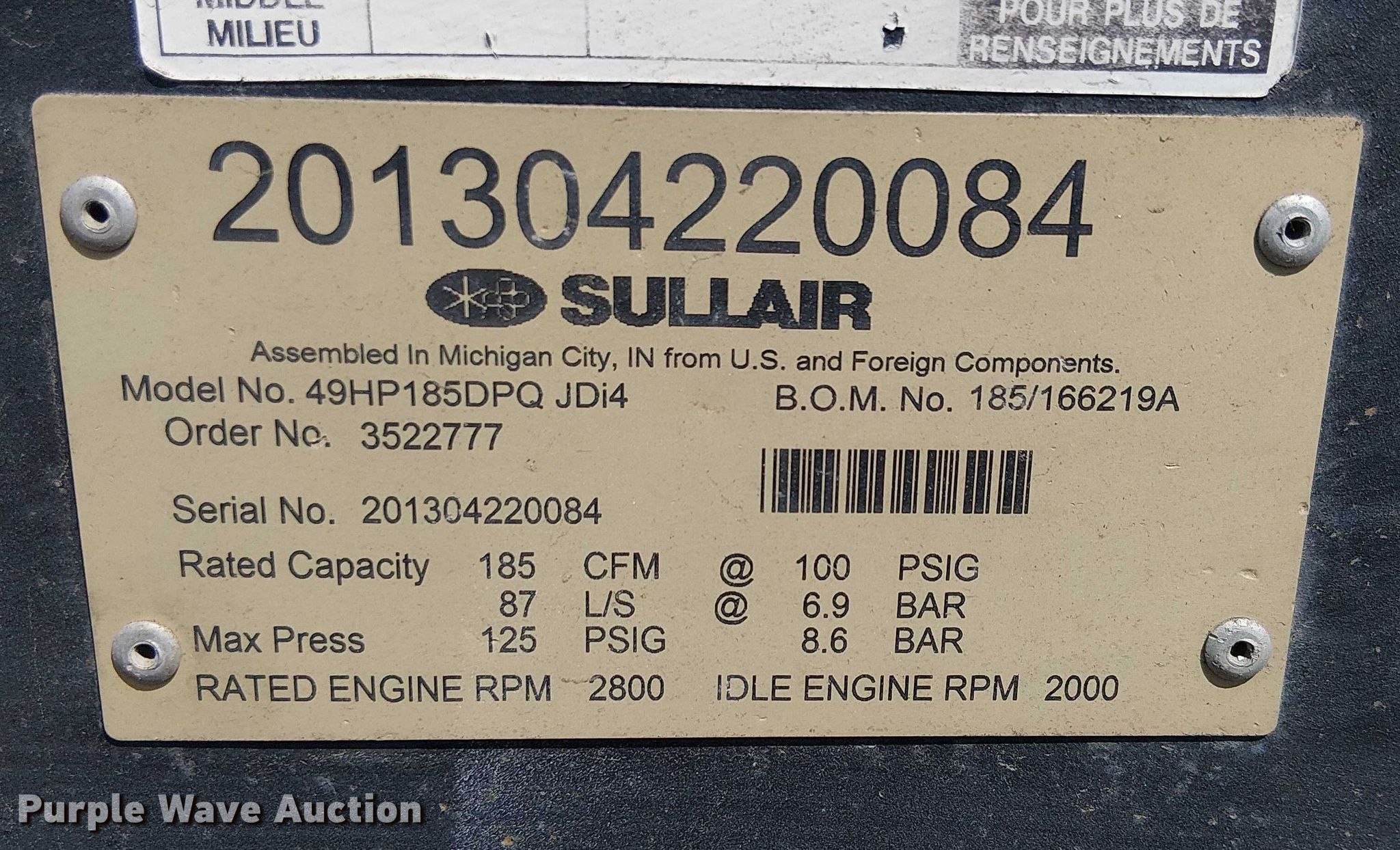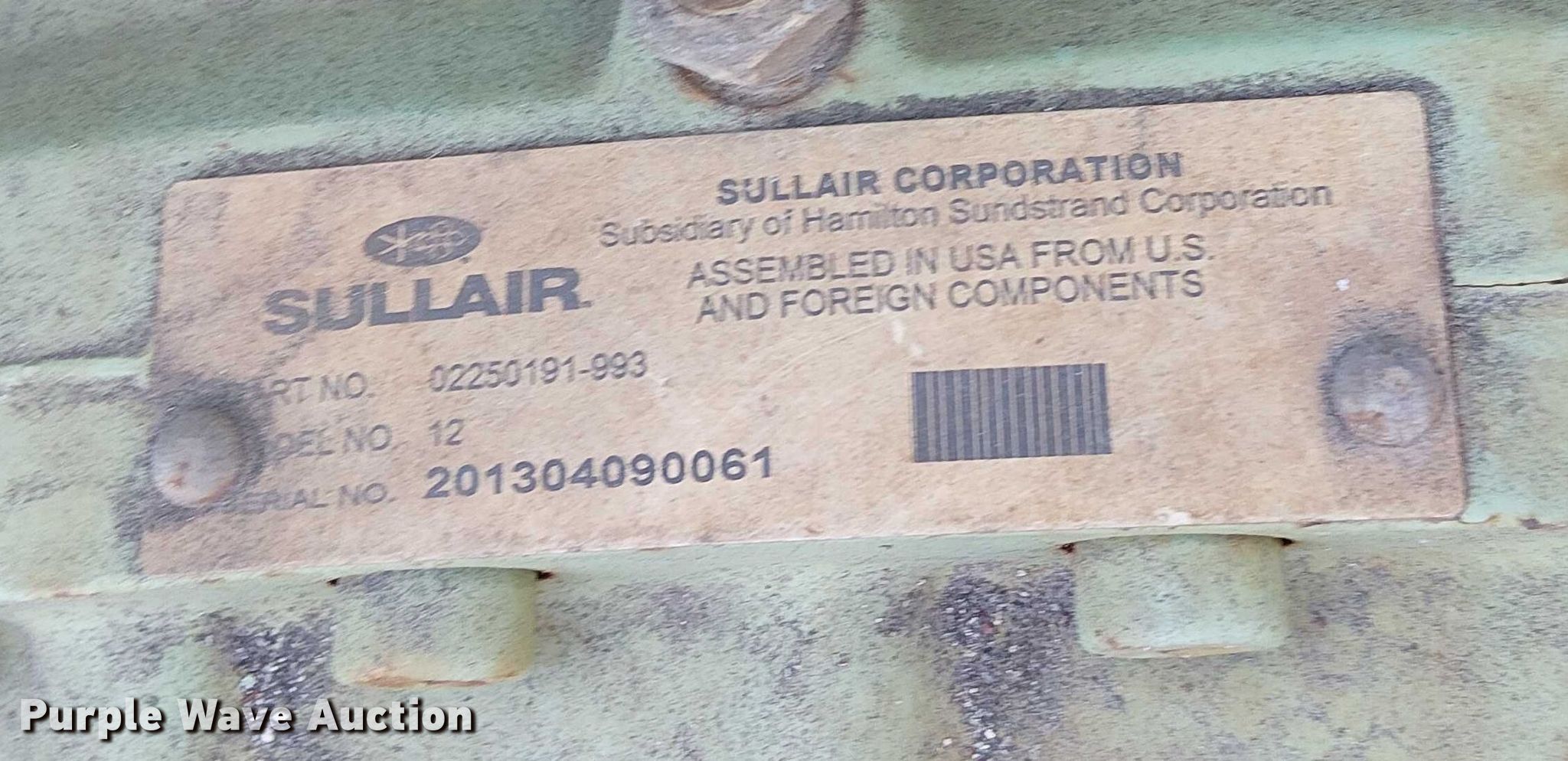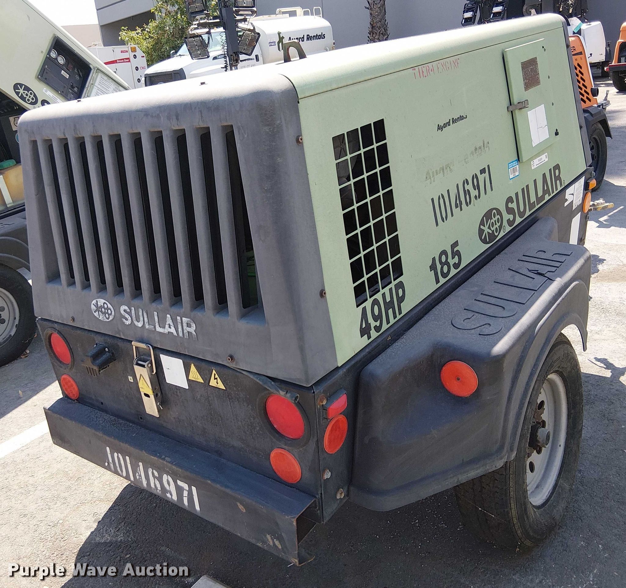 Purple Wave is selling a used Air Compressor in California. This item is a 2013 Sullair 49HP185DPQ JDi4 air compressor with the following: Hours: 2,150 on meter, Serial: 201304220084