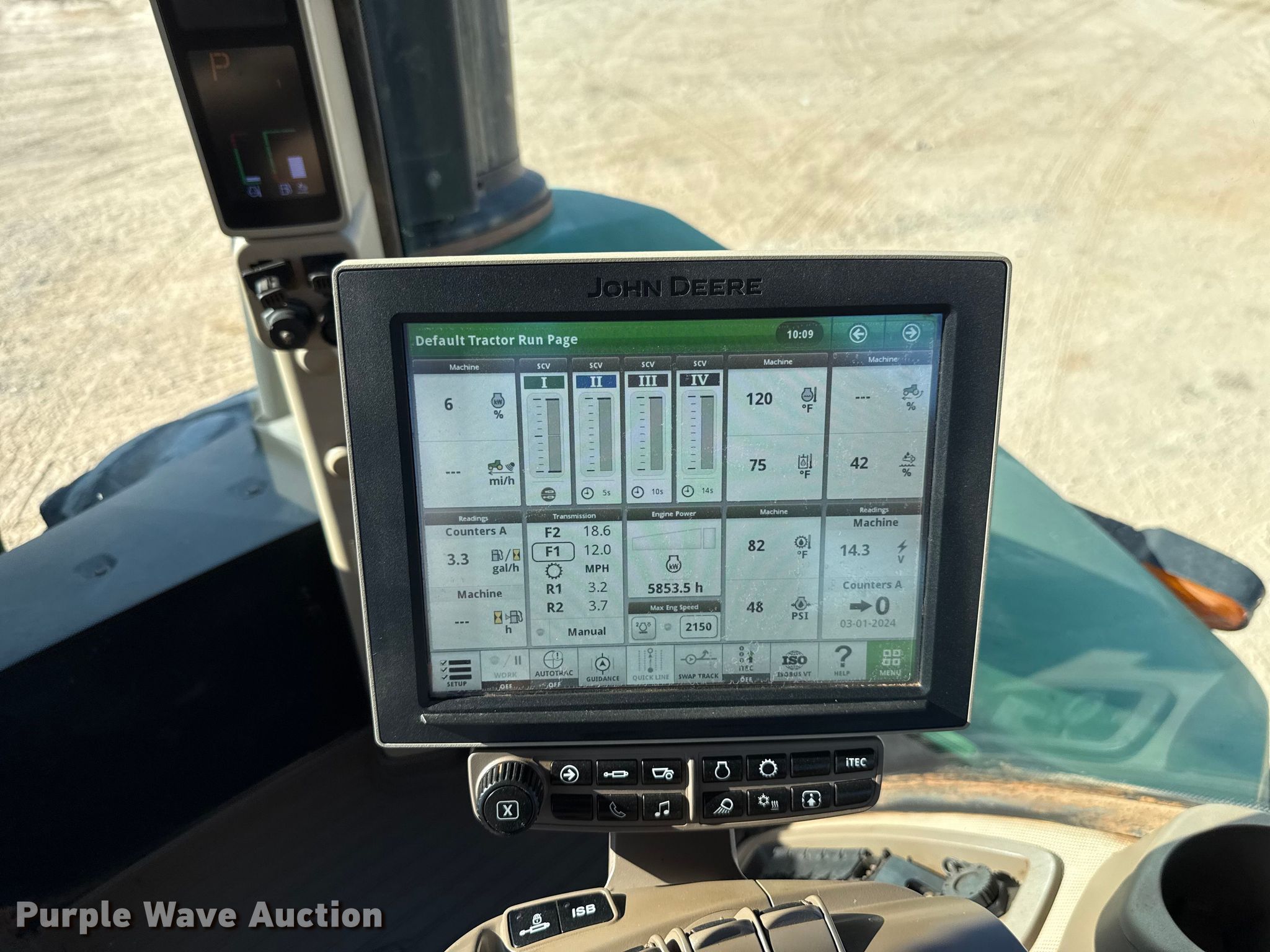 2017 John Deere 9570R Scraper Special 4WD tractor. Hours: 5,854 on meter, Serial: 1RW9570RLHE056502. Engine Cummins QSX15, Serial: 80006927, Displacement: 15.0L, Cylinders: 6, Fuel type: Diesel. Transmission Powershift, 18F - 6R, Differential lock. Operators station AC, Heat, Display John Deere. Features Seven pin outlet, ISOBUS outlet, Hydraulic remote sets Rear: 4, Suitcase weights: 36. Tires Size: 710/70R42, Wheel weights: 8, Duals, Front duals. Diamond Services Co. Oklahoma City, OK 73127