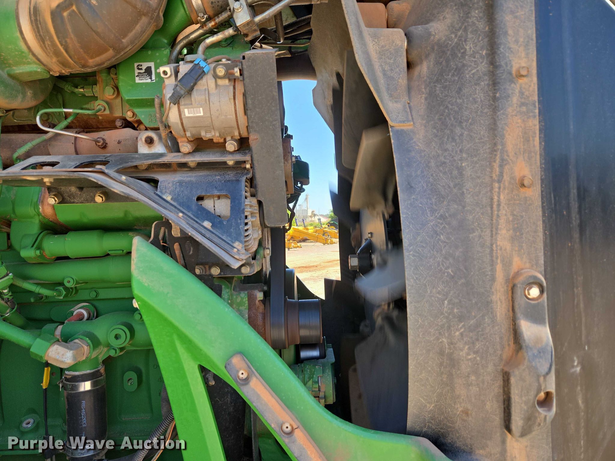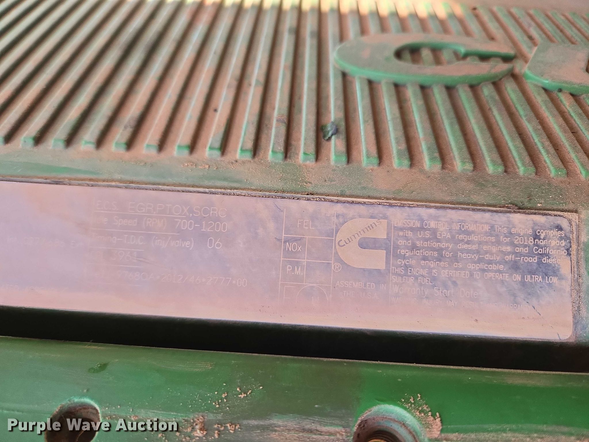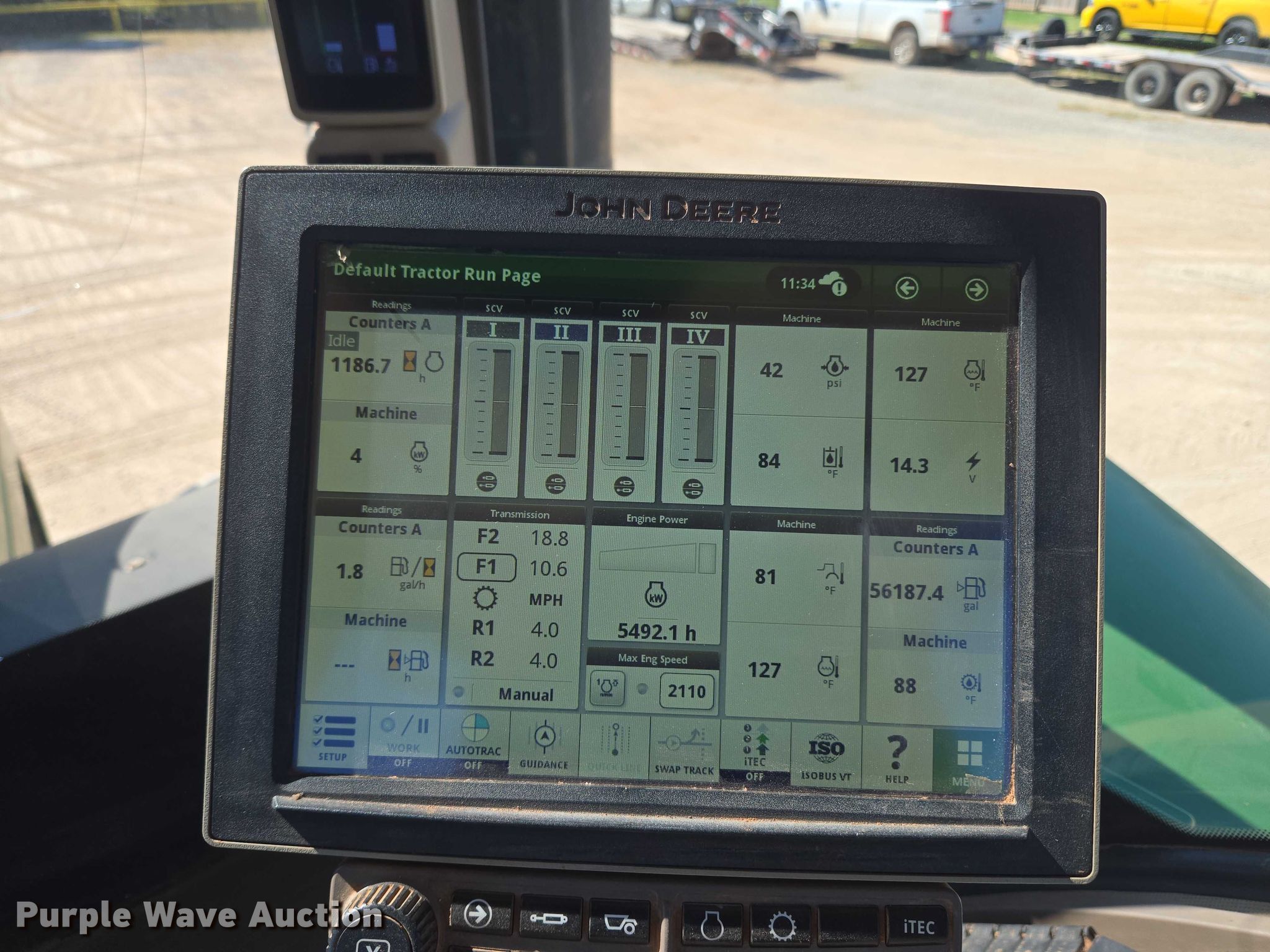 2018 John Deere 9570R Scraper Special 4WD tractor. Hours: 5,492 on meter, Serial: 1RW9570RHJE060427. Engine Cummins QSX15, Serial: 80041107, Displacement: 15.0L, Cylinders: 6, Fuel type: Diesel. Transmission Powershift, 18F - 6R, Differential lock. Operators station AC, Heat, Display John Deere. Features Seven pin outlet, ISOBUS outlet, Hydraulic remote sets, Suitcase weights: 36. Tires Size: 710/70R42, Wheel weights: 8, Duals, Front duals. Notes Glass cracked. Diamond Services Co. Oklahoma City, OK 73127