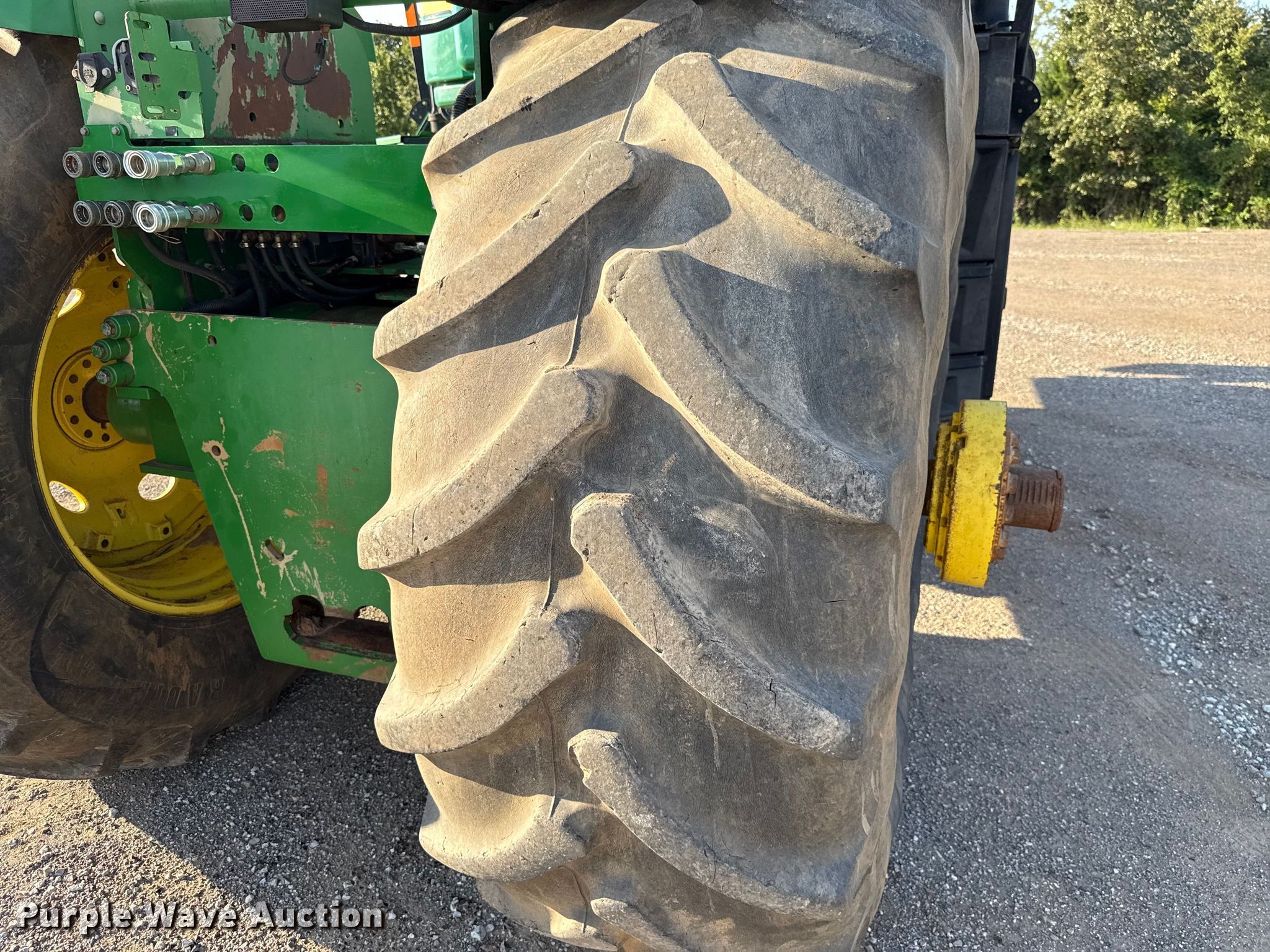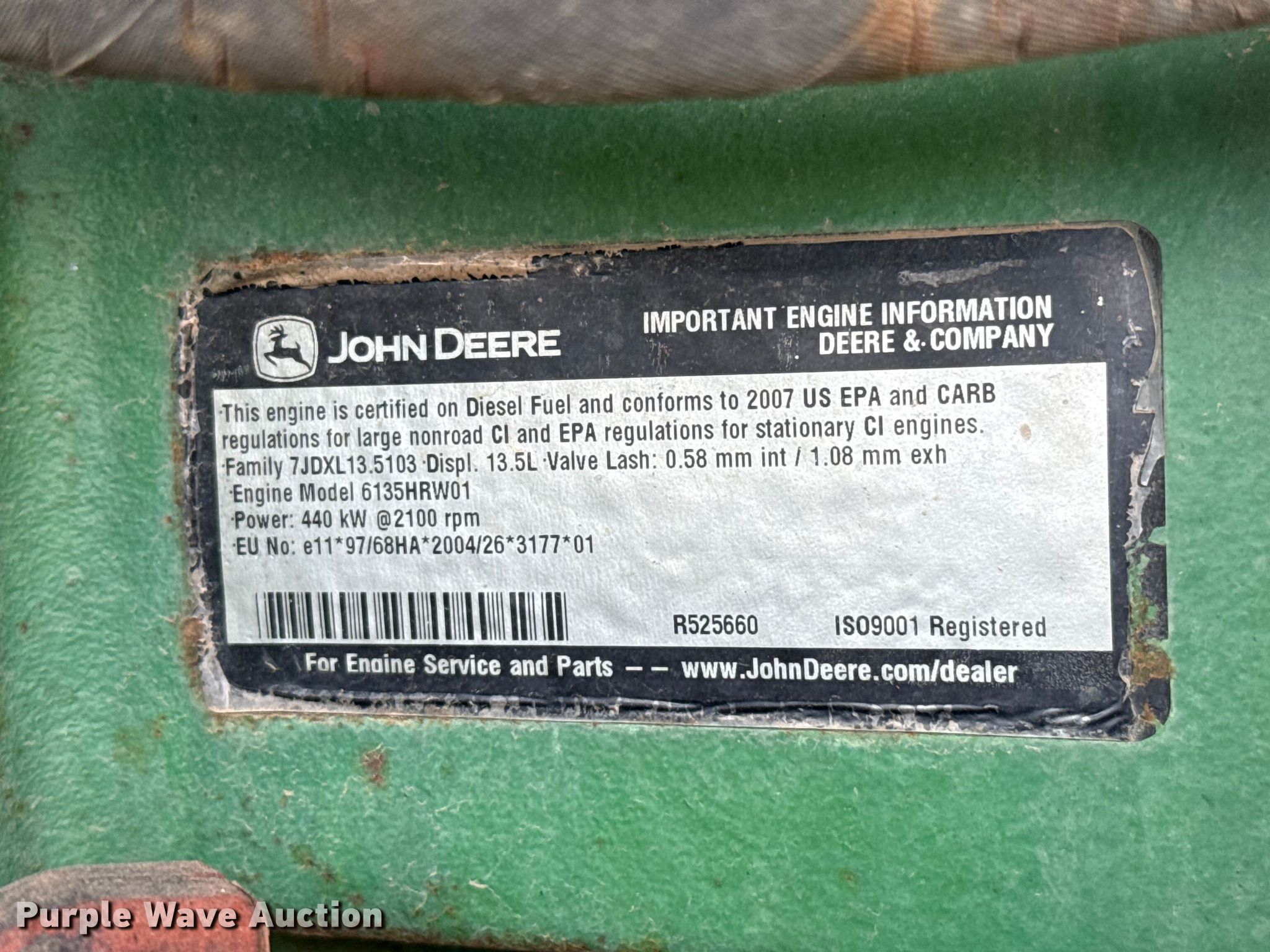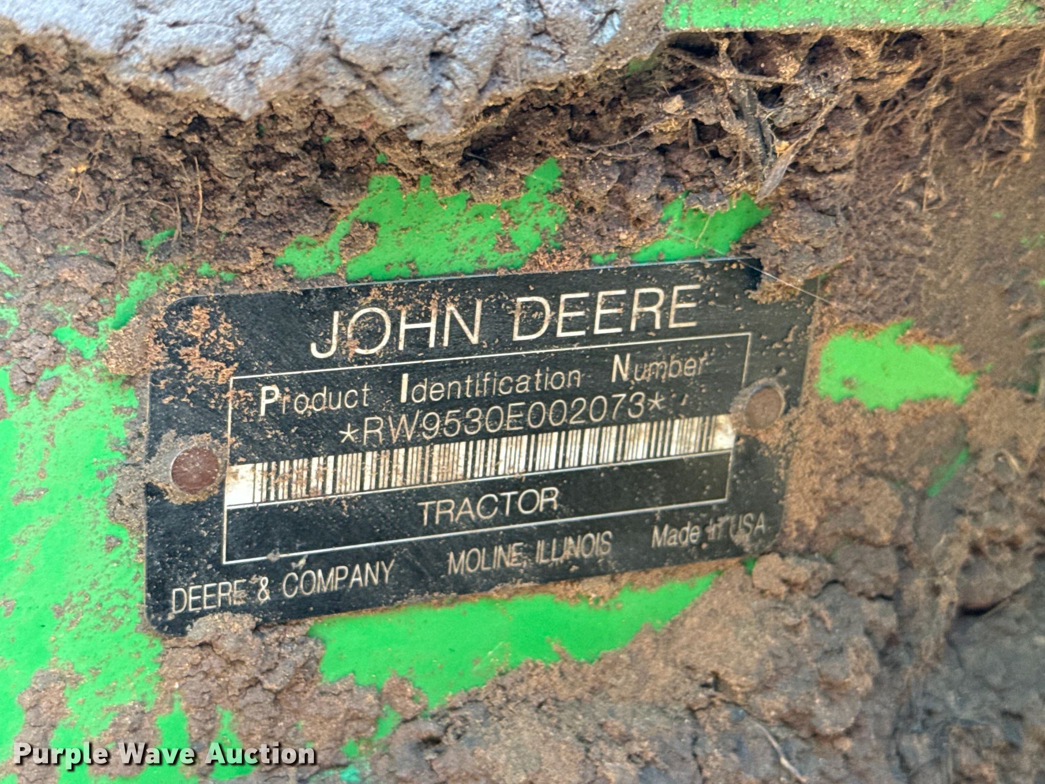 2008 John Deere 9530 Scraper Special 4WD tractor. Hours: 9,823 on meter, Serial: RW9530E002073. Engine John Deere 6135HRW01, Displacement: 13.5L, Cylinders: 6, Fuel type: Diesel, kW: 440. Transmission Powershift, 18F - 6R, Differential lock. Operators station AC, Heat. Features Seven pin outlet, ISOBUS outlet, Hydraulic remote sets Rear: 4, Suitcase weights: 22. Tires Size: 710/70R42, Duals, Front duals. Notes Transmission issues, low gear slips underload. Seminole, OK 74868
