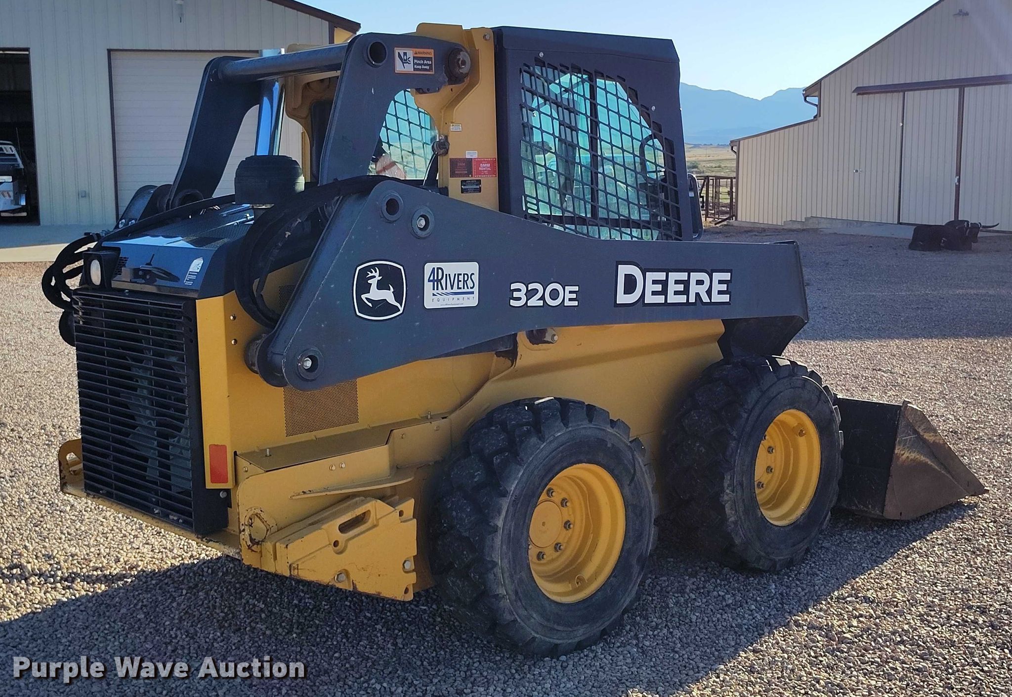 2017 John Deere 320E skid steer loader. Hours: 1,039 on meter, Serial: 1T0320EKEHJ307040. Engine John Deere, Cylinders: 4, Fuel type: Diesel. Transmission Hydrostatic, Two speed travel. Operators station Enclosed cab, AC, Heat, Bucket control: Hand. Features Auxiliary hydraulics, Quick coupler: Hydraulic, Counter weights, Bucket John Deere Worksite Pro C72, Width: 71", Cutting edge: Bolt-on. Tires Size: 12-16.5. Penrose, CO 81240