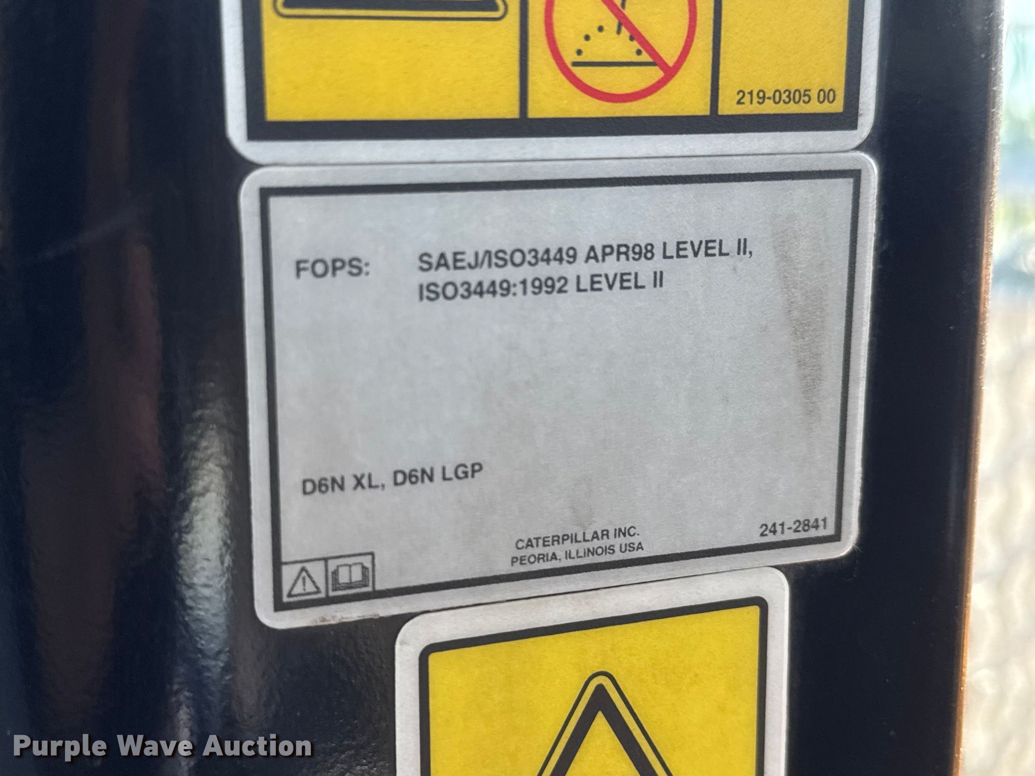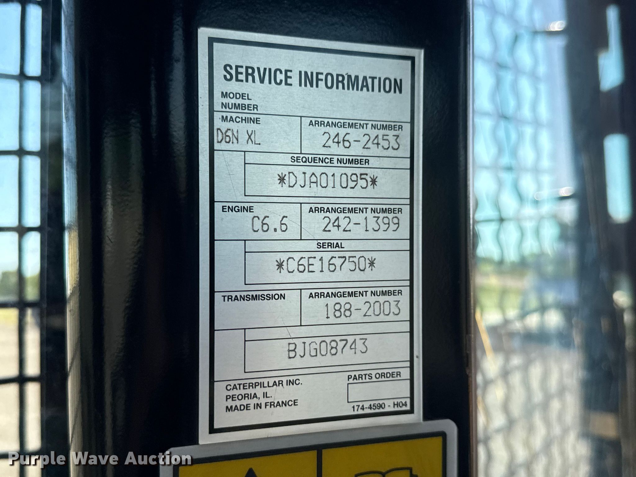 2009 Caterpillar D6N XL dozer. Hours: 7,889 on meter, Serial: CAT00DGNKDJA01095. Engine Caterpillar C6.6, Serial: FEW60141, Displacement: 6.6L, Cylinders: 6, Fuel type: Diesel. Transmission Powershift. Operators station Enclosed cab, AC, Heat, Electronic Monitoring System panel, Steering: Differential. Features Screen guards, Sweeps, Dozer blade Blade type: 6-way, Blade shape: Straight, Width: 10' 8", Attachments Ripper Model: D6N Ripper, Shanks: 3.. Tracks Width: 24", Grouser pads: Single, Bottom rollers: 7, Track guards. Notes Glass cracked. Collinsville, OK 74021