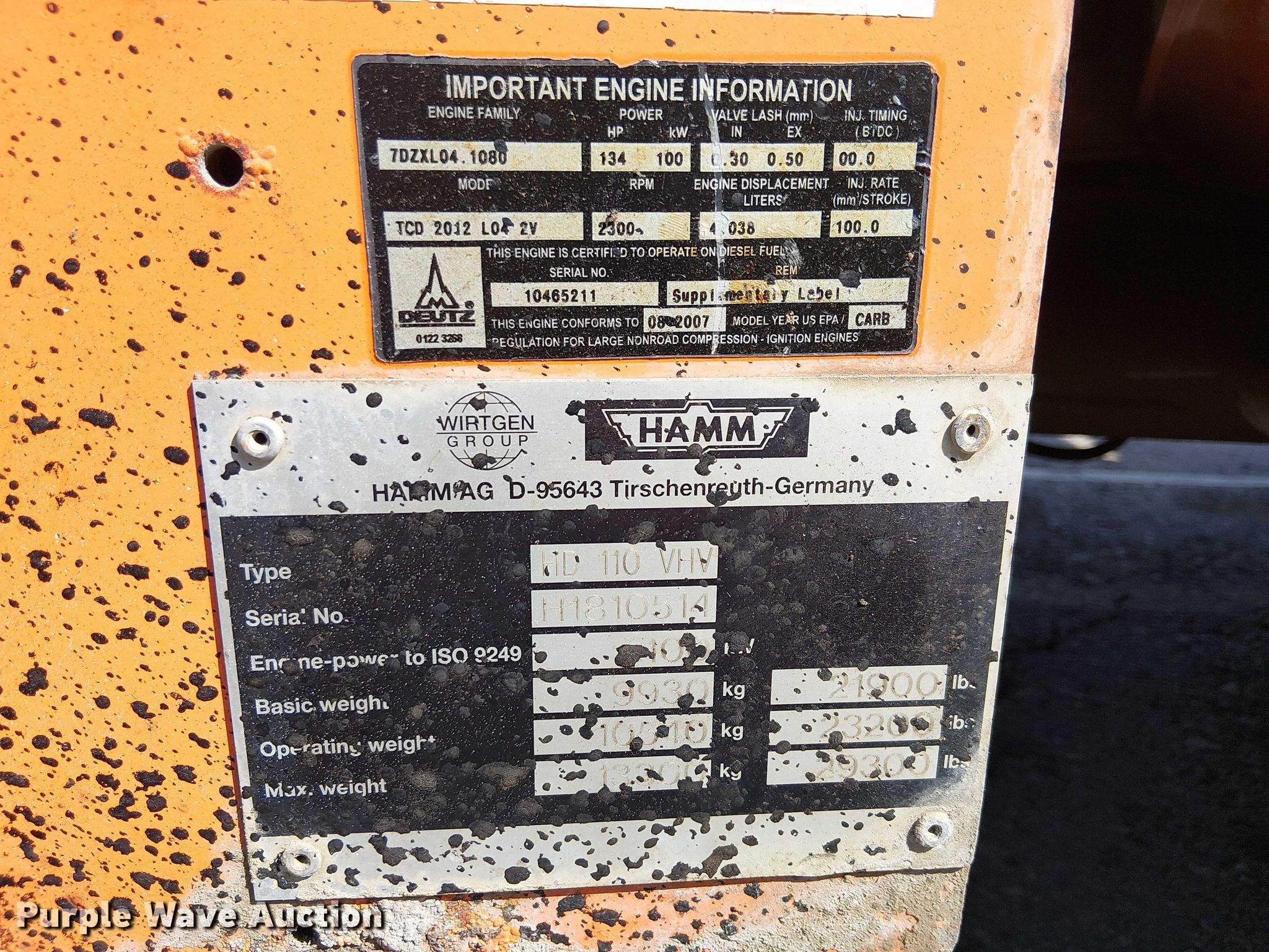 2009 Hamm HD110 double drum vibratory roller. Hours: Unknown, Serial: H1810514. Transmission Hydrostatic. Operators station OROPS, Vandal cover. Features Drum type: Smooth, Front drum Width: 66", Diameter: 47", Rear drum Width: 66", Diameter: 47". Notes Fire damage , Non-operational unit. Construction inventory reduction, stored at a secured facility. Please review REQUIRED REMOVAL INSTRUCTIONS. Pavewest Inc. Colton, CA 92324