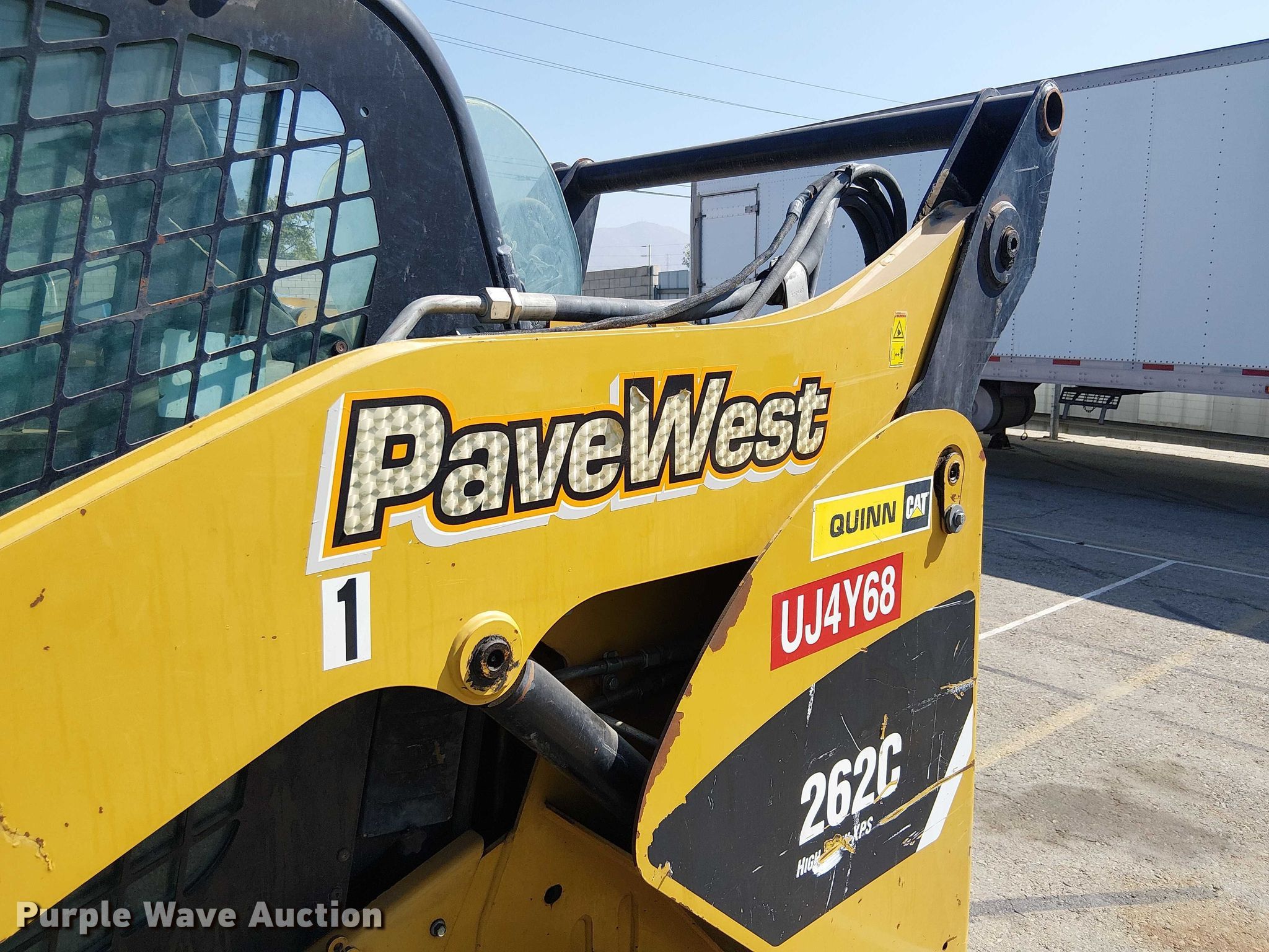 2012 Caterpillar 262C skid steer loader. Hours: 3,473 on meter, Serial: CAT0262CJMST05224. Engine Caterpillar C3.4, Displacement: 3.3L, Cylinders: 4, Fuel type: Diesel, HP: 84. Transmission Hydrostatic. Operators station Enclosed cab, Bucket control: Hand. Features Auxiliary hydraulics, Quick coupler: Hydraulic. Tires Size: 33X12-20, Solid. Notes Glass cracked, Non-operational unit. Construction inventory reduction, stored at a secured facility. Please review REQUIRED REMOVAL INSTRUCTIONS. Pavewest Inc. Colton, CA 92324