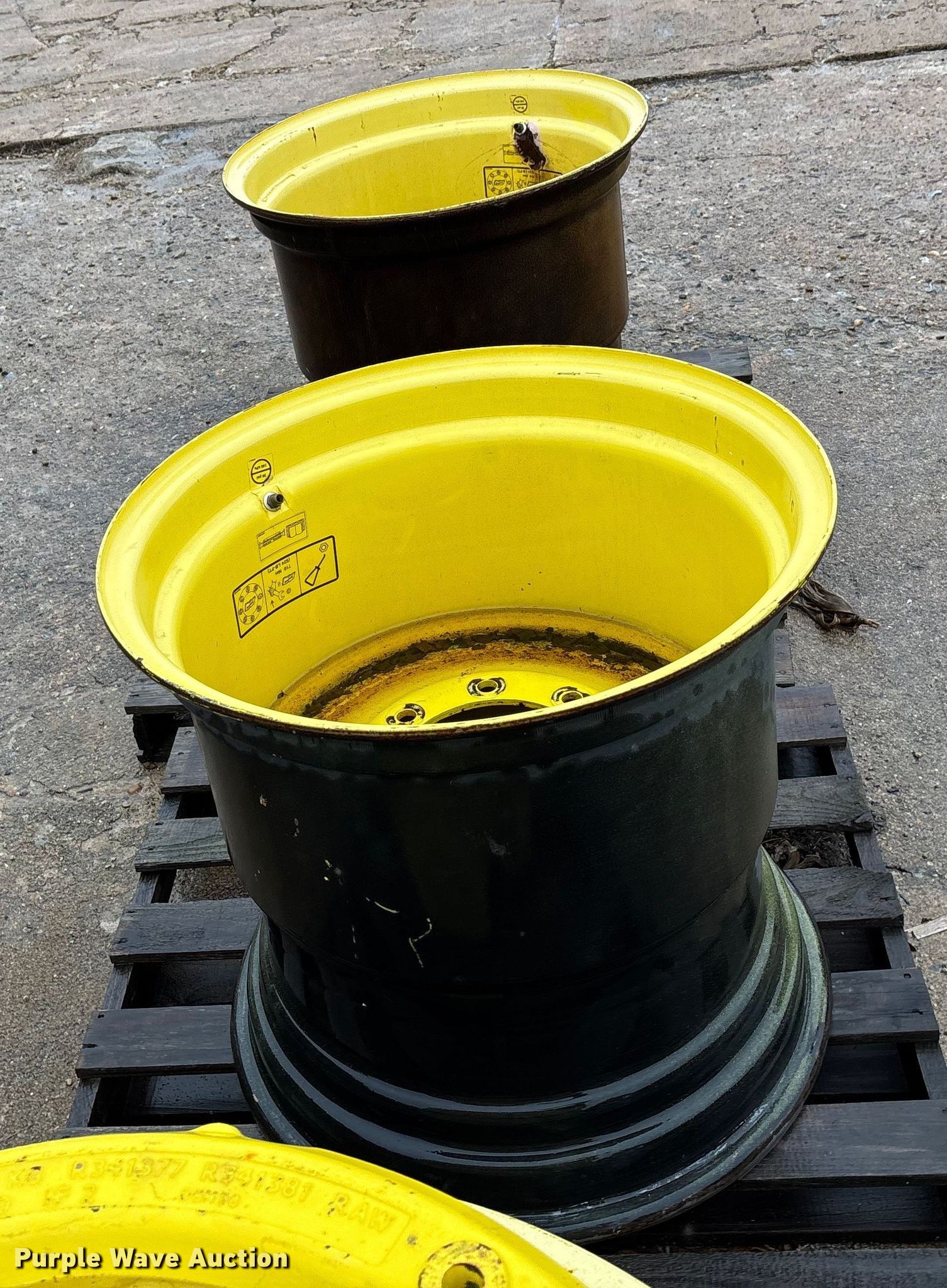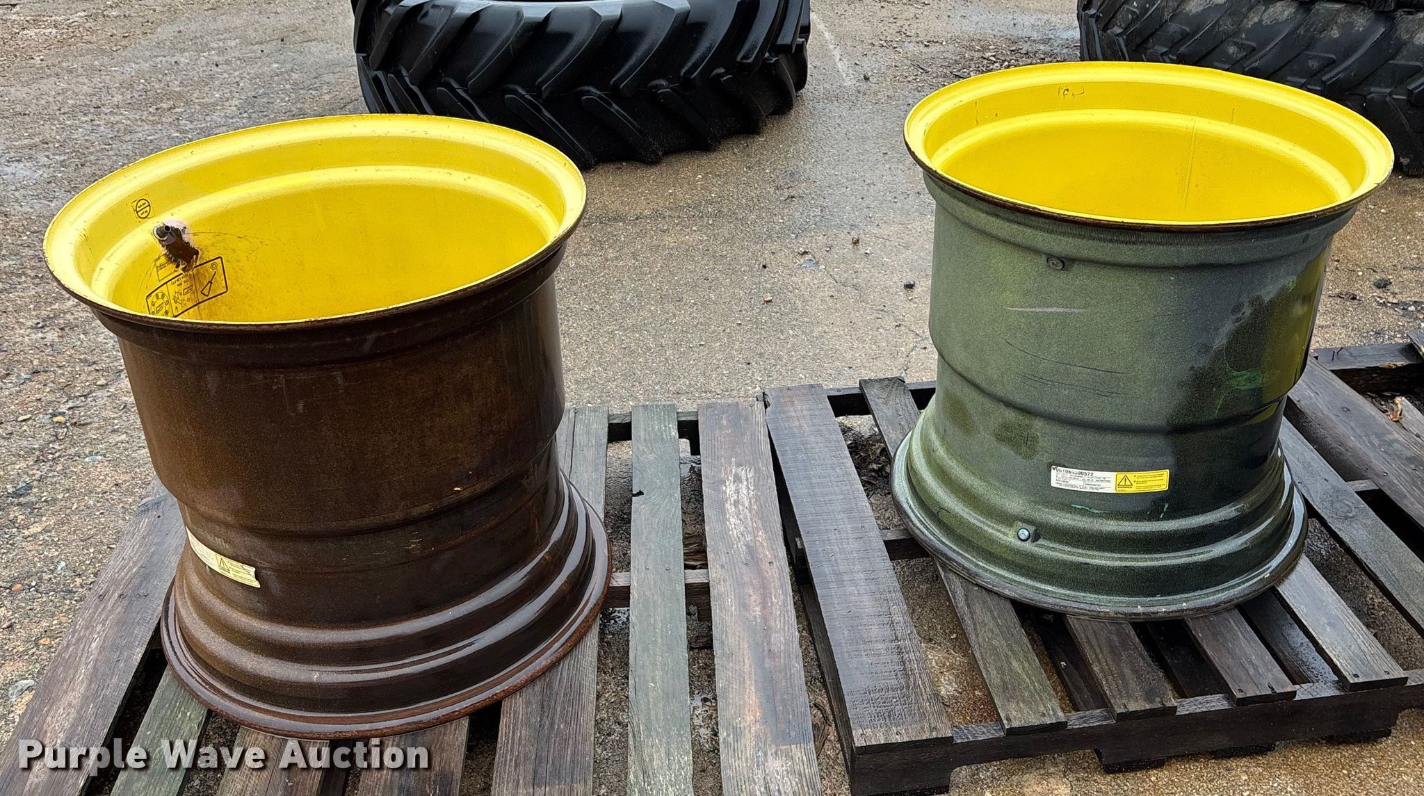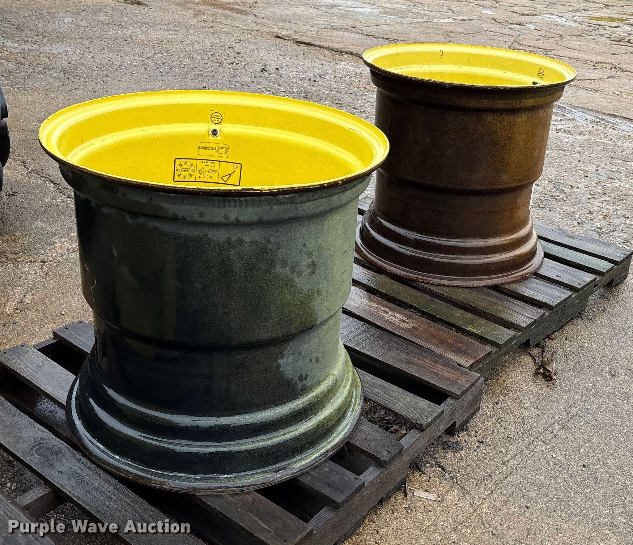 Purple Wave is selling a used Industrial Tires or Tracks in Kansas. This item is a (2) wheels with the following: Removed from John Deere S670 combine, Damaged, cracked