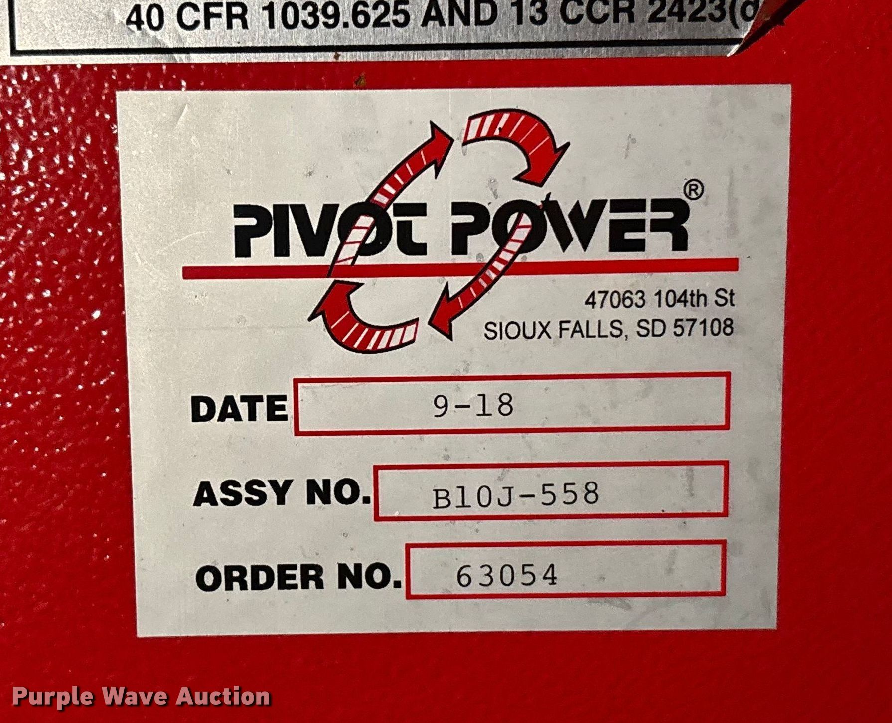 Purple Wave is selling a used Irrigation Pump in Kansas. This item is a Pivot Power irrigation pump with the following: Hours: 963 on meter, Serial: B10J-558