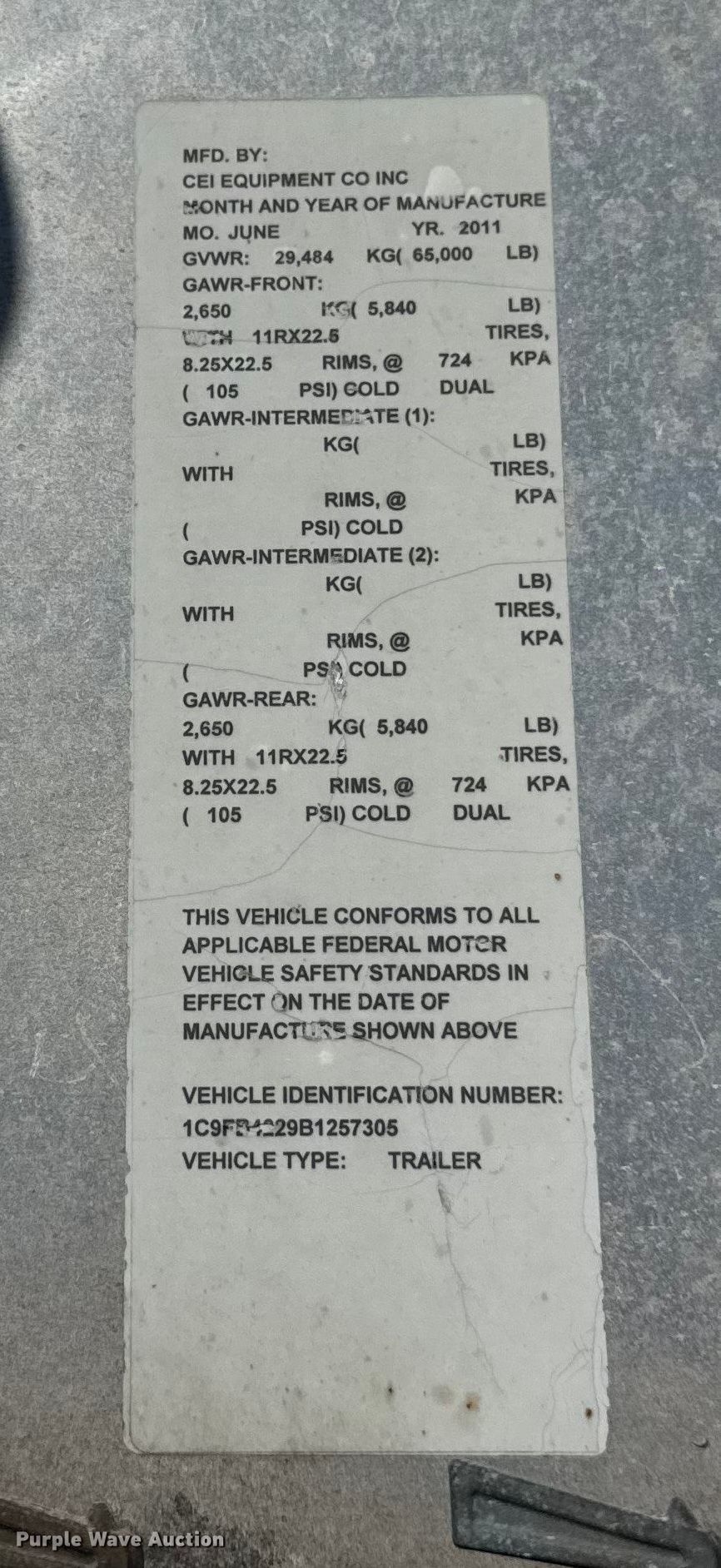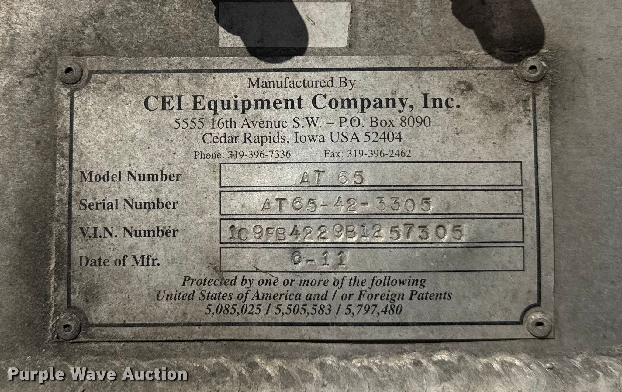 Purple Wave is selling a used Fertilizer or Feed Delivery Trailer in Wisconsin. This item is a 2011 CEI Pacer AT65 fertilizer delivery trailer with the following: VIN: 1C9FB4229B1257305, Unit #: 611