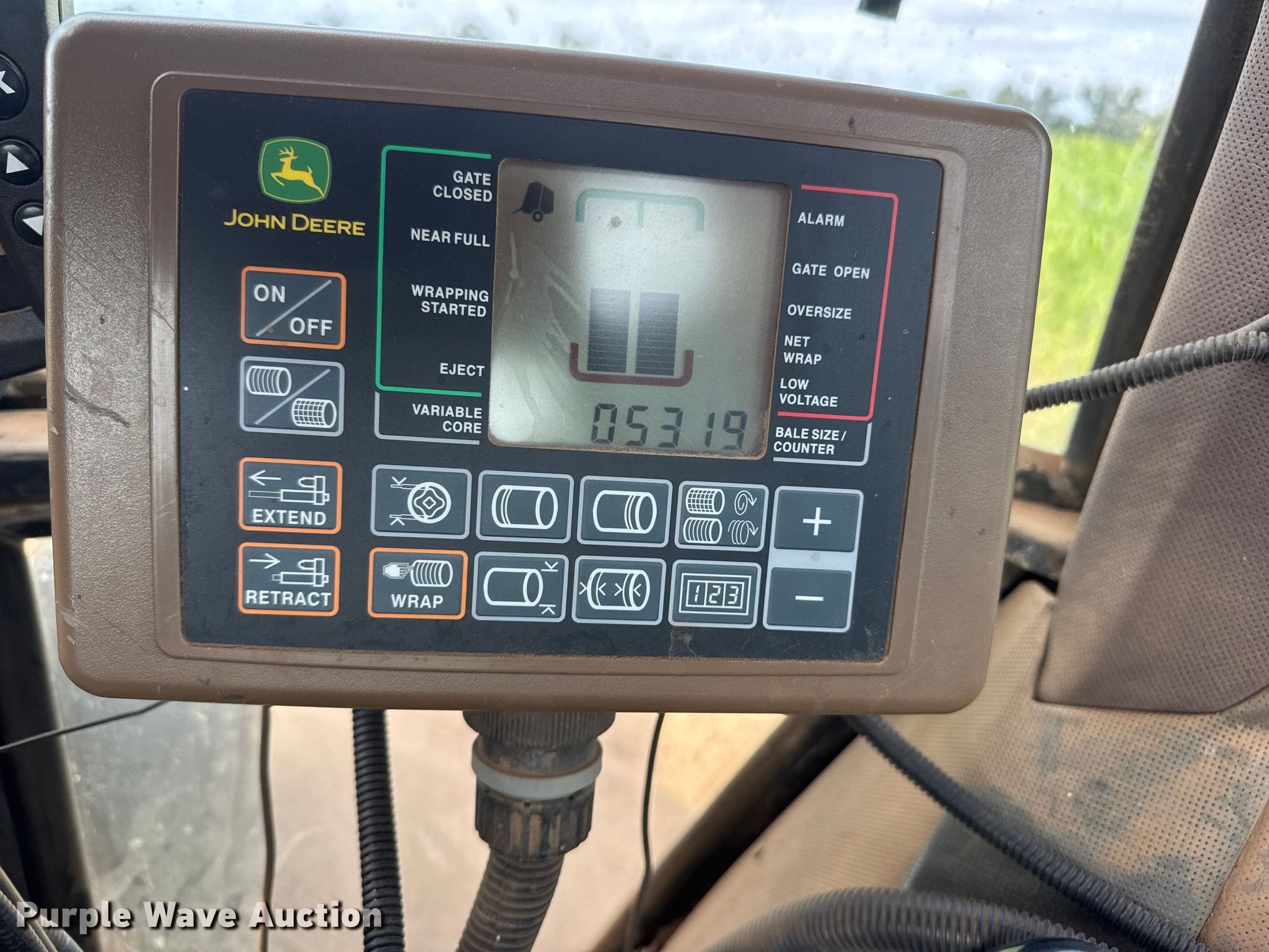 2015 John Deere 569 Mega Wide Plus round baler. Bale count: 5,319, Serial: 1E00569XHFF410935. Features PTO: 1 3/4" 1000, Monitor John Deere, Transport lights, Feed assist roller, Gauge wheels Size: 4.80-3.75, Pickup width: 6', Hydraulic pickup lift, Bale size: 5' x 6', Net-wrap, Bale kicker. Tires Size: 21.5L-16.1. Notes Tractor not included. Sharon, KS 67138