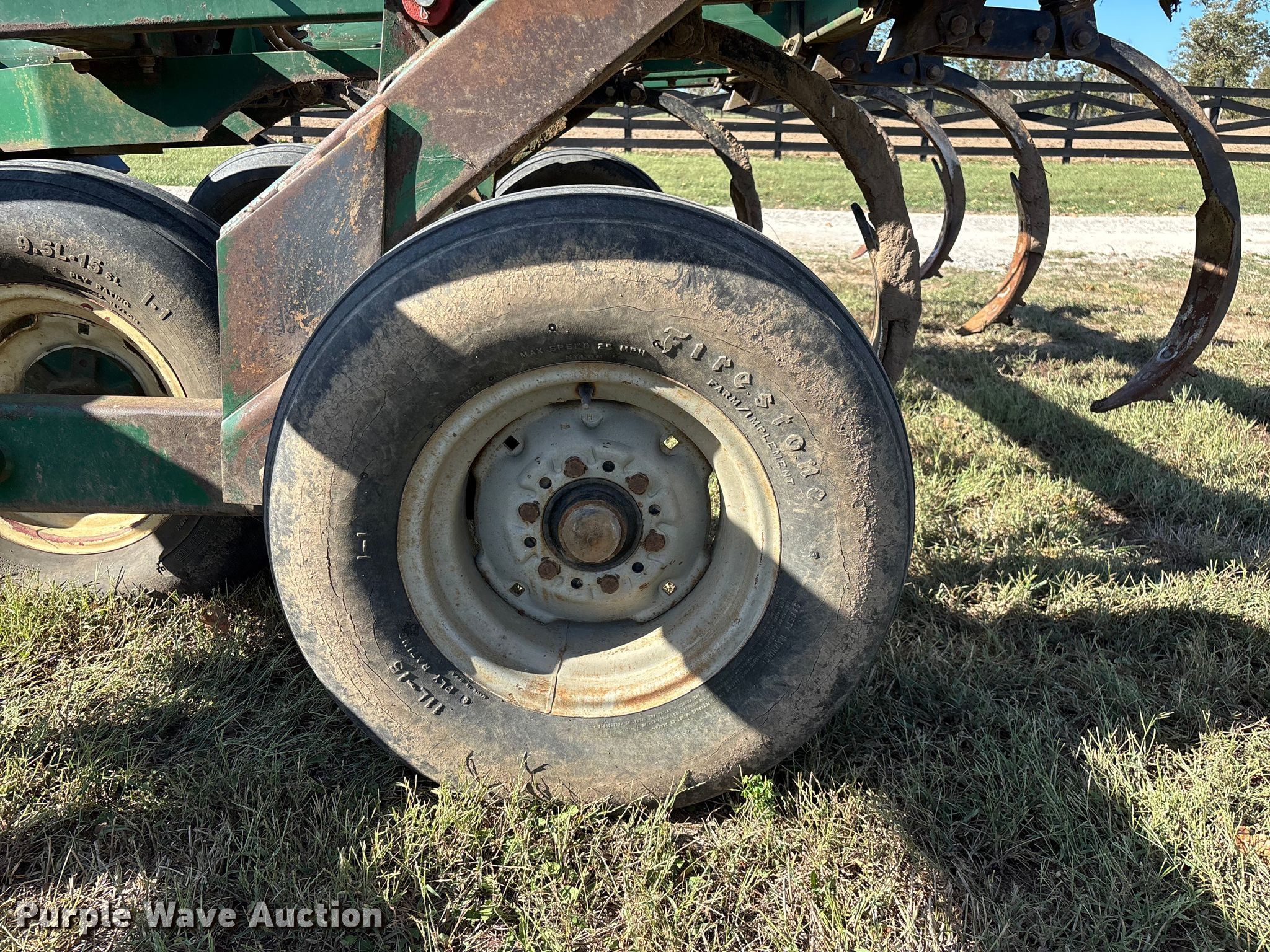 Glencoe disk ripper. Overall width: 12' 9". Features Shanks: 11, Blade diameter Front: 19", Spacing: 8", Operation Hydraulic lift, Walking tandem axle. Tires Tire size: 9.5L-15 (1) 11L-15 mixed in. Notes Tractor not included. Glen Reiff. Sheldon, MO 64784