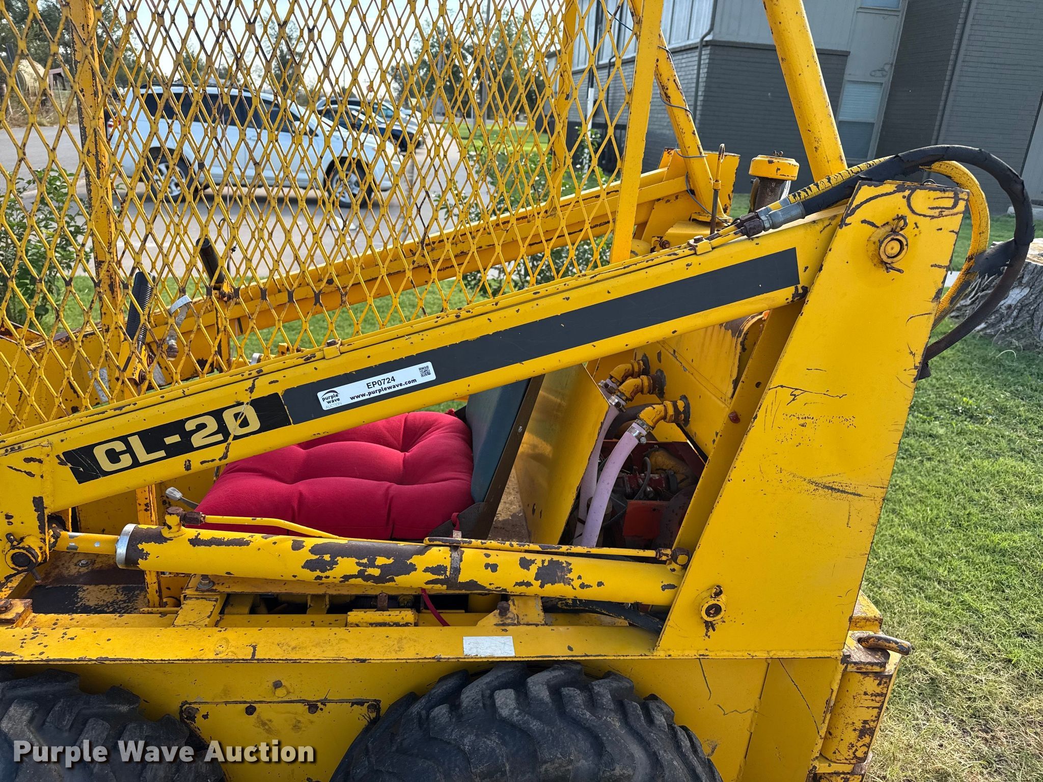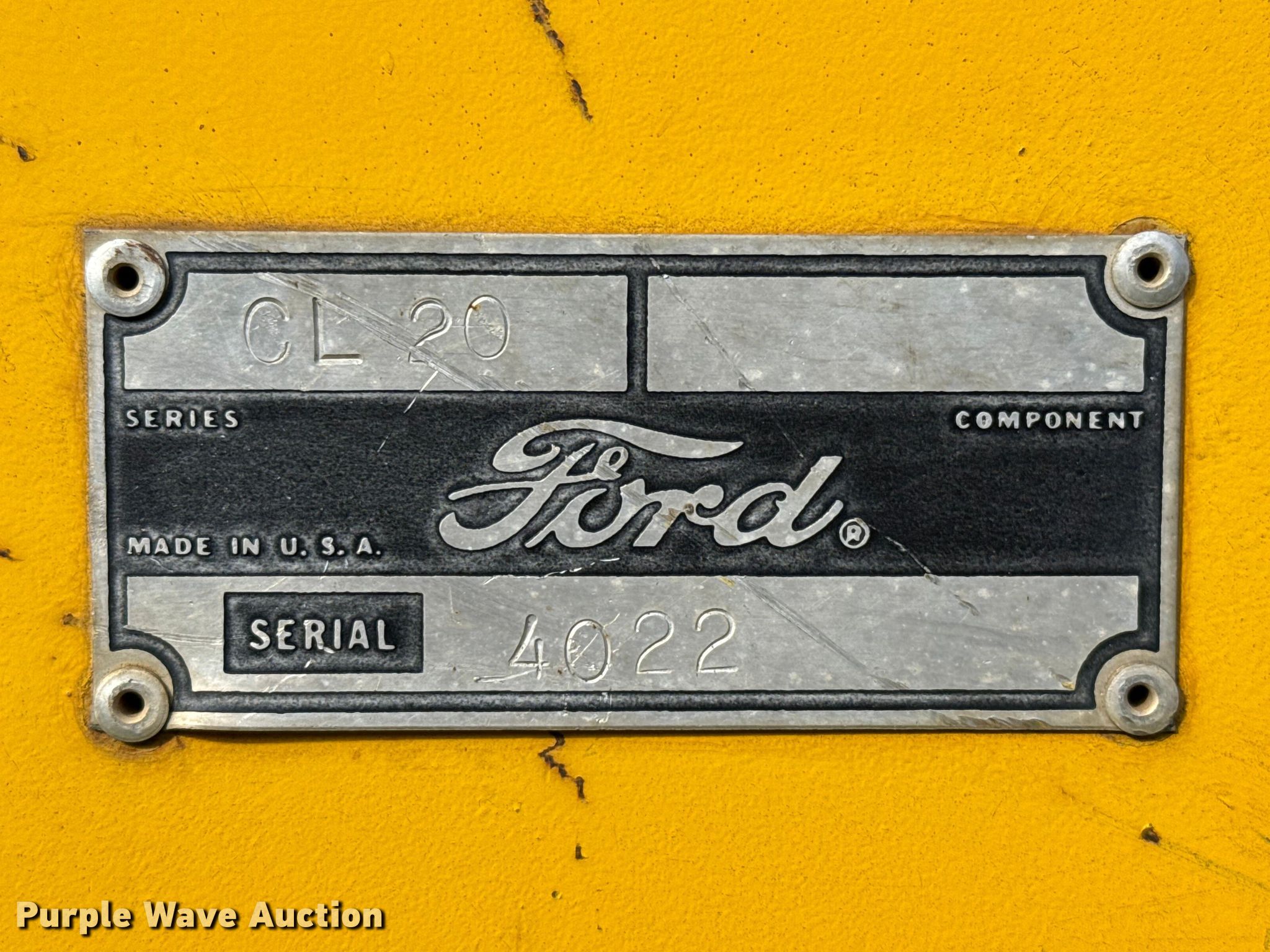 1975 Ford CL20 skid steer loader. Serial: 4022. Engine Onan, Cylinders: 2, Fuel type: Gas. Transmission Hydrostatic. Operators station Bucket control: Hand. Features Bucket Width: 45". Tires Size: 27x8.50-15. Laverne, OK 73848