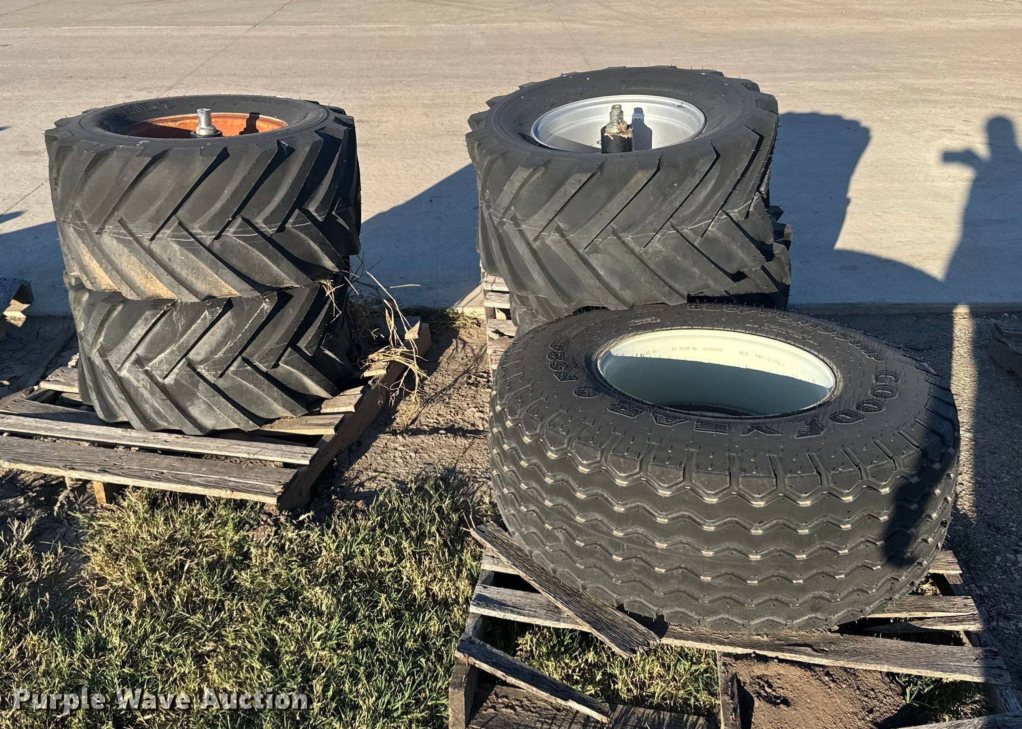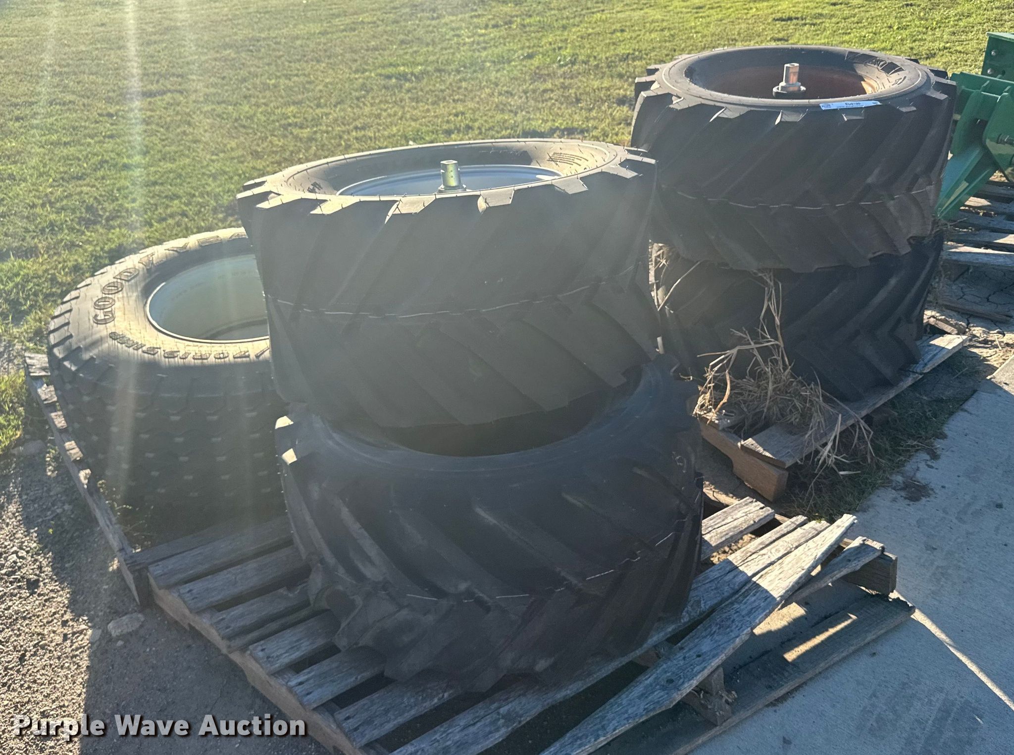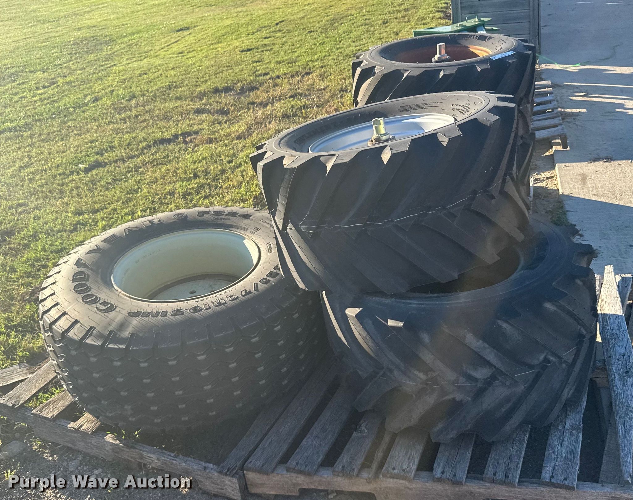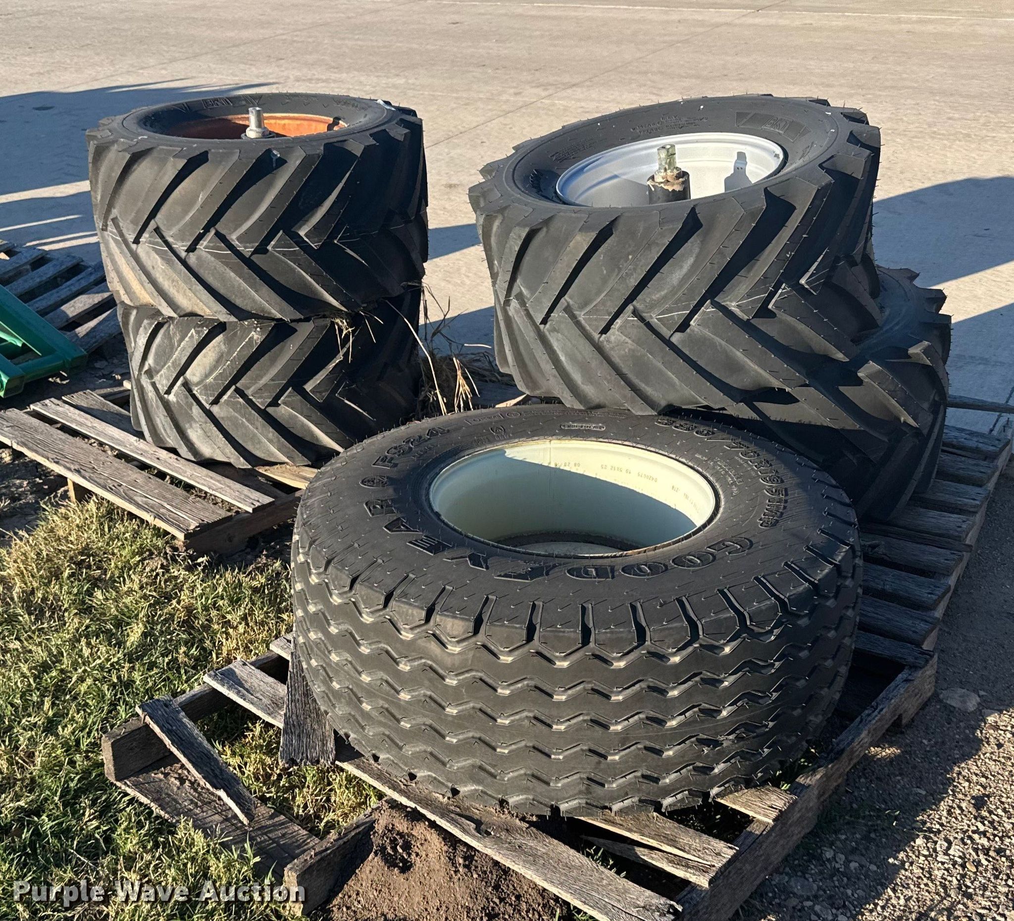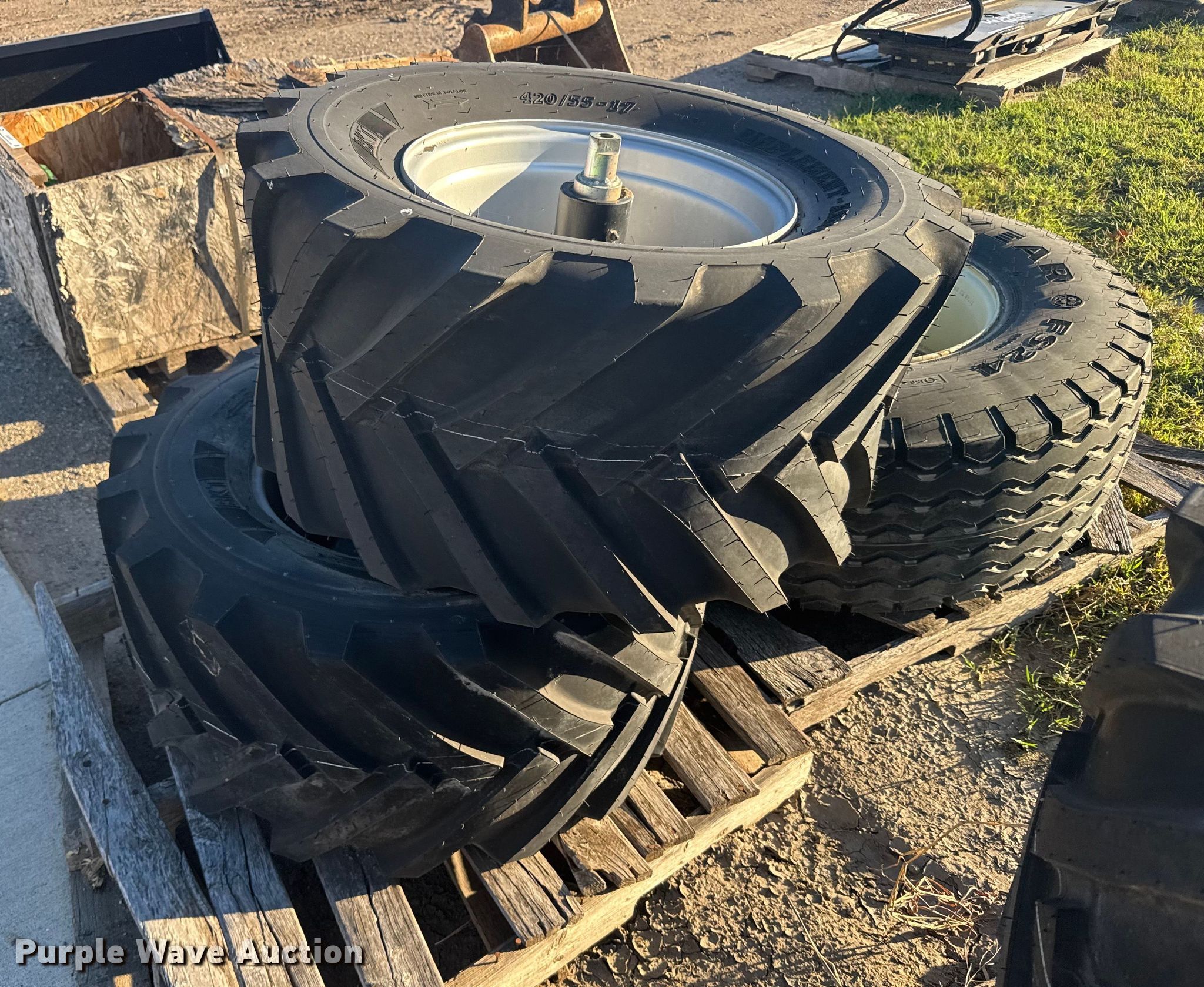 Purple Wave is selling a used Industrial Tires or Tracks in Kansas. This item is a (5) skid steer tires and wheels with the following: (4) 420/55-17, 380/70R19.5