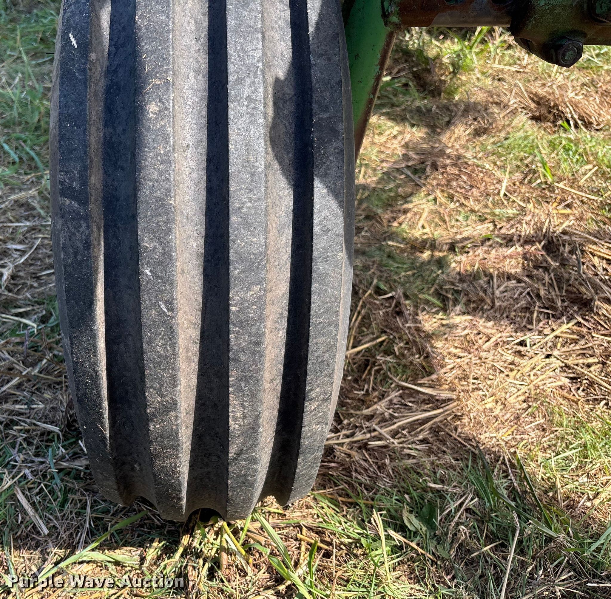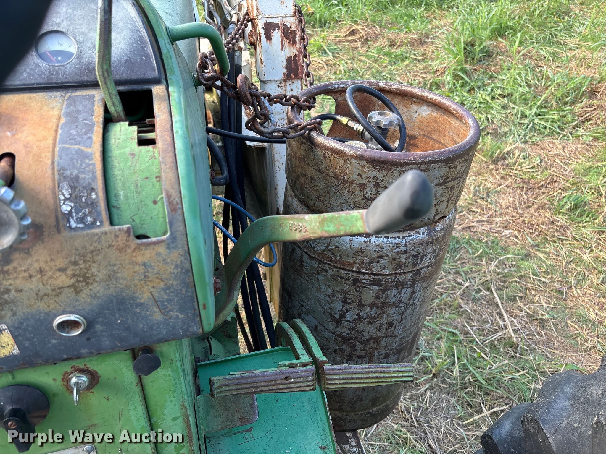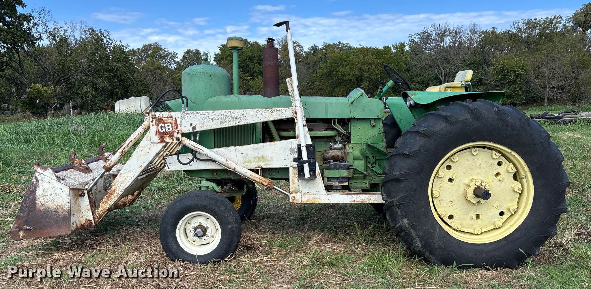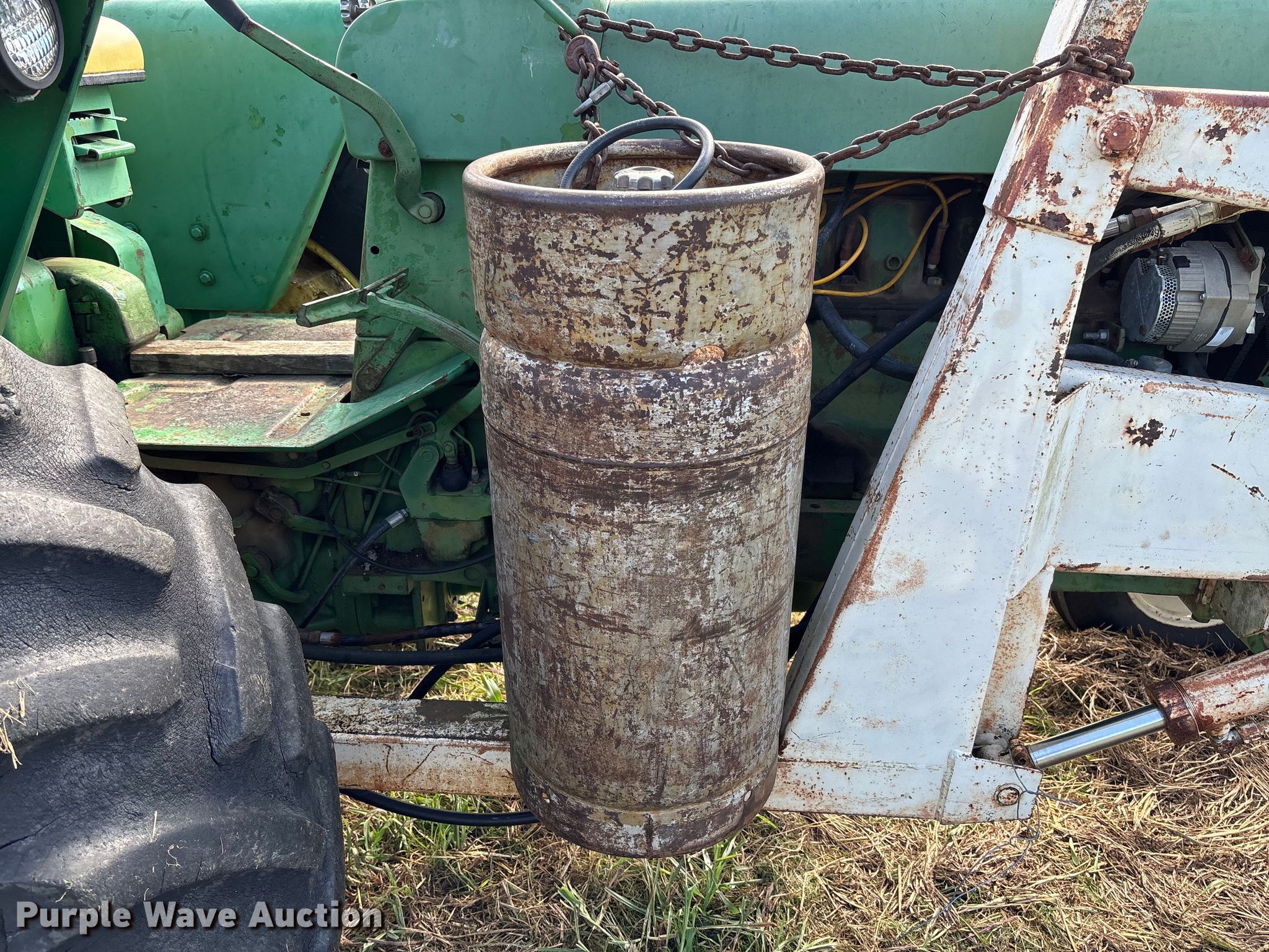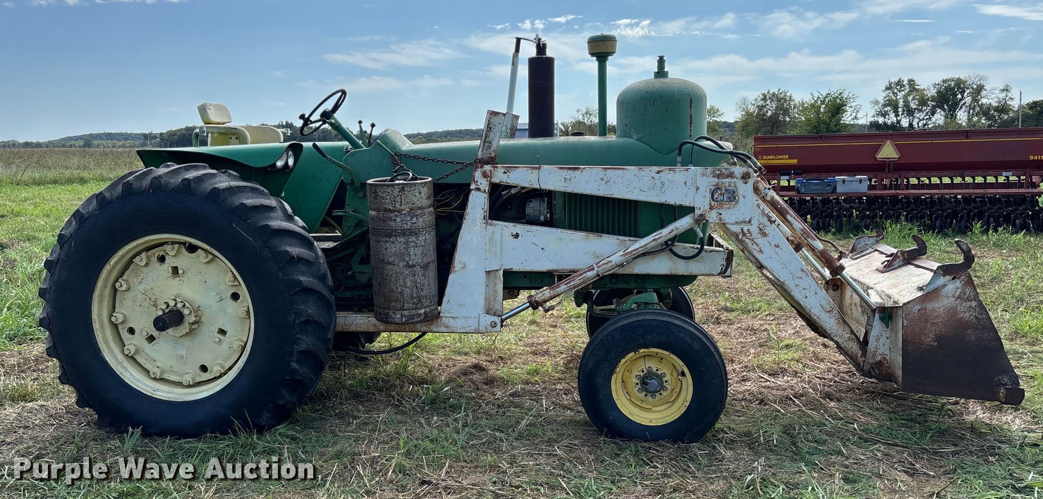1965 John Deere 4020 tractor. Hours: 4,830 on meter, Serial: SNT212R109512R. Engine John Deere, Cylinders: 6, Fuel type: LPG. Transmission Synchro, 8F - 2R, Differential lock. Features PTO: 540, 1000, Three point Top link, Hydraulic remote sets Rear: 2, Loader Controls: Two-lever, Bucket Width: 61", Bale spear Spear missing. Tires Front: 11L-15, Rear: 18.4-34, Wheel weights: 2. Notes Jump start required during on-site data collection. Havana, KS 67347