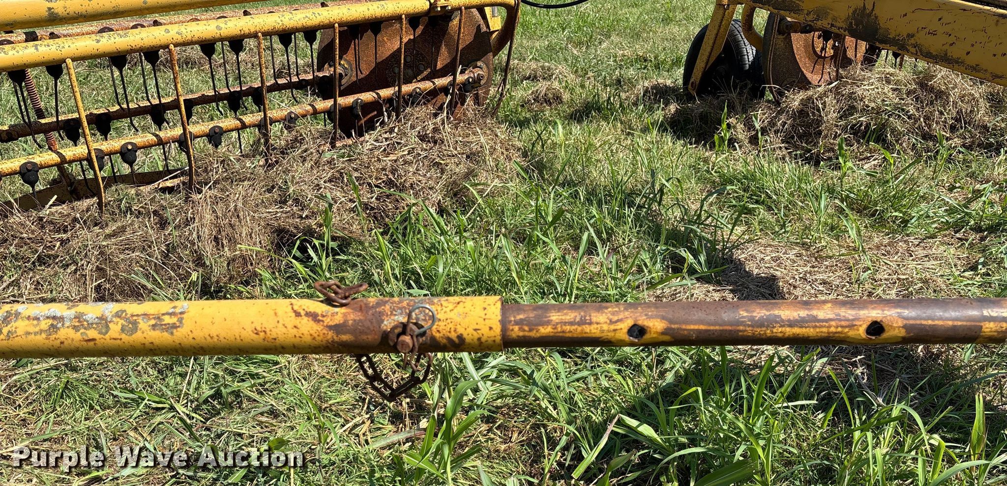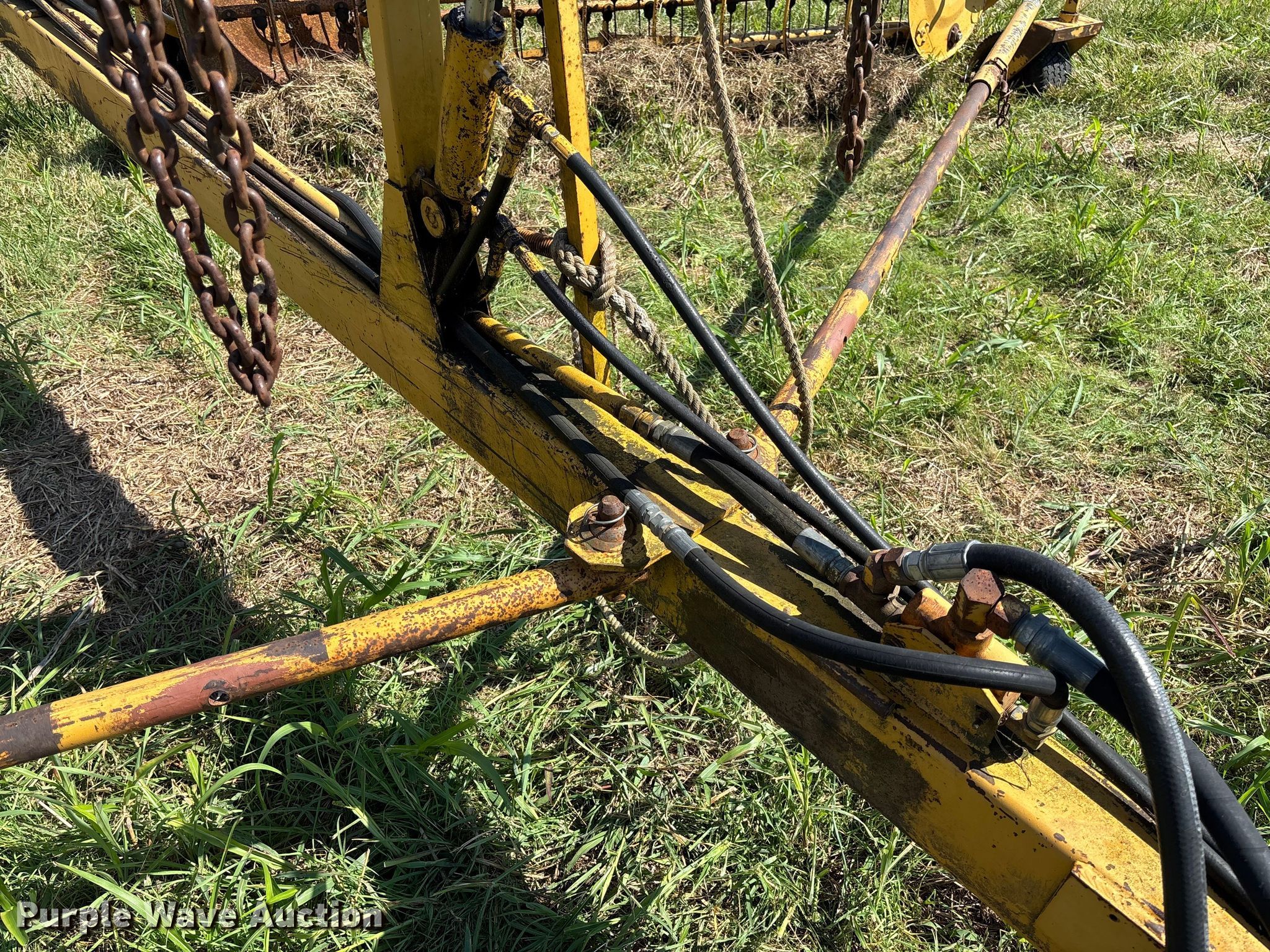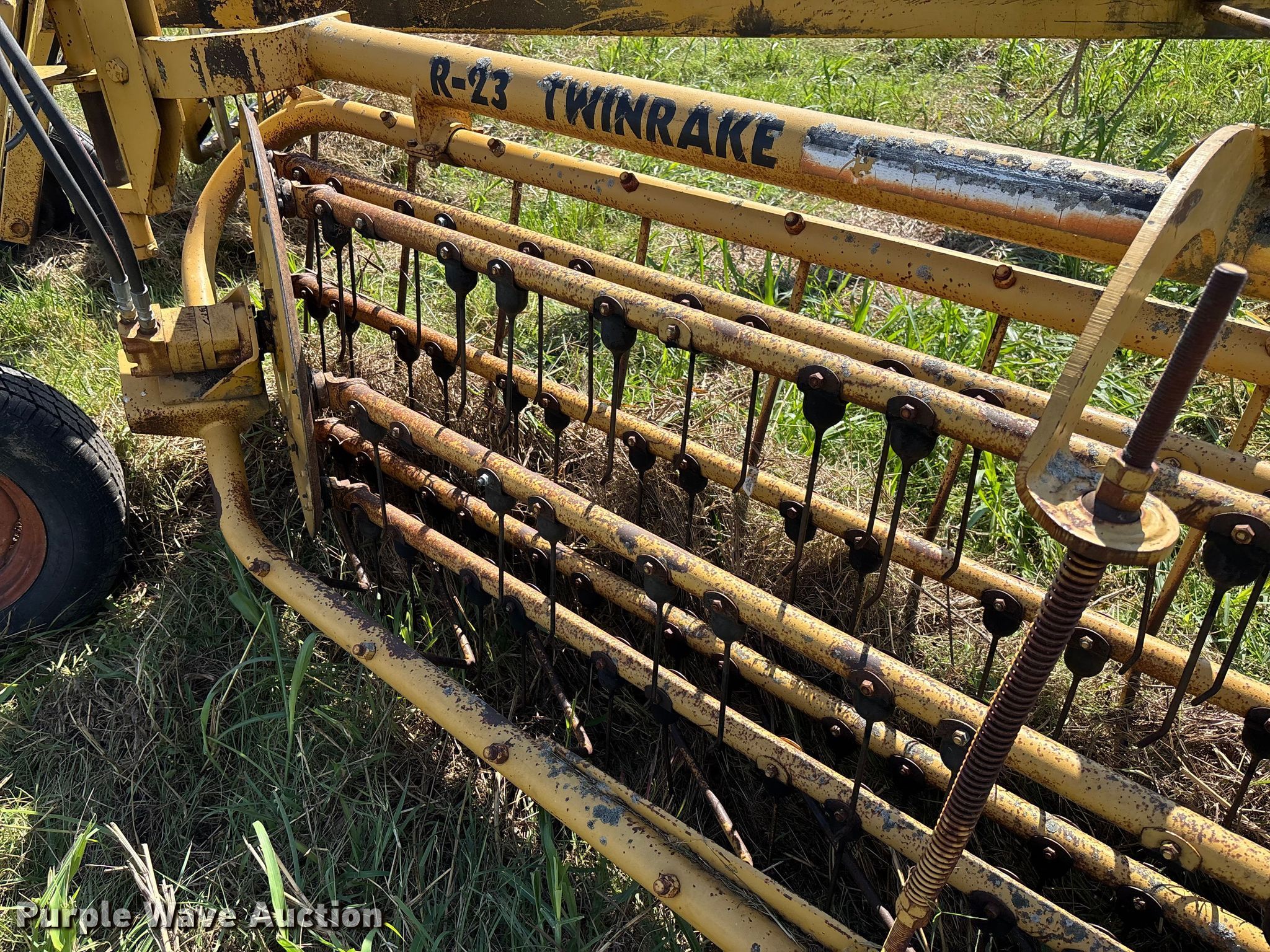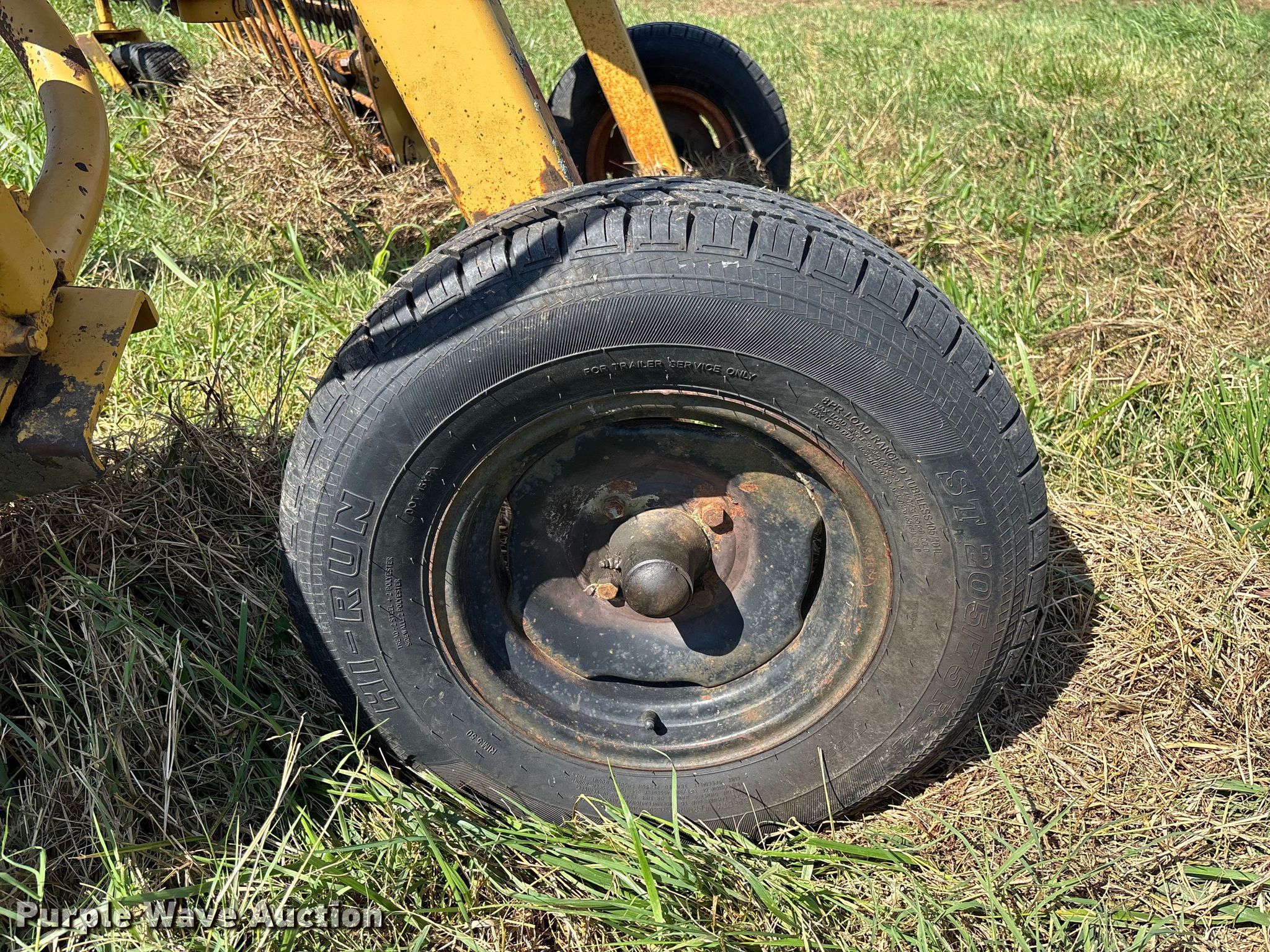 1990 Vermeer R-23 hay rake. Serial: 1VRA201H6L1001882. Features Width: 23', Hydraulic lift, Hydraulic driven, Hitch: Pin. Tires Size: 205/75R14. Notes Flat tires. Havana, KS 67347