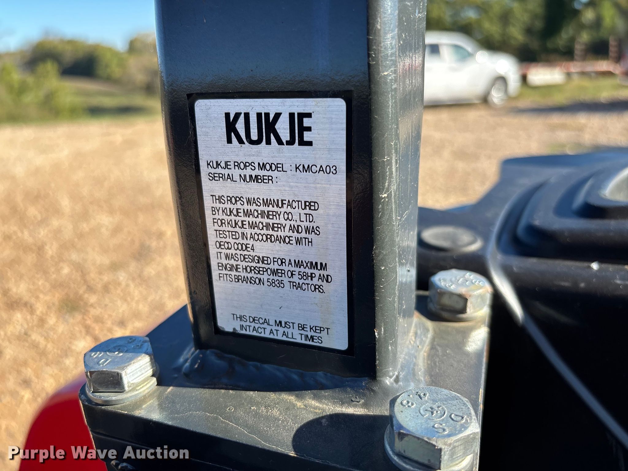 Branson 5835R MFWD tractor. Hours: 266 on meter. Engine Kukje Machinery A2300T1, Serial: TERK00120, Displacement: 2.29L, Cylinders: 4, Fuel type: Diesel, HP: 58. Transmission Synchro, 24F - 24R, Left-hand reverser, Differential lock. Features PTO: 540, Three point Top link, Quick attach, Hydraulic remote sets Rear: 1, Loader Branson BL350, Controls: Joystick, Bucket Width: 72".. Tires Front: 10.5/80-18, Rear: 16.9-24, Duals. Notes Unattached dual tires and wheels included. Pineville, MO 64856