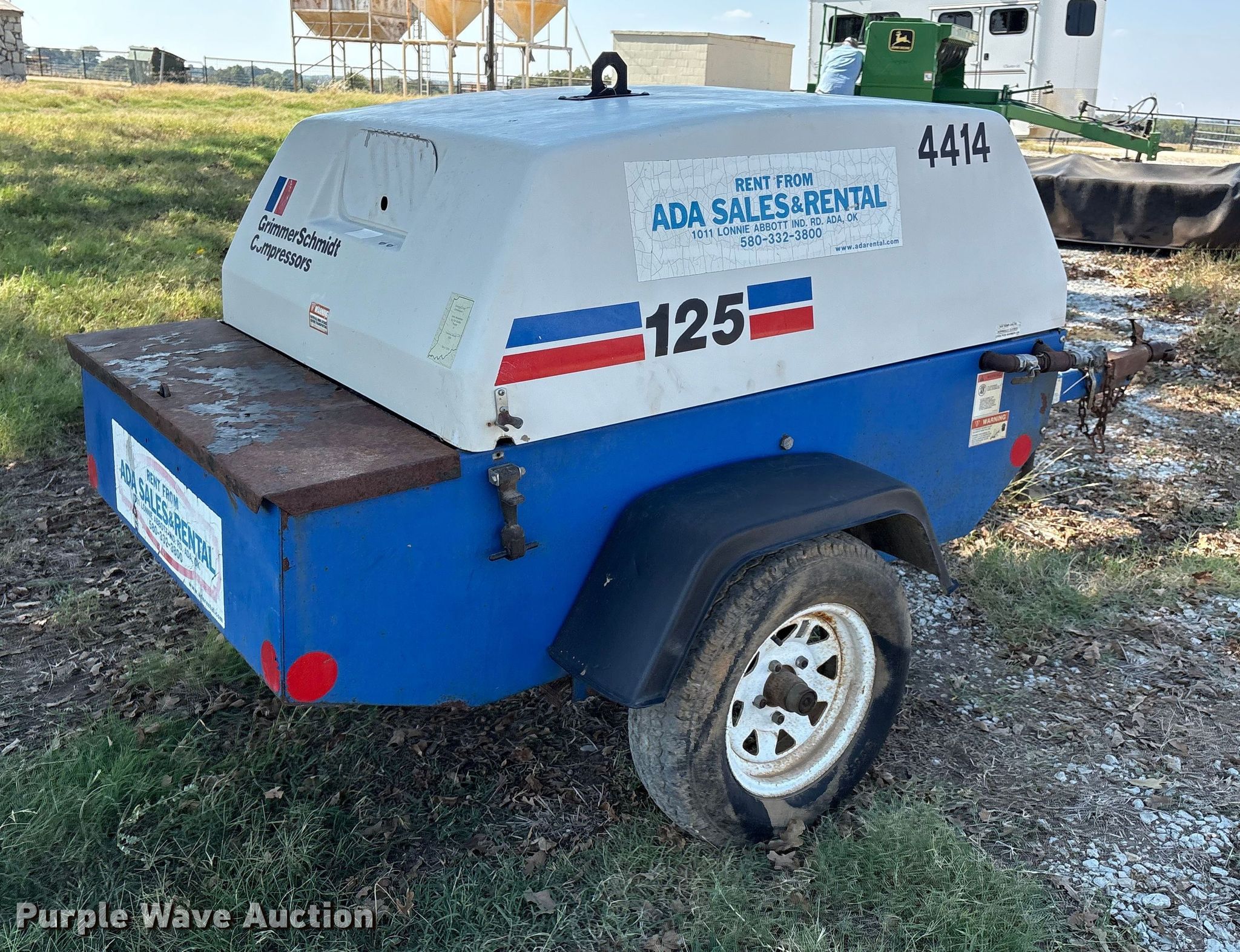Grimmer Schmidt 125 air compressor. Hours: 984 on meter, Serial: 50289. Engine Ford, Cylinders: 4, Fuel type: Gas. Features Air compressor CFM: 125, PSI: 100. Trailer 10' L x 6" W, Ball hitch size: 2", Suspension: Spring, Axles: Single, Tire size: 175/80D13. Notes Non-operational unit. Transfer of ownership documentation will be a bill of sale. Robson Ranch. Connerville, OK 74836