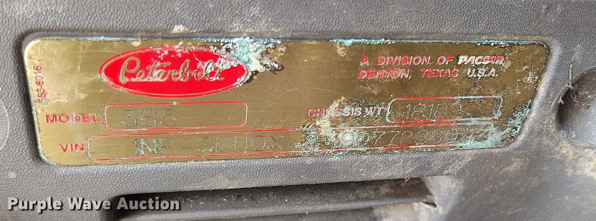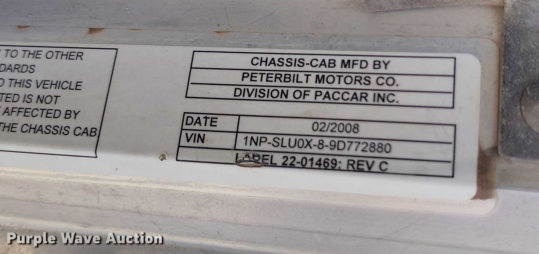 2009 Peterbilt 365 fuel / lube truck. Miles: 200,293 on odometer, Hours: 1,025 on meter, VIN: 1NPSLU0X89D772880. Engine Caterpillar C13 Acert, Displacement: 12.5L, Cylinders: 6, Fuel type: Diesel. Transmission Eaton Fuller, Manual. Chassis Axles: Tandem, Differential lock: Full, Suspension: Spring over walking beam, Brakes: Air, PTO, GVWR: 64,180 lbs. Interior AC, Heat, Heated mirrors, Power windows, Cruise control. Features Bed Tank bed, Length: 22' 2", Width: 96", Capacity: 1,900 gallons, Compartments: 1, Hose reels: 11, Nozzles, Metered pumps: 1 Make: Veers Root, Oil/lube reservoirs Hydraulic fluid, Grease, Motor oil, Used oil.. Tires Front: 315/80R22.5, Rear: 11R24.5. Notes Dash warning indicator: ABS, Windshield chipped or cracked, Jump start required during on-site data collection, Possible corrosion damage, Unknown operating condition of bed components. Utah title. Title distribution may be delayed up to 30 days from verification of funds. Sun Coast Resources. North Salt Lake, UT 84054