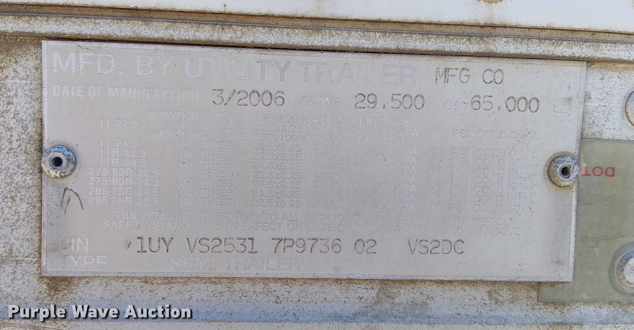 2007 Utility VS2DC dry van trailer. VIN: 1UYVS25317P973602. Dimensions Overall Length: 53', Width: 102". Features Deck type: Wood. Chassis Landing gear: Dual, Suspension: Air, Brakes: Air, Axles: Tandem Sliding, GVWR: 65,000 lbs, GAWR: 19,000 lbs. Tires Steel wheels, Size: 295/75R22.5. Missouri title. Title distribution may be delayed up to 14 days from verification of funds. LT Delivery, Inc.. Northmoor, MO 64151