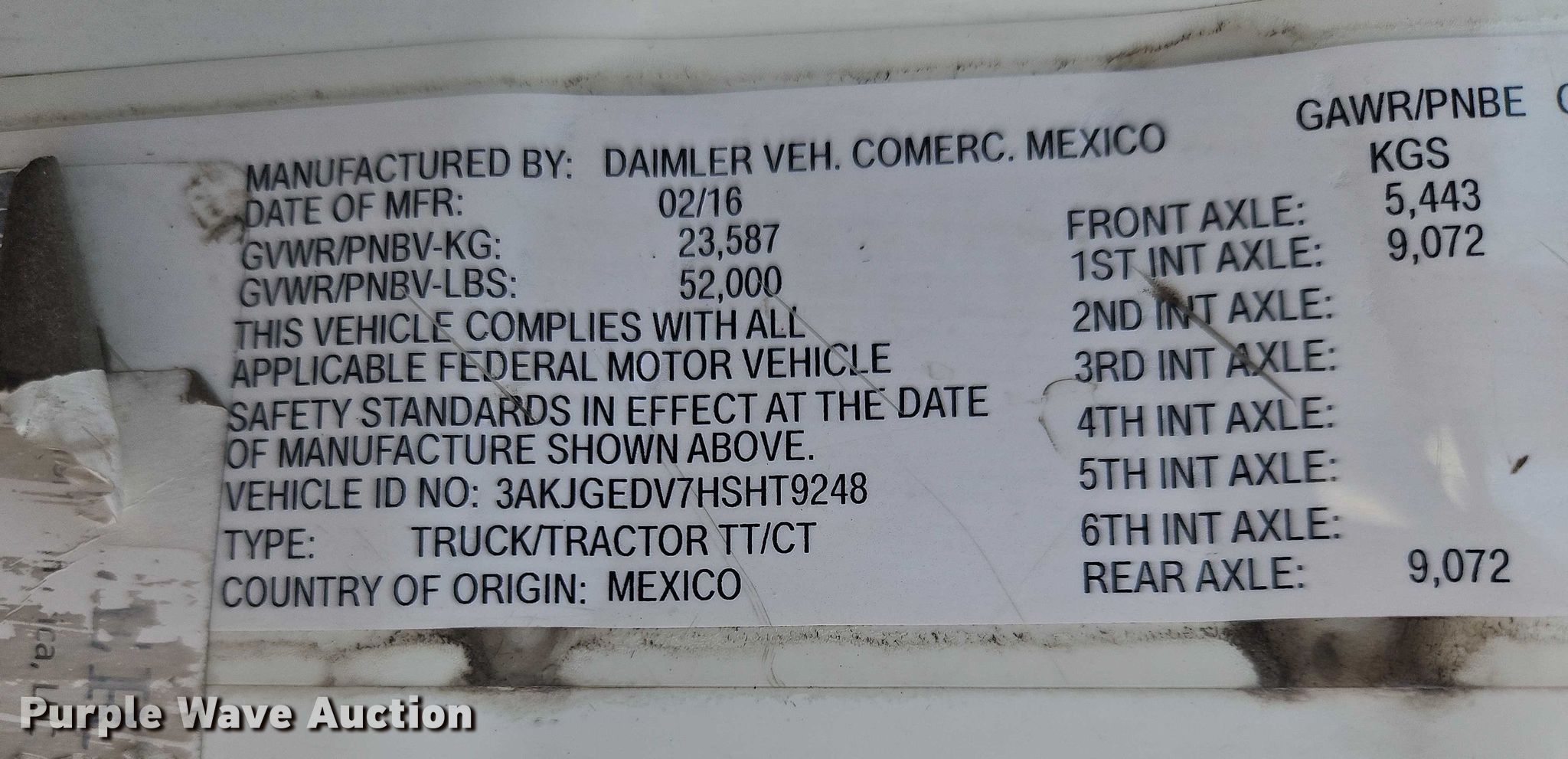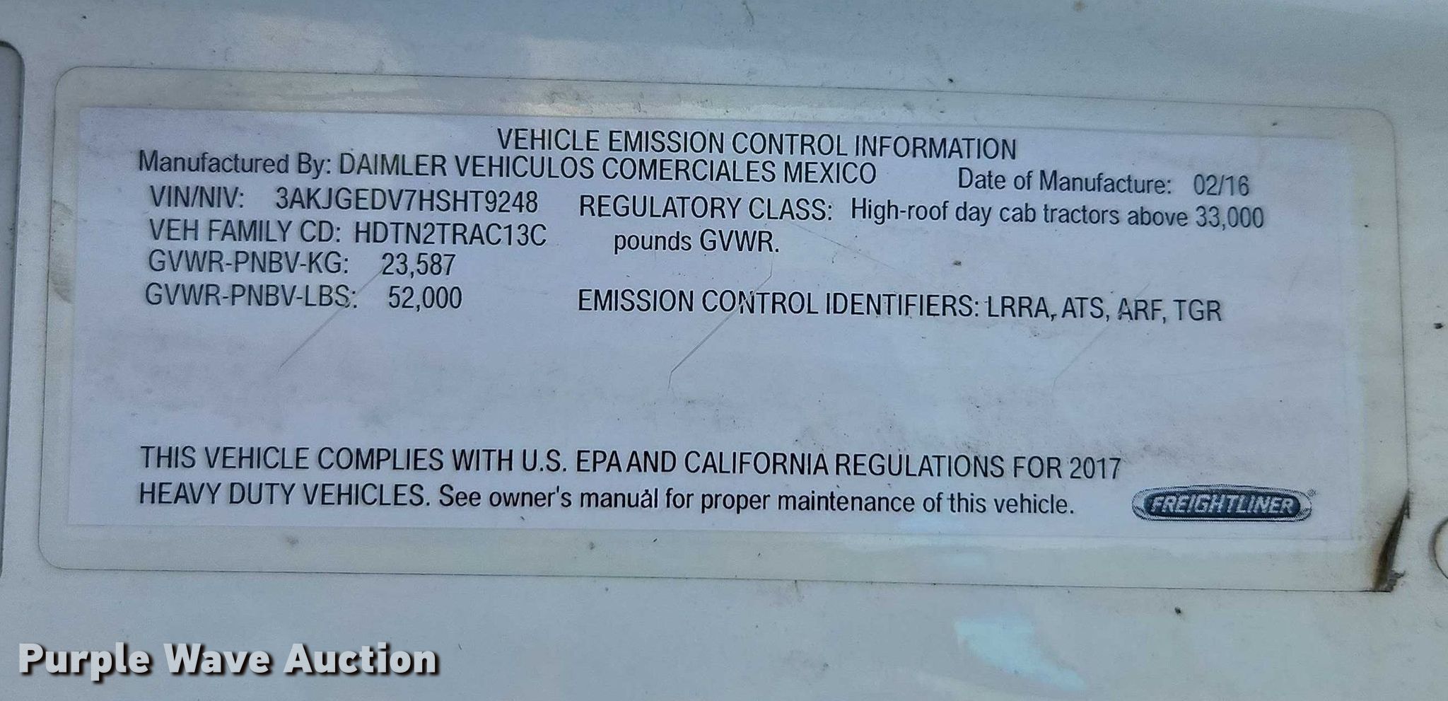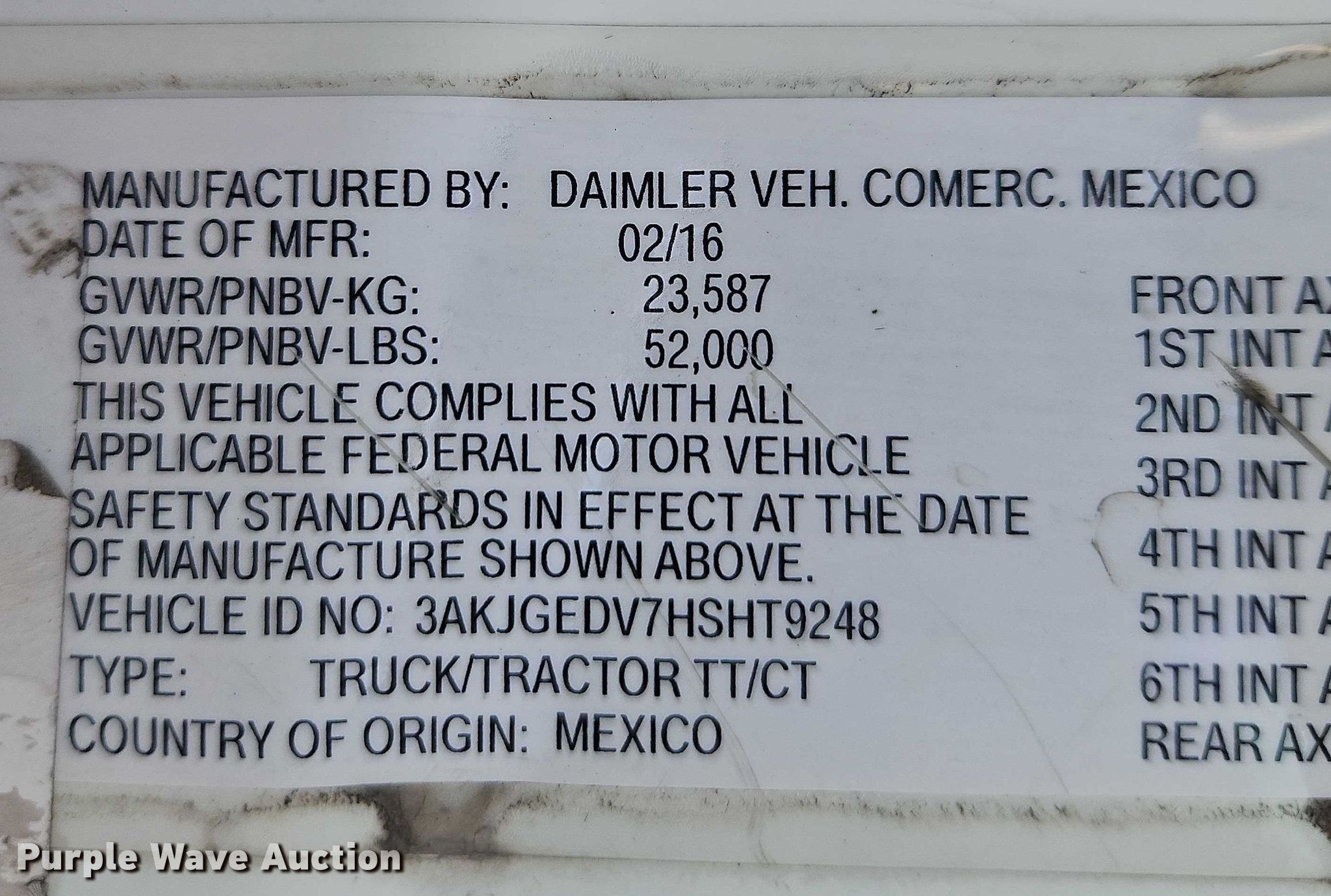 Purple Wave is selling a used Truck Tractor in Kansas. This item is a 2017 Freightliner Cascadia semi truck with the following: Miles: Unknown, VIN: 3AKJGEDV7HSHT9248