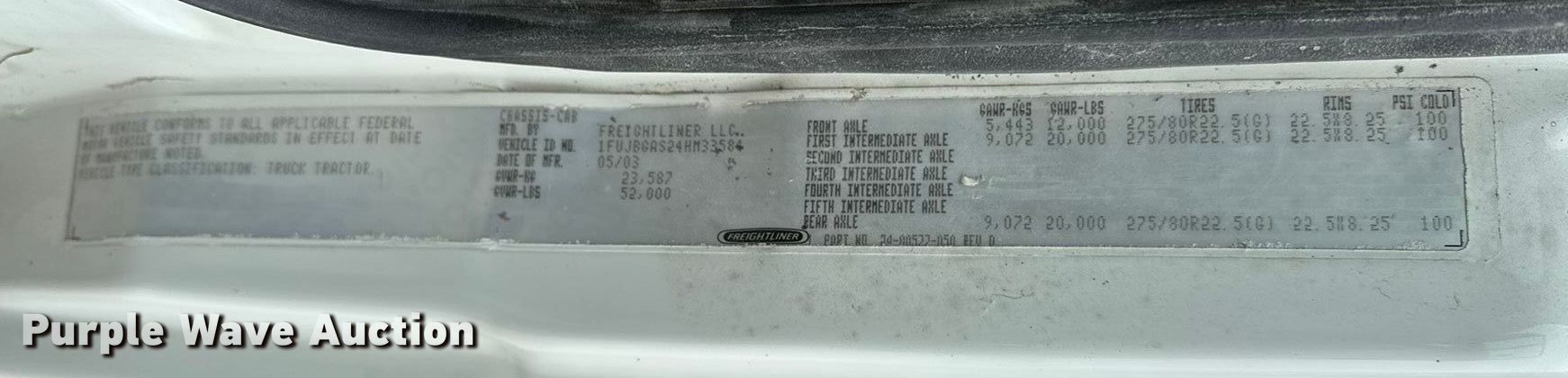 Purple Wave is selling a used Truck Tractor in Missouri. This item is a 2004 Freightliner FL112 semi truck with the following: Miles: 339,331 on odometer, VIN: 1FUJBGAS24HM33584