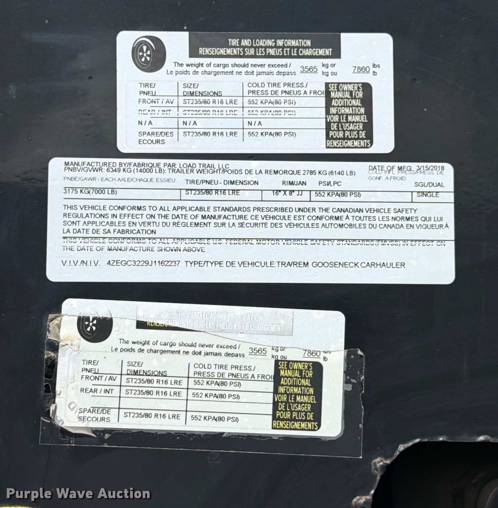 2018 Load Trail equipment trailer. VIN: 4ZEGC3229J1162237. Dimensions Overall Length: 41', Width: 102", Deck Length: 30', Width: 97", Deck height: 27", Tail length: 2', Ramps: Manual Length: 80". Features Deck type: Wood. Chassis Landing gear: Dual, Suspension: Spring, Brakes: Electric, Axles: Tandem, GVWR: 14,000 lbs, GAWR: 7,000 lbs. Tires Steel wheels, Size: 235/80R16. Texas title. Seller is a government entity who will be assigning and distributing the title. Please contact the seller for distribution questions. Comal County, TX. New Braunfels, TX 78130