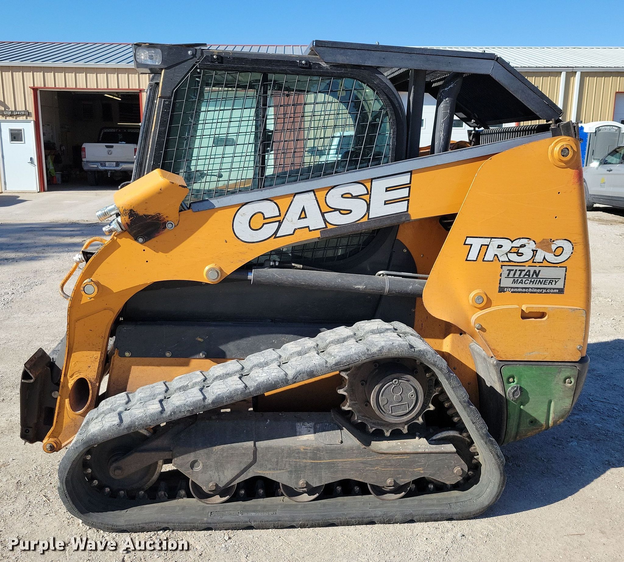 2018 Case TR310 tracked skid steer loader. Hours: 1,951 on meter, Serial: JAFTR310VJM449159. Engine Cylinders: 4, Fuel type: Diesel. Transmission Hydrostatic. Operators station Enclosed cab, AC, Heat, Bucket control: Hand, Pattern changer. Features Auxiliary hydraulics, Auxiliary electrical outlet, Quick coupler: Hydraulic, Counter weights. Tracks Width: 15.5". Notes Non-operational lights. Story County Conservation Board. Colo, IA 50056