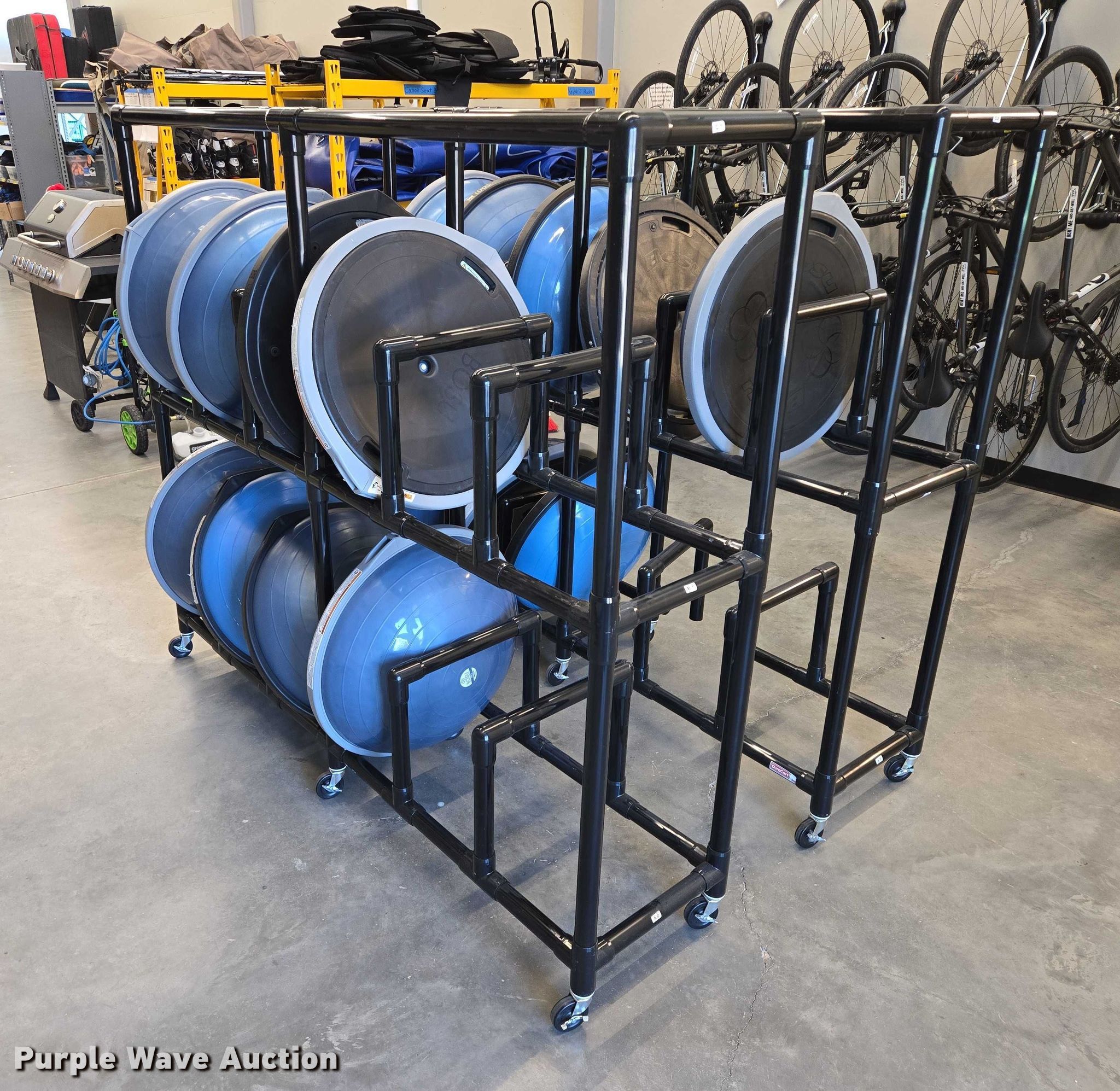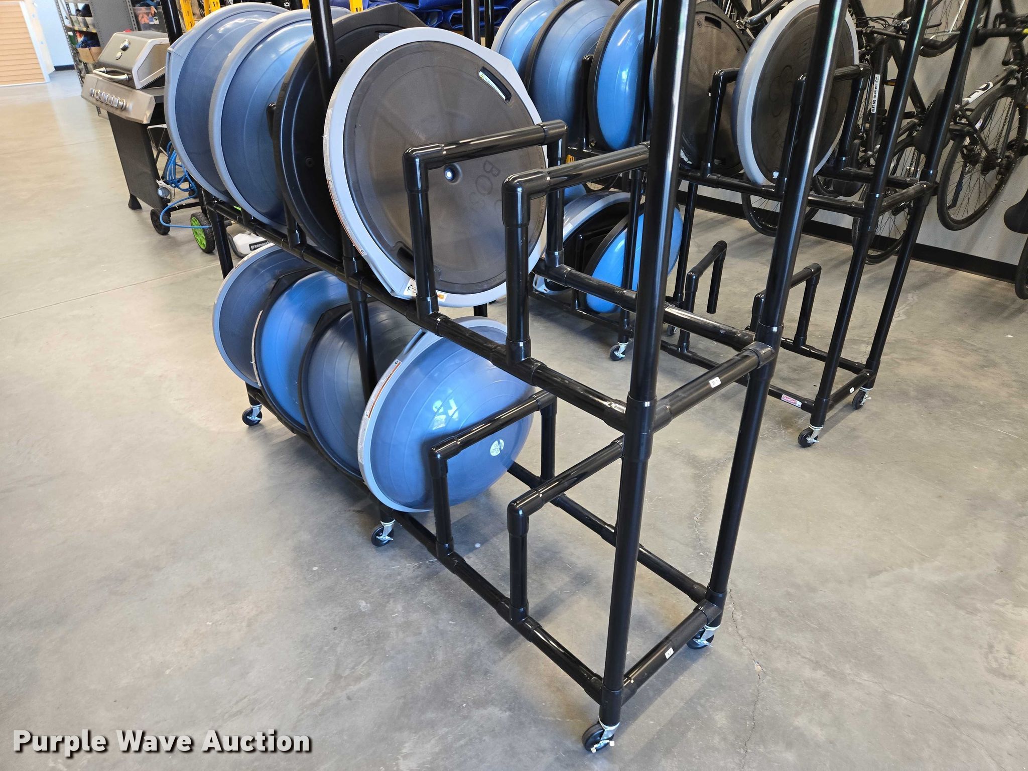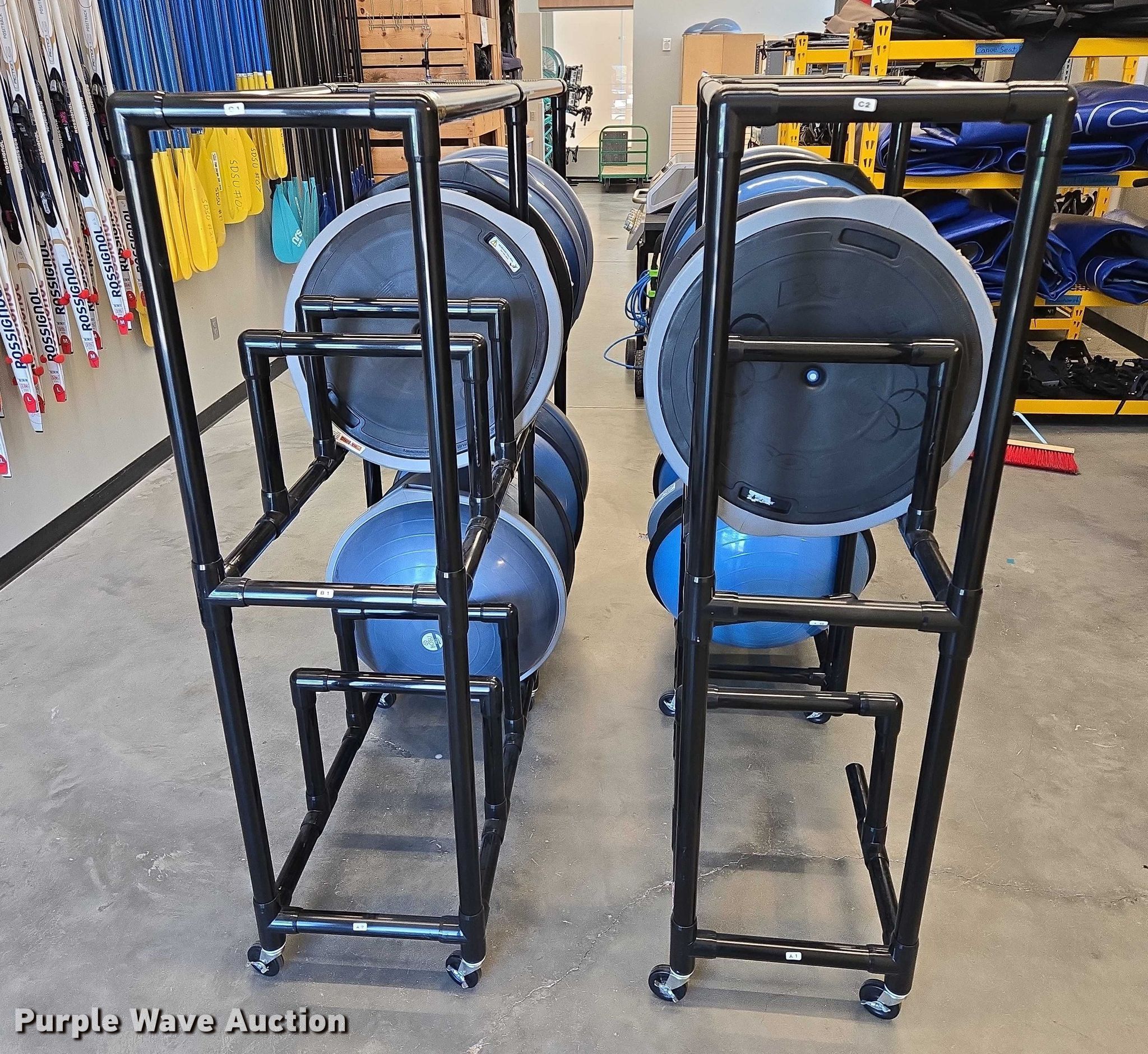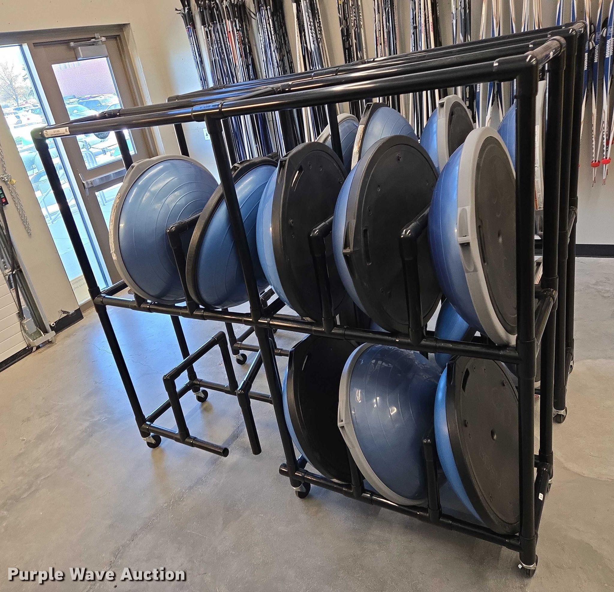 Purple Wave is selling a used Sporting Goods in South Dakota. This item is a (16) Bosu balance training balls with the following: (2) storage carts, One piece of PVC pipe needs replaced on one cart