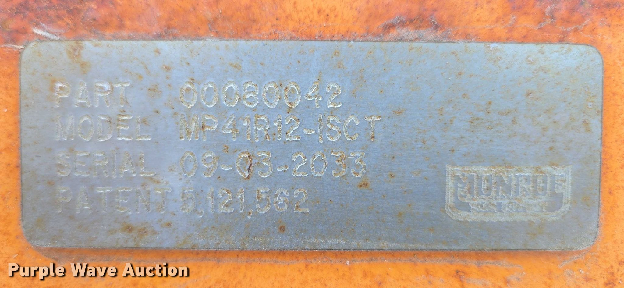Purple Wave is selling a used Automotive Parts or Acces. in South Dakota. This item is a Monroe MP41R12-ISCT snow plow with the following: Serial: 09-03-2033