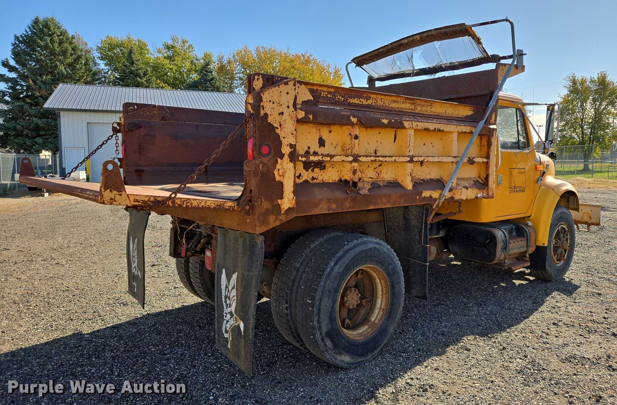 1999 International 4700 dump truck. Miles: 88,755 on odometer, Hours: 8,166 on meter, VIN: 1HTSCAAN8XH588549. Engine International DT466, Displacement: 7.64L, Cylinders: 6, Fuel type: Diesel. Transmission Automatic. Chassis Double frame, Axles: Single, Suspension: Spring, Brakes: Air, Front mount PTO, GVWR: 33,000 lbs. Interior Heat, Cruise control. Features Bed Dump bed, Length: 10', Width: 94", Side height: 30", Side board height: 6", Bed type: Steel, Roll tarp, Ram: Single, End gate: Manual. Tires Size: 11R22.5. Notes Rust damage, Front plow mount hydraulic issues, Windshield chipped or cracked, Jump start required during on-site data collection. South Dakota title. Title distribution may be delayed up to 14 days from verification of funds. City of Watertown, SD. Watertown, SD 57201
